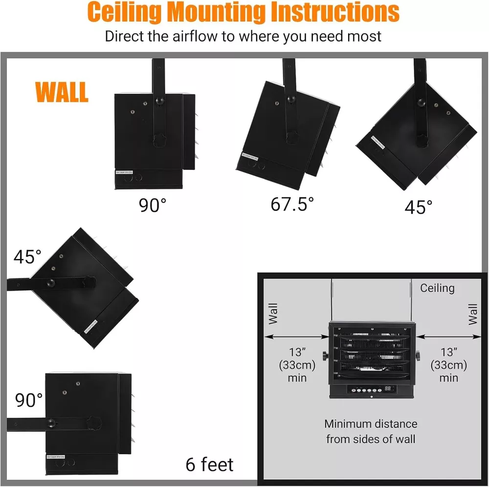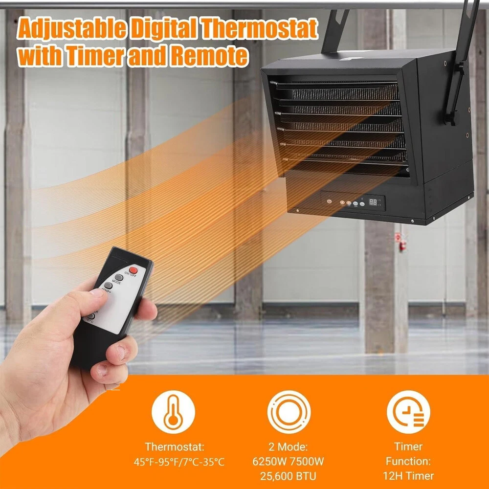 Specifications: Color:Black Form Factor:Cabinet Indoor/Outdoor Usage:Indoor Power Source:Hard-Wired Heating Method: Forced Air Heat Output:25600 British Thermal Units Material:Steel Power Range:6250/7500W Voltage:240V Area Covered:1250 sq. ft. Thermostat: 45-95°F/7-35°C Timer Function: 12H Timer Amperage: 31.3 Amps Features: Superior Heating Performance: This powerful 7500 W electric garage heater generates an impressive 25,600 BTUs; effectively warming spaces up to 1,250 sq. ft. with adjustable settings of 6,250 W and 7,500 W for tailored comfort Robust and Long-lasting Design: Built for demanding environments, this ceiling-mounted electric heater features a heavy-gauge steel construction and a dust-protected motor; this ensures reliable performance and an extended lifespan Precise Airflow Control: This hardwired garage shop heater features a louvered design with three adjustable mounting angles; easily direct airflow to specific areas while the fan-forced mechanism ensures consistent warmth throughout the space Thermostat & Overheat Protection: Equipped with an integrated thermostat, this electric garage heater allows for effortless temperature adjustments from 45 °F to 95 °F; an automatic shut-off function prevents overheating and ensures safe use Two Control Methods: Manage your heating effortlessly with the intuitive control panel and included remote for this adjustable electric heater; a built-in 12-hour timer helps you maintain warmth according to your schedule Payment Delivery Returns Feedback We accept Payoneer only. All major credit cards are accepted through secure payment processor PayPal. Payment must be received within 7 business days of auction closing. If you have bought multiple items from me, you can send me one payment for all the items instead of paying for them individually. When you click the Pay Now button, eBay will automatically determine if there are other items you have won or purchased from me and will combine them for your review. NOTE: Import duties, taxes and chargers are not included in the item price or shipping charges. These charges are the buyer's responsibility. Please check with your country's customs office to determine what these additional costs will be prior to bidding buying. 1. We will delivery out at the handing time when we receive the payment. 2. The delivery time is 3-5 business days to US by usually time.The parcel maybe delay 1-2day of the weekend.Due to the bad weather,Holidays,Hot Season ect.the parcel maybe delay,If you have any problems,mssage us,we will try our best to solve it. 3. We ship to your eBay address. Please make sure your eBay address is correct before you pay. 4. If you want to change the shipping address,message us before our send out. 5. We cannot deliver your order if your state is PR. 1. If you donot receive the items at the delivery time,the parcel has broken/missing,Please message us before you open case/return,we will try our best to solve it. 2. We offer a 30 day return policy from checkout winning date. 3. An RMA number is required for all returns. Message us for return instructions. Items Returned without a RMA number will not be processed. 4. Items defective upon receipt must be packaged in their retail packaging as if new and returned with a detailed description of the problem. 5. Return shipping fees are not refundable.We reserve the right to decline any returns if the above guidelines are not followed. If you are not satisfied with the item for any reason, please do not quick to leave negative/neutral feedback even open request and case without any communication with us. We devote ourselves making EVERY CUSTOMER in 100% Satisfactory and resolve any problem. Thank you for your understanding and recognition,we are always leave positive feedback to all our customers. About Reply: All replies will be sent to your email box, if you do not get response within 24 hours (Sat. & Sun. excluded) please check your eBay My Messages in case that our emails will be filtered automatically by your settings.