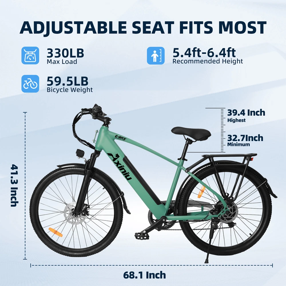 Motor Type: Rear Hub Motor Charger: 42V 2.0A, UL/CE certified, black, US standard Frame Number: No Frame Size: 26 in Maximum Range: Up to 40 mi(Assist Mode) Custom Bundle: No UPC: Does not apply waterproof line: 9-core main waterproof line MPN: EG-HL03-G Model: City Electric Bike Suspension Type: Rear Item Width: 18.90” Department: Unisex Adult Material: Aluminum Gear Change Mechanism: Derailleur Gears Item Weight: 61.7294334lbs Bike Type: E-City Bike Tire Type: Tires Item Height: 41.73" Max load: 330lbs Number of Speeds: 7 Speed Brand: Axiniu Country/Region of Manufacture: China EAN: Does not apply Safe standard: passed UL 2850 detection Item Length: 72.05" Features: Lights, Display, Fenders, Front Light,Removable Battery Charging Time: 4-6 hours Brake Type: Disc Brake - Mechanical Wheel Size: 26 in Model Year: 2024 gtin13: Does not apply Color: Black/Grey Maximum Speed: 25mph Custom-Built: No Voltage: 36 V Handlebar Type: Flat Bar Motor Power: 750W Manufacturer Warranty: 3 Years
