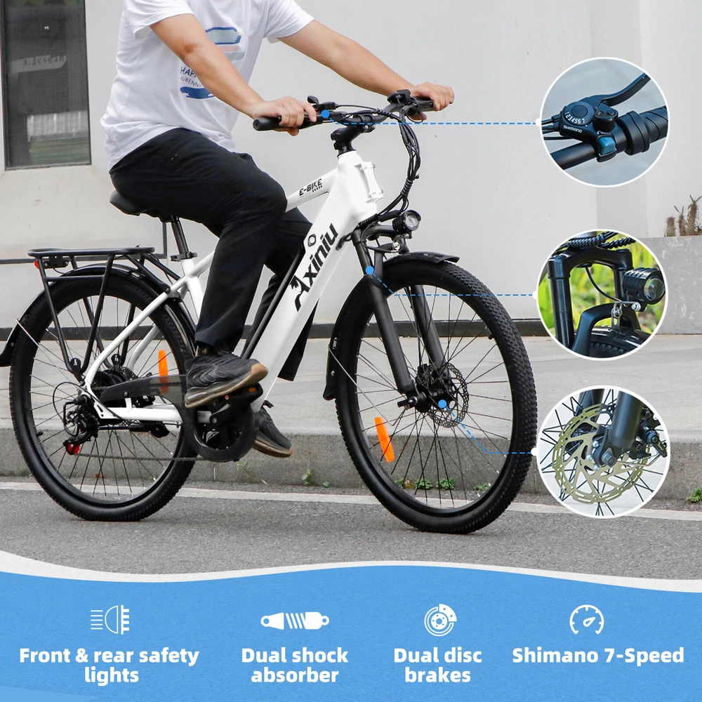 Item Height: 41.73" Manufacturer Warranty: 3 Years Maximum Range: Up to 40 mi(Assist Mode) Max load: 330lbs Maximum Speed: 25mph Motor Type: Rear Hub Motor Country/Region of Manufacture: China Suspension Type: Rear Features: Lights, Display, Fenders, Front Light,Removable Battery Material: Aluminum Safe standard: passed UL 2850 detection Color: White EAN: Does not apply UPC: Does not apply Charging Time: 4-6 hours Motor Power: 750W Model Year: 2024 Item Weight: 61.7294334lbs Wheel Size: 26 in Custom-Built: No waterproof line: 9-core main waterproof line Number of Speeds: 7 Speed Brand: Axiniu Charger: 42V 2.0A, UL/CE certified, black, US standard Tire Type: Tires Department: Unisex Adult Item Length: 72.05" gtin13: Does not apply Item Width: 18.90” Frame Size: 26 in MPN: EG-HL03-W Frame Number: No Voltage: 36 V Bike Type: E-City Bike Model: City Electric Bike Custom Bundle: No Handlebar Type: Flat Bar Brake Type: Disc Brake - Mechanical Gear Change Mechanism: Derailleur Gears