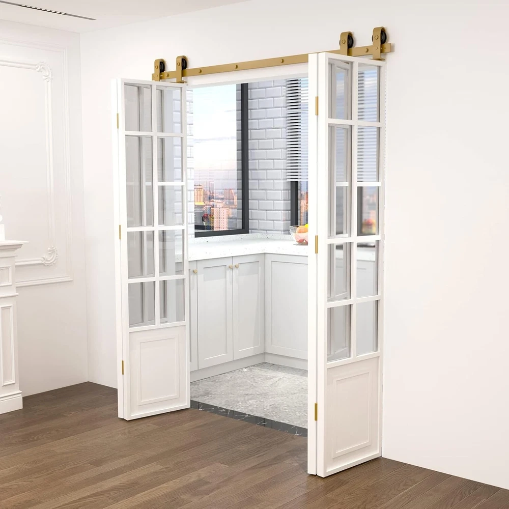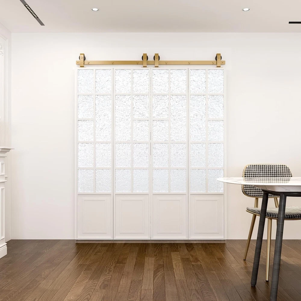 104RDHOUSE Bi-Folding Sliding Barn Door Hardware,Four Door Kit(PLEASE NOTE: DOORS NOT INCLUDED) If tou don’t have enough space to ensure the sliding of the door,this folding barn door hardware kit can fully meet tour needs for small space. Compared with traditional barn door hardware, bifolding door hardware is space saving and can be used in a variety of living situations, such as kitchen, study, etc. The unique folding design makes the door more convenient to store,the high-quality nylon pulley can make the pulley Glide on tie track like silk. Splicing track 75 5/8“track is 2pcs track combined together Yellow Full set hardware 2x adjustable roller 2x fixed rail 2 x strip seal 2 x bottom pivot plate 5 x rail spacer 6 x door hinge All necessary parts are included only hardware.no.doors Splicing track 75 5/8“track is 2pcs track combined together White Full set hardware 2x adjustable roller 2x fixed rail 2 x strip seal 2 x bottom pivot plate 5 x rail spacer 6 x door hinge All necessary parts are included only hardware.no.doors Technical Details Track's length | Fully opened door openning's length