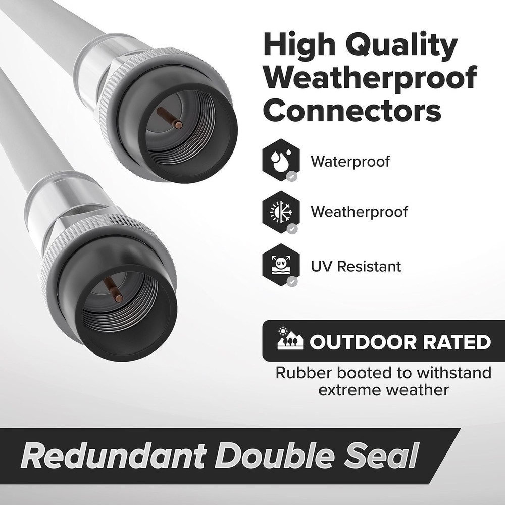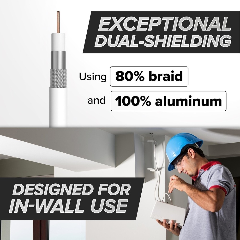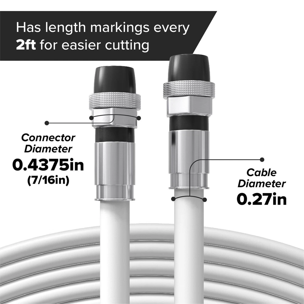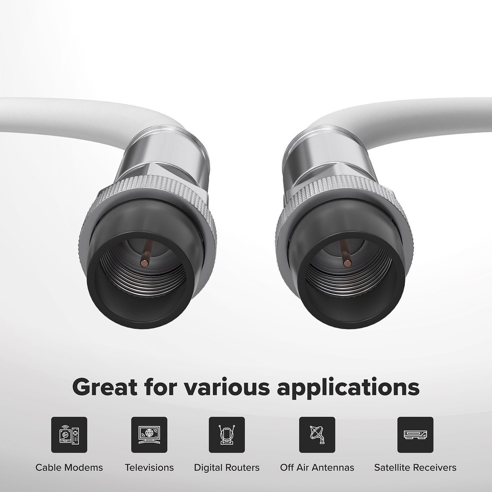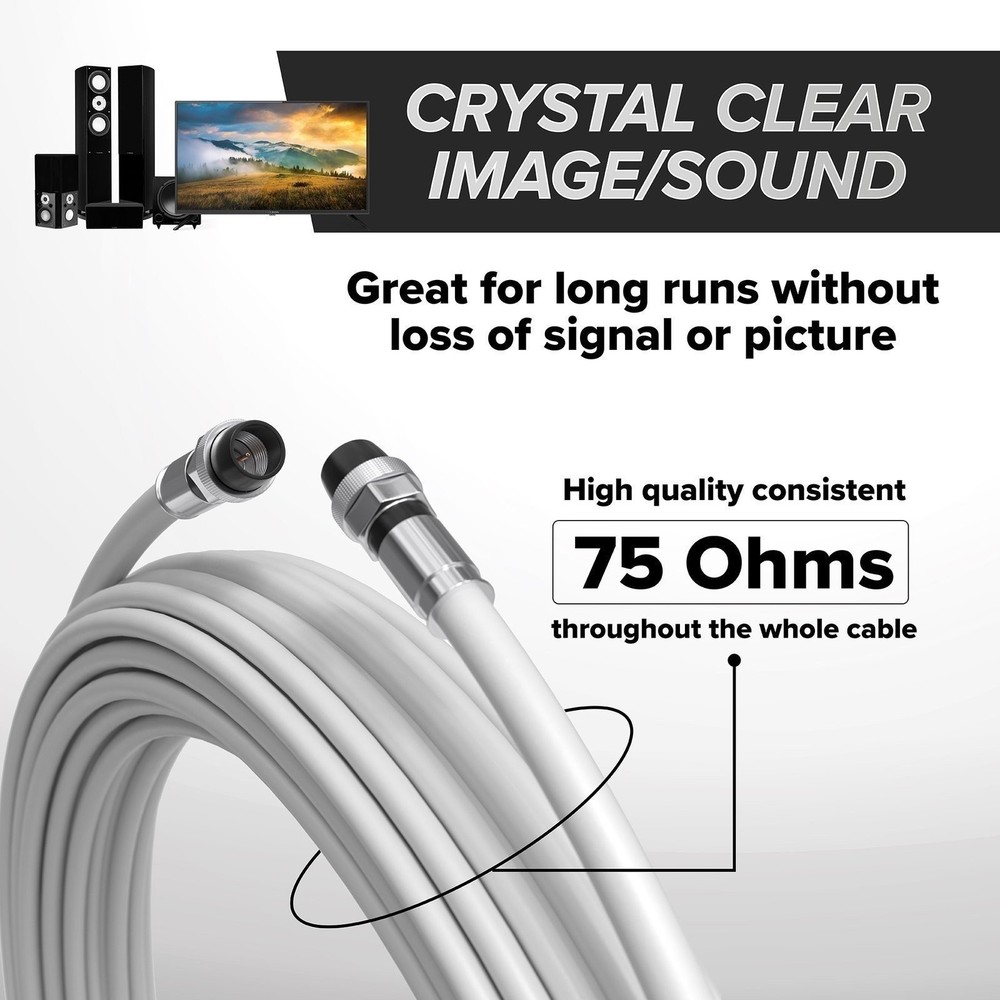 Includes: 1 one coaxial Cable with f-pin connectors & US manufacturers warranty for quality assurance Tested and approved for the use with Cable Modems, Televisions, Satellite Receivers, Off Air Antennas - including HD Antennas; Compatible with: DIRECTV, Dish Network, Comcast, Charter, Verizon FiOS, AT&T, U-Verse, FTA, OTA, HughesNet, Wild Blue, Excede, Cell phone wireless extenders, and many other services and providers. Low loss Cable for exceptional signal and picture quality, even over long runs. Works great indoors and outdoors, with a highly durable weather proof and UV resistant PVC outer jacket. High quality consistent 75 Ohms throughout the whole cable. High quality, weather proof, outdoor rated connectors will not pull off, break, lose signal, or come lose and are water proof using a redundant double seal at each end of the connector. Each Connector has an attached rubber weather boot to ensure there is never any moisture inside the connector. High frequency range with an 18 AWG center conductor to cover almost all services and providers that range from at least 2.3MHz to 3.0GHz, with exceptional shielding - using 80% braid and 100% shield. Technical Specifications: Cable End #1: Coaxial F Pin Male Cable End #2: Coaxial F Pin Male Cable Length: 75 Feet Cable Length: 900 Inches Cable Length: 23 Meters Cable Length: 25 Yards Cable Shape: Round Cable Capacitance: 16.2 Farad Center Conductor Gauge: 18 AWG Center Conductor: Copper-Clad Steel Coaxial Frequency Range: 2.3 MHz - 3.0 GHz Coaxial Size: 0.25 (1/4) Inch Coaxial Size: RG6 Color: White Connection Split/Duplication: One to One (1:1) DC Resistance: 6.54 Ohm Full Cable Length: 75 Feet (23 Meter) Impedance: 75 Ohms Jacket Material: PVC Maximum Frequency: 3.0 GHz Output Voltage: 60 V Shielding Material: Aluminum Magnesium Alloy Temperature Range (C): -40 to 75 C Temperature Range (F): -40 to 167 F Type: Coaxial F Male-Male UV Protected: Yes THE CIMPLE CO, A Family Company located in the USA, is proud to manufacture this high quality and durable coaxial cable. This cable is available in Black and White, and comes in lengths from 1 foot to 200 feet (including our most popular lengths of 10 feet, 25 feet, 50 feet, 75 feet, and 100 feet). The center conductor is made of high grade copper coated steel that has been swept to 3.0GHz, making this a great application for Satellite, Cable, Wireless (including cell services), and Communication uses. With very low signal attenuation (2.75dB at 750MHz for our 50ft cable) it can be used on long runs without the loss of signal or picture. We use high grade 360 degree weather proof compression connectors to ensure that this cable remains water and weather proof, without the loss of any signal. This ensures that the ends can withstand pulling, weather, extreme hot and cold (rated up to 167 degrees F). The coaxial shielding is 80% aluminum magnesium alloy braid and 100% solid aluminum foil (including an 18% overlap) to ensure that there is no interference from neighboring or rouge signals. The outer jacket is a flexible UV resistant PVC and has been tested to be used in many extreme conditions for use both inside and outside. The dielectric center is made from gas injected foam PE and has an almost perfect consistency of 75 Ohms +/-3 throughout the entire length of the coax cable. The outside diameter of the cable is 0.27 inches, about 6.85 mm, with the connectors being slightly larger at .4375 (7/16) of an inch (11.11 mm). The cable also has length markings every two feet on the side to make it easier to cut to length, if you need a shorter wire. We also offer a repair and splice kit for those who would like to cut and reinstall the ends on the wire. The kit comes complete with instructions and free technical support. We back our product 100%, with free returns, as well as free technical and customer support.