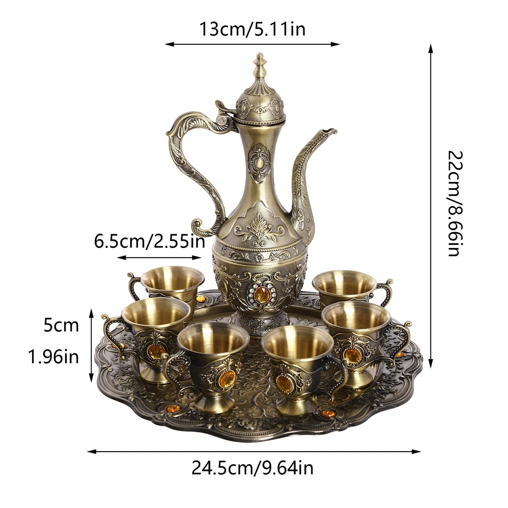 7.5oz Tea Set Teapot & Six Teacups Set with Tray for Serving Coffee, Wine Tea 7.44oz Teapot & Six Teacups Vintage Tea Set for Serving Tea , Coffee, Wine, Application This Product Is Suitable for Serving Tea, Coffee, Wine, Cappuccino, Milk Tea, Whiskey, Brandy, and Mixed Cocktails. Specification Color: Bronze+ Yellow Material: Zinc Alloy, Plastic Process: Electroplating Style: Vintage Assembly Required: No Mounting Type: Tabletop Teapot Capacity: 220ml/ 7.44oz Each Teacup Capacity: 15ml/ 0.5oz Teapot Size(W*H): 13*22cm/5.12*8.66in Each Teacup Size(W*H): 6.5*5cm/2.56*1.97in Tea Tray Diameter: 24.5cm/9.65in Package Size: 27*26*9cm/10.63*10.24*3.54in Gross Weight: 2.2kg/4.85lbs Net Weight: 2kg/4.41lbs Package Included 1* Teapot 6* Teacups 1* Tea Tray Description If You Are a Tea Enthusiast, Then Our Tea Set Can Be an Ideal Choice for You. Our Tea Set Is Made of High-quality Materials That Are Solid and Durable. the Vintage Beautiful Carvings Show Generosity and Luxury. the Complete Set Fully Meets Your Tea-tasting Needs. It Is Not Only Practical but Also a Beautiful Home Decoration or Collection. Key Features Made to Last: This Product Is Made of High-quality Zinc Alloy Material, Treated with an Electroplating Process, Solid and Durable, Drop and Wear-resistant , and Not Easy to Fade and Deform. Complete Set: This Set Includes 6 Teacups, 1 Teapot, and 1 Tea Tray, Which Can Fully Satisfy Your Tea-tasting Needs, You Don't Need to Buy Them Separately. Exquisite Appearance: with Delicate Relief Patterns and Yellow Diamond-like Embellishments, This Product Is Vintage and Elegant, Showing the Palace-like Luxury and Making It an Ideal Collection. Special Decoration: It Can Be Used to Decorate Your Tea Set, Coffee Table, or Dining Table to Enhance Your Taste. When You Are Having a Drink, Tea, or Coffee with Your Friends and Guests, This Teapot Set Can Attract the Attention of Your Guests and Become the Center of Discussion. Large Capacity: the 7.44oz Teapot Capacity and Six Teacups(Each 0.5oz) Will Satisfy You and Your Family's Tea-sipping Needs at Once. Assembly-free : This Product Does Not Require Any Assembly, so You Can Use It After Cleaning It, Saving You Time and Labor. Effortless Cleaning: It Has a Simple Structure, so You Only Need to Wipe the Dust or Residue with a Towel or Rinse It with Water. Ideal Gift: with Good Performance and an Exquisite Appearance, It Can Be Used As an Ideal Gift for Newlyweds, Moving into a New House, Father's Day, Birthday, Thanksgiving, Etc. Good Customer Service: We Aim to Provide Quality Products and Services. If You Have Problems, Please Feel Free to Contact Us. We Will Reply and Solve the Problem for You As Soon As Possible. Details Practical Handles: the Teapot and Teacups Come with a Handle Design That Makes It Easy for You to Hold and Use. Tea Tray: This Design Is Convenient for You to Organize and Arrange Teapots and Teacups, Which Are Not Only Beautiful but Also Do Not Take up Much Space. Semi-revealing Teapot Lid: This Design Facilitates You to Add Tea and Also Protects the Cleanliness of the Tea. Notes Please Confirm That the Size Meets Your Needs Before Ordering. Please Note That This Tea Set Is Not Dishwasher Safe. Please Allow the Slight Color Difference Caused by the Shooting Light and 1-3cm Error Due to Manual Measurement, and Make Sure You Do Not Mind Before Ordering. tu1 Payment Delivery details Terms of sales About us Contact us Payment We accept ebay payment 。 Fees such as import duties, taxes are not included in the item price or shipping costs. These charges are the buyer's responsibility. Delivery details Shipping: 2-9 working days to: USA Terms of sales We maintain high standards of excellence and strive for hundred percent customer satisfaction. Feedback is very important to us. We hope that you contact us immediately before you give neutral or negative feedback, so that we can address your concerns. It is impossible to address issues if we do not know about them! About us Your satis faction is our ultimate goal. We work hard to earn your trust and future business. Our certified technicians have tested each item before shipping. The unit comes with 1 year limited warranty on all manufacturing defects. a) If you receive a defective item, you may return it or ask for a discount. Please contact us within 14 days after you receive the package. b) What you returned must be intact and in its original packaging as re? u. Customer is responsible for shipping costs of the returned item. c) We will cover the cost of shipping back t with the shipping rate indicated in the registration page. We will send you a new unit or refund the full payment you paid. Thank you. Contact us Business Hour Business Hour: Monday To Friday: 8:30 AM to 5:00 PM (Beijing China time) Due to time zones, our reply to your questions may not be immediately. But within above working time, we will reply your email within 24 hours. If it's non-workdays, please kindly be patient and wait till Monday. Please contact us with ebay message. Please feel free to contact us if you have any questions. Monday To Friday: 8:30 AM to 5:00 PM (Beijing China time) Due to time zones, our reply to your questions may not be immediately. But within above working time, we will reply your email within 24 hours. If it's non-workdays, please kindly be patient and wait till Monday. Please contact us with ebay message. Please feel free to contact us if you have any questions. Brand Unbranded Type Tea Set Color Bronze+Yellow Material Zinc Alloy, Plastic Style Vintage Number of Cups 6 Capacity 7.44 oz Features Tray EAN Does not apply UPC Does not apply ISBN Does not apply On Dec 16, 2024 at 21:28:08 PST, seller added the following information: