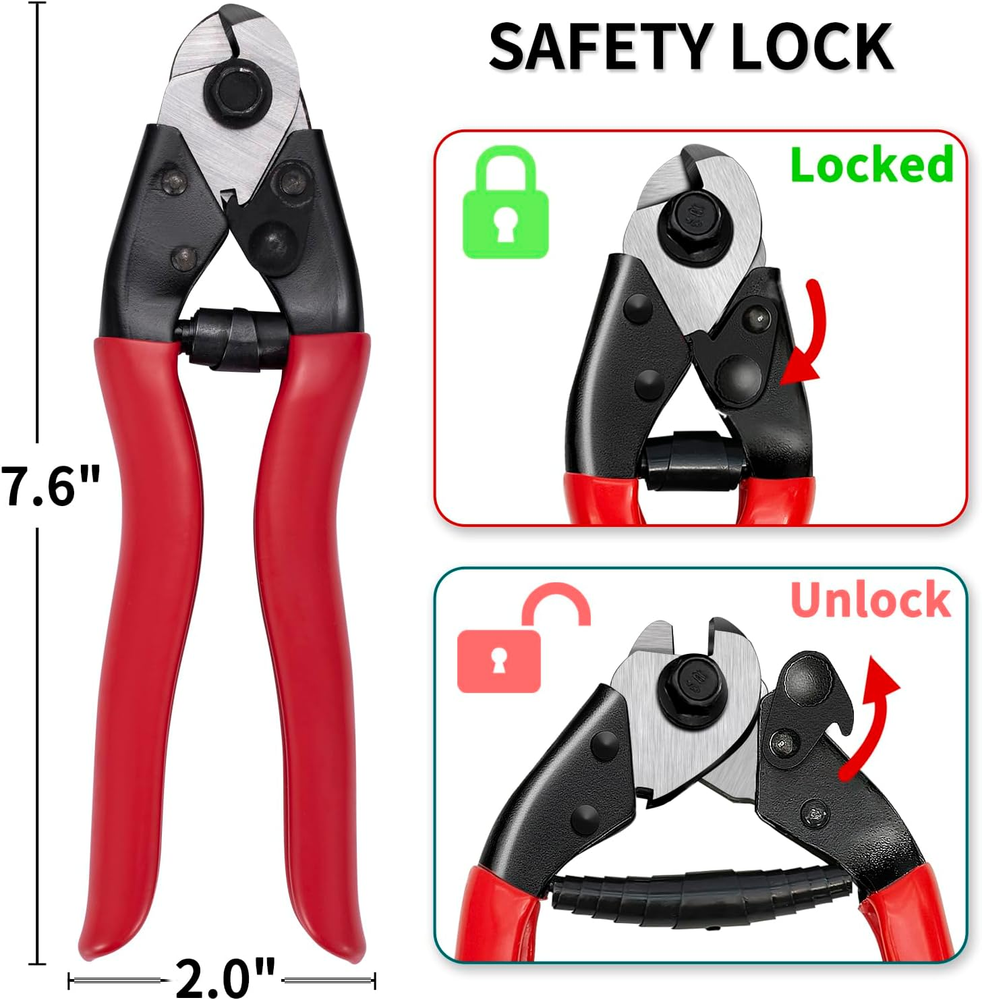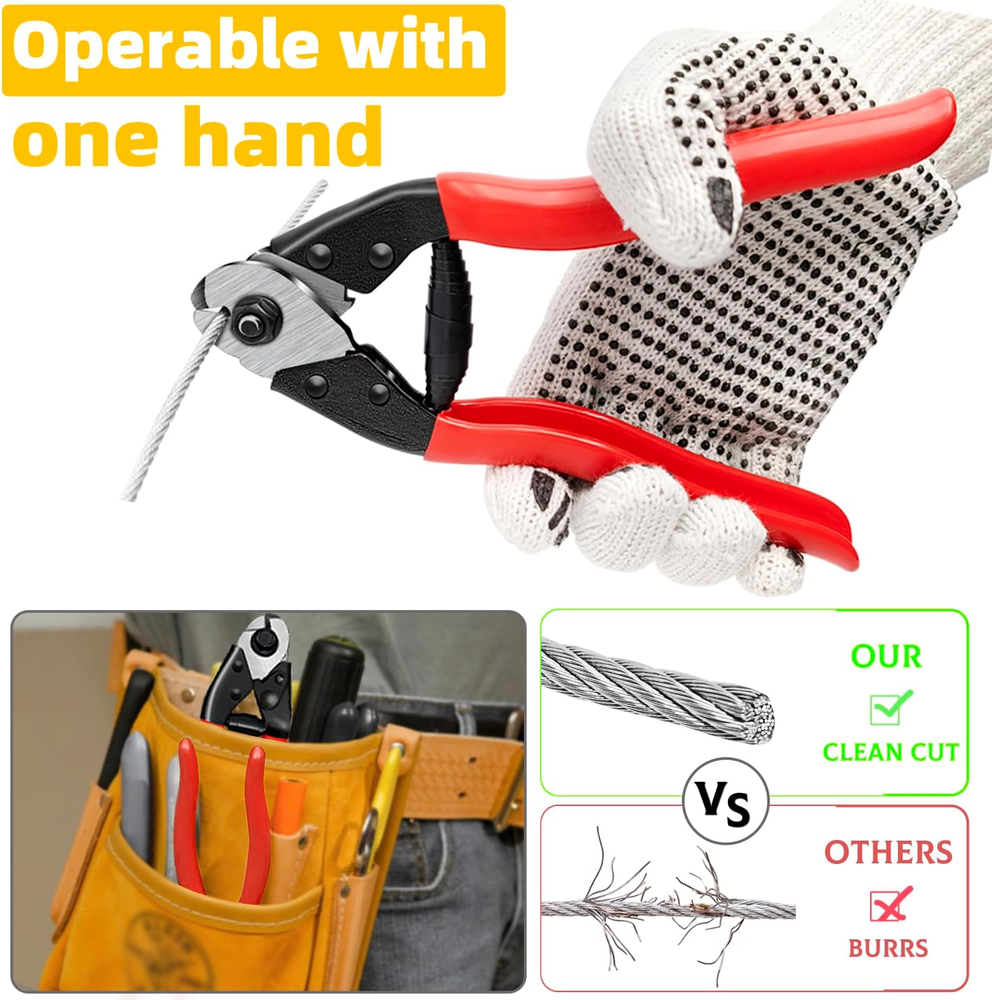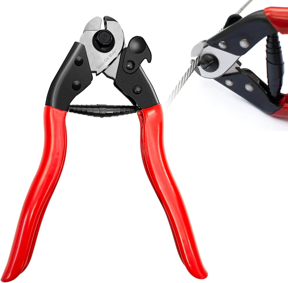 【Well-made Heavy Duty Wire Cutter】 The cable cutter is excellent at cutting all kinds of wire rope, stainless steel cable, aluminum wire, fences, aircraft, bike cable, electrical cable, guitar strings, and garage door cables,baling wire, aircraft cable. It can be used widely. It cuts like BUTTER, you can find 1/8” stainless steel wire cable by search DW11. 【Sharp & Clean Cut】The blade is made of manganese steel and hardened by induction quenching. It is very sharp and durable. The steel cable cutter make precise and clean cuts, not fraying and smashing cable ends. 【Easy to Use】First, turn the black lock to open, put the cable into the middle of the blade, then press the handle to cut it. It can one hand operation. The safety lock protects you from accidentally opening it and causing injury. 【Max Cuting Capacity】Up to 5/32" Steel Wire Rope, 3/16" Hard Steel Wire, 3/16" Aircraft Cable, 15/64" Copper & Aluminum Cable, 1/4" Soft Wire Rope. 【After-Sales】If you have any issue, please feel free to . Note, there is coating of lube or grease for rust protection in the cutter head, you can easily wipe off with a paper towel. Product Description Blades are ultra sharp, perfect for Cut all kinds of wire rope, stainless steel cable, aluminum wire, fences, aircraft, bike brakes cables, electrical cable, motorcycle cables, and garage door cables, baling wire, aircraft cable. Maximum cutting cable diameter: 5/32" Steel Wire Rope 3/16" Hard Steel cable 3/16" Aircraft Cable 15/64" Aluminum Cable 1/4" Soft Wire Rope Steel cable cutter, Cuts like BUTTER, the following comments are from Verified Purchase Customers' reviews Cuts cleanly and effortlessly through everything with the small precision jaws. This wire cutter leaves a nice, clean cut, no jagged edge like other cheaper ones do that also require much more effort. The rubber grips are smooth, made from 1/16" thick folded metal and coated by a 1/32" red rubber, and the tapered grips make it easier to handle for small hands The safety lock works smoothly, and securely holds closed until it is physically open, protects you from accidentally opening it avoid injury Heavy duty cutter for all kinds of rope cables Stainless Steel Cable Cutter Cut up to 5/32" Steel Wire Rope, 3/16" Hard Stainless Steel Wire, fishing cable Fence Cutter Cut up to 5/32" Fence cable,baling wire,garage door cable bike cable Aircraft Cable Cutter Cut up to 3/16" Aircraft Cable 1/4" Soft Wire Rope Copper & Aluminum Cable Cutter Cut up to 15/64" Copper & Aluminum Cable, electrical cable Steel DN Mate Cable Railing System- Clean look, Durable Level cable railing system Clean look We have a complete range of railing system accessories for your project. Stairway angle stair balustrade system Whether indoor or outdoor, residential or commercial, our railing kits never get rusty, always provide stylish and modern decoration for railing projects. Angle protector sleeve is recommended for Work with Swage lag screw in the end posts Steel DN Mate 1/8" swage lag screw DM30 is recommended to work with these stainless protectors, this combines the most cost-effective railing project. You could install this cable railing hardware on stairs, balconies and decking areas. It is widely used for indoor or outdoor. Hardware Options For the above cost-effective Level and Stair cable railing system, material required Swage lag screw DM30 (terminal fitting) 1/8" cable with cutter DW22 Hydraulic Crimper DC01----to swage the cable to tube Level protector sleeve DE05 ---install in the middle posts Angle protector sleeve DT05--install in the middle posts ( angle stair balustrade required) Drill jig DG12, help drilling the correct angle, speed up the job Glass railings and traditional fences require a lot of time to wipe to maintain clean appearance. In contrast, the cable railing system requires nearly no maintenance. Scroll down this page to get them from Steel DN Mate FAQ: Install in the intermidiate posts, staight/level lines The maximum distance between two end posts is 16 Feet. That the post spacing between two posts max 4 feet The cable spacing between the 2 cable runs (upper and lower ) is 3" Note: Some states may have special regulations, check with your local administration for building codes.