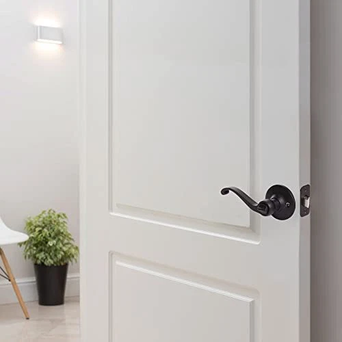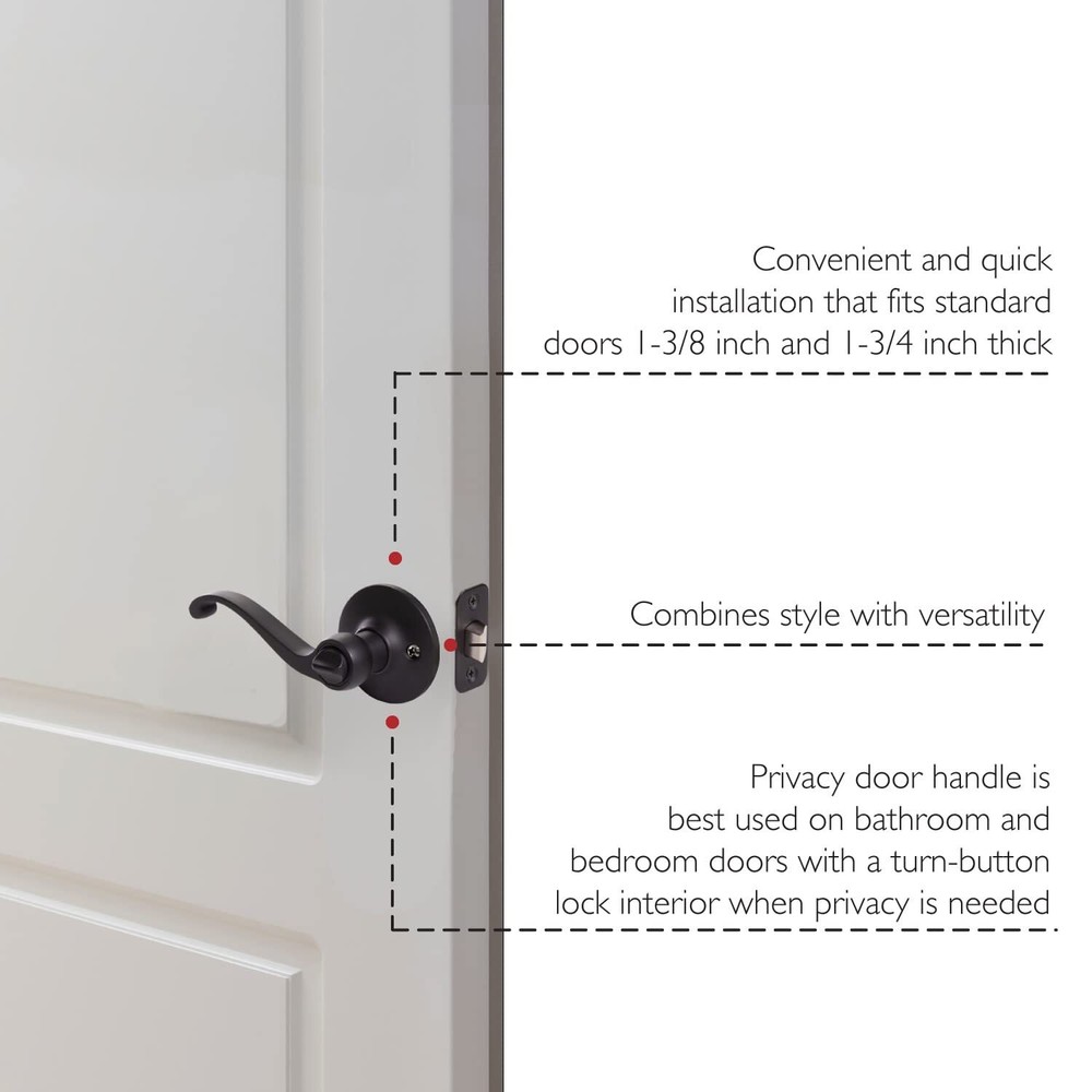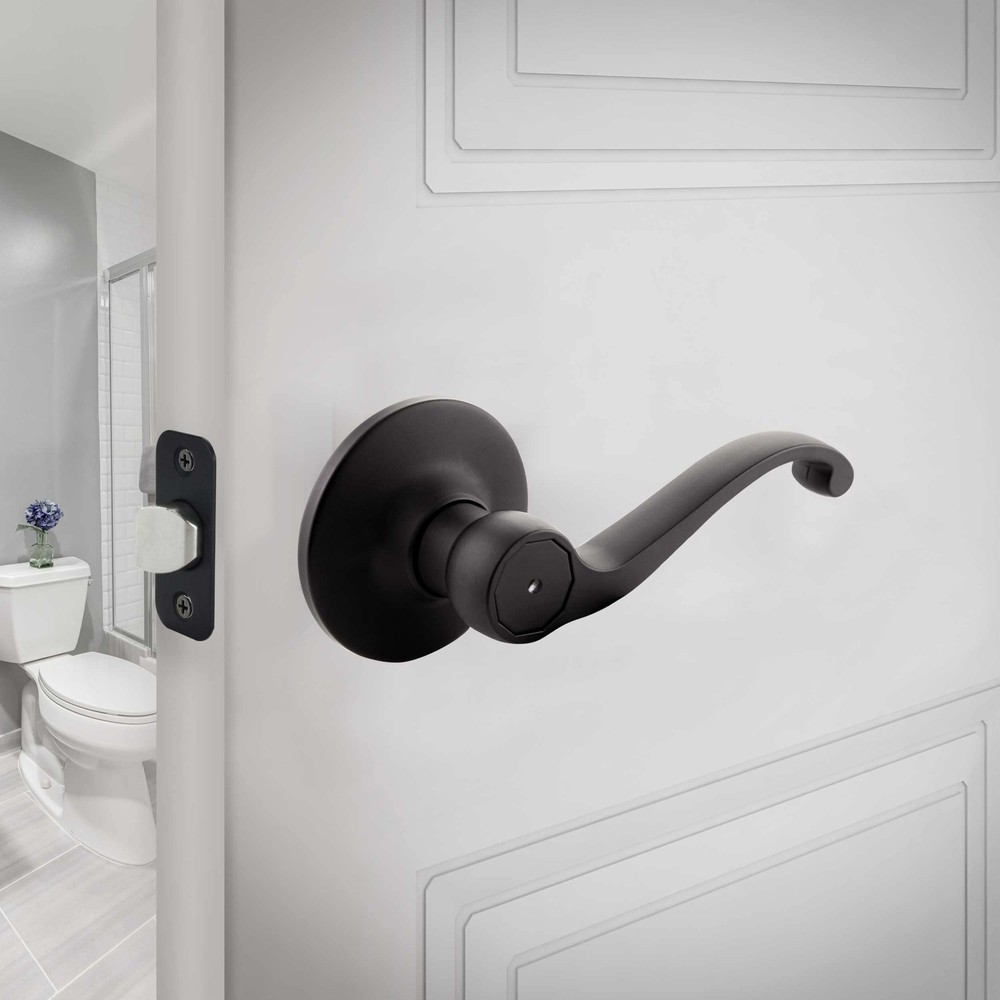 The 779223 Scroll Privacy Door Lever is perfect for bathroom and bedroom doors that require locking. With privacy in mind, this door lever locks from the inside with a turn-button and does not include keyed cylinders. A scroll lever shape and matte black finish make this door lever versatile in style and design. The 2-way latch door lever is reversible for left or right-hand doors. This locking door lever fits the most common backsets in the U.S. (2-3/4 inches and 2-3/8 inches). The durable 1/2-inch latch bolt is plated in nickel and does not budge once in place. Use this doorknob on standard 1-3/8-inch and 1-3/4-inch thick doors. This product has a 1-inch by 2-1/4 inches radius corner faceplate. If you are preparing your door for installation, the cross bore should be 2-1/8 inches in diameter, and the edge bore should be 1-inch in diameter. This latching door lever is ANSI -3 certified and for residential . By installing the Scroll Privacy Lockset in your home, you gain a sense of and comfort. Designed and manufactured by , the trusted source for quality lighting, hardware, plumbing, kitchen, and bath products for every taste and budget. Fully Reversible: Versatile privacy door lever is with both left-handed and right-handed doors; fits standard doors 1-3/8 inch and 1-3/4 inch thick Matte Black Finish: This durable door knob combines style with versatility and coordinates effortlessly with modern, rustic, and industrial farmhouse styles alike Privacy Door Handle: Perfect for bathroom or bedroom doors and features a turn-button lock interior when privacy is needed Adjustable Latch: 2-Way latch adjusts to fit the most common backsets in the U.S. (2-3/4-inch and 2-3/8-inch) Convenient and Easy Installation: Includes faceplate, mounting hardware, and instructions for -tool installation