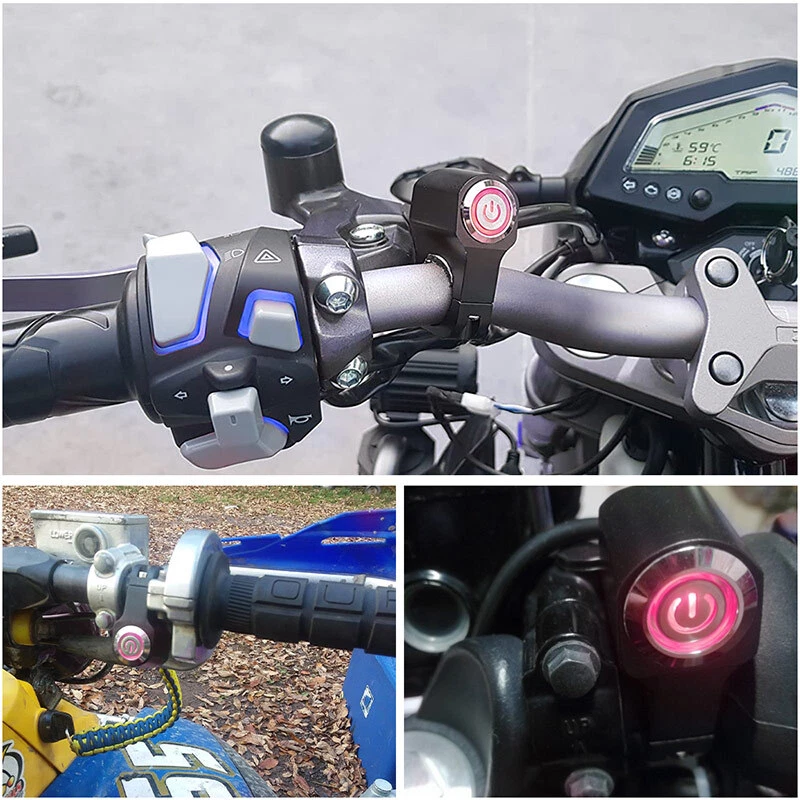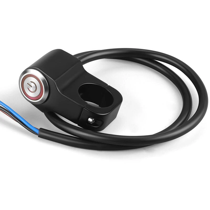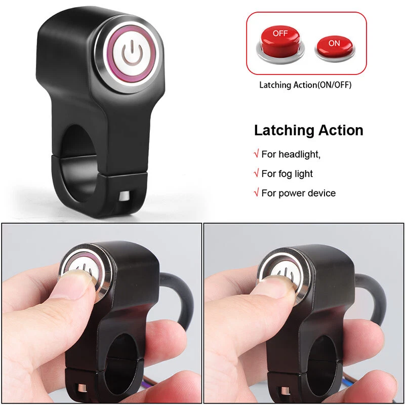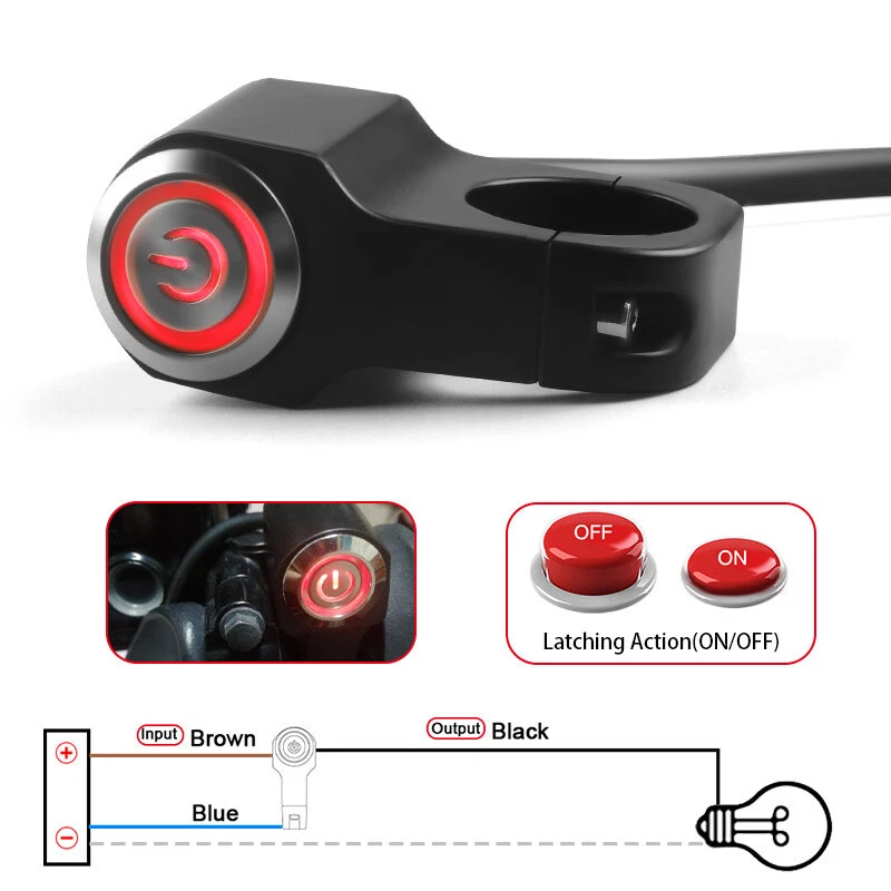 Product Description Application: Suitable for Motorcycle Motorbike ATV Sport Dirt Electric Bike Button action: ON OFF Switch (Latching action), can be use for general lights, hazard light, fog light, spotlight, head light, work light, and power outlet for mobile devices Suitable handlebar diameter: 22mm (7/8") Material:aluminium Switch Size: as picture shows Voltage:12V Current:10A Wire:3lines Wiring: Blue negative(-) brown input(+) Black output (+) (connection lamp) Light Color :Red Package including: 1 x Switch About Us