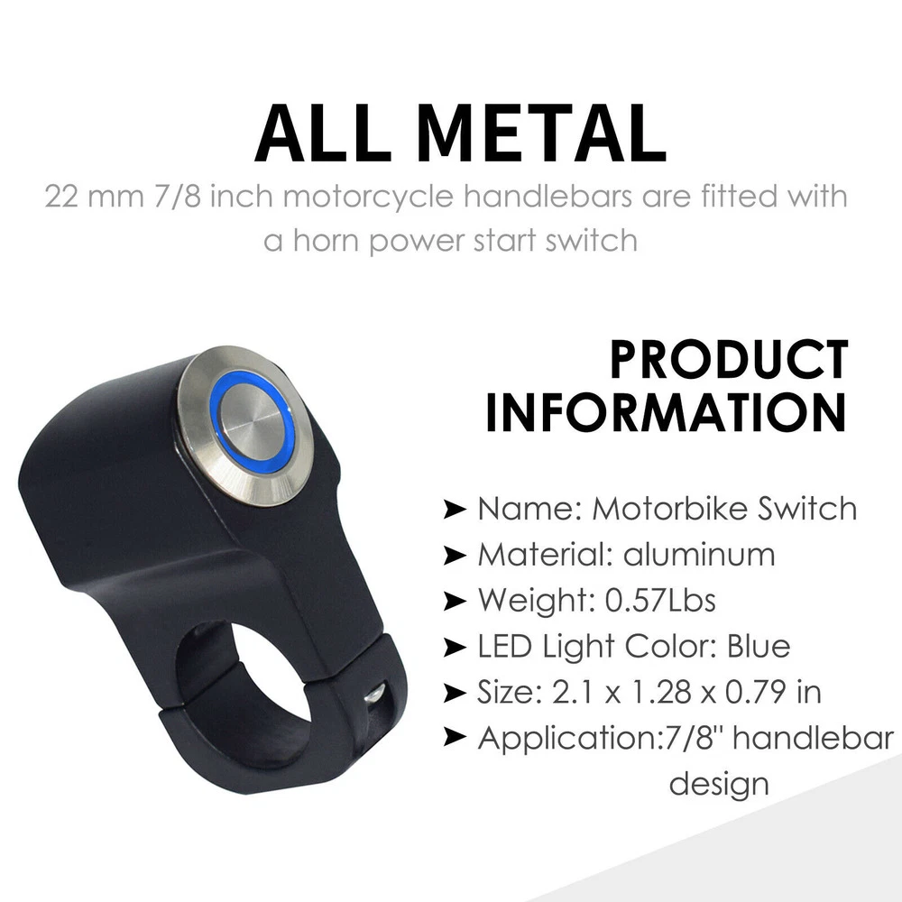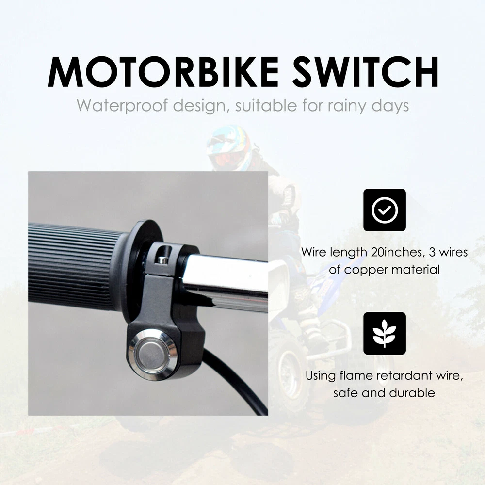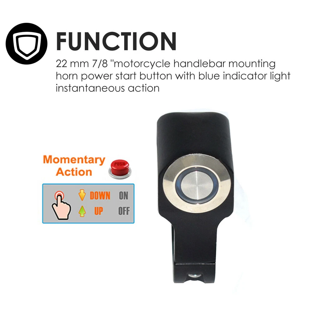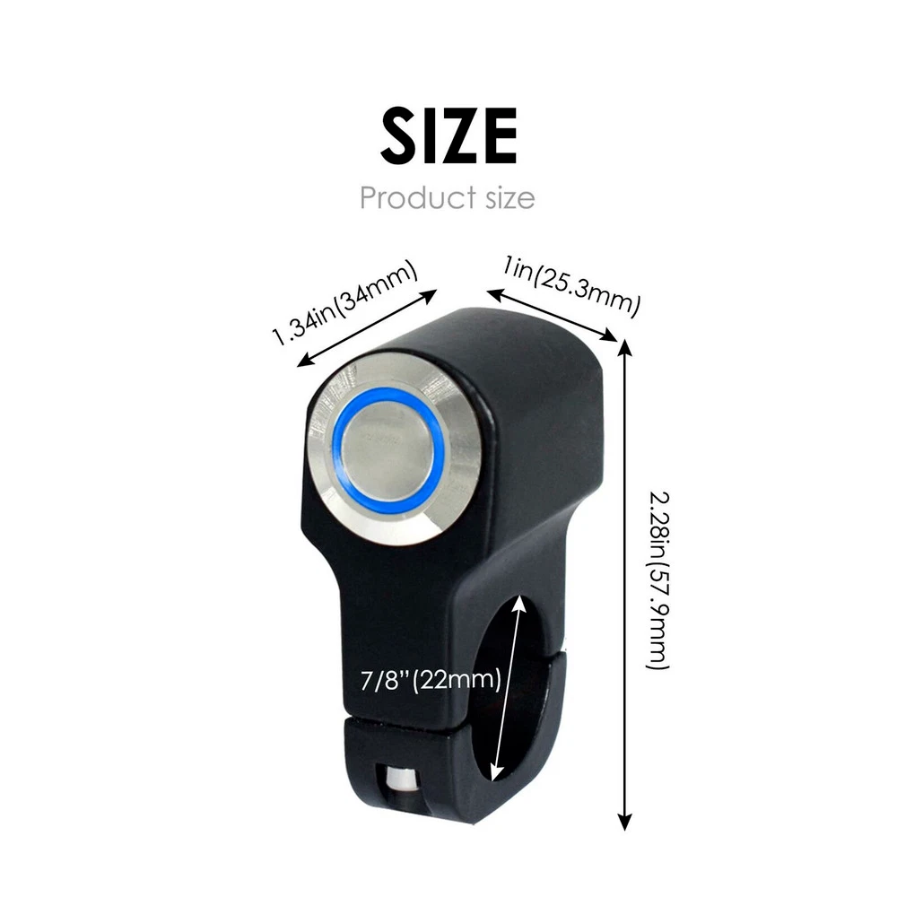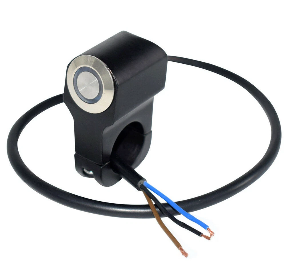 About this item Application: 7/8" (22mm) handlebar mount Standing rate: 12V/10A (Max.current); Wire length 20inches, 3 wires of copper material Reset Action Button as Horn Switch, Power Start Switch, Kill Switch Universal for Motorcycle Motorbike ATV Sport Dirt Electric Bike Interrupteur Moto Blue indicator ligh t, get a new visual experience T wo ways of wire instructions: The LED light on when switch on: Blue - the positive port, Brown - the negative port, Black - the function. The LED light always on: Black - the positive port, Brown - the negative port, Blue - the function. Reset action button, can be use as horn, enginee power, start switches. Cable Length: 28inches Light Color: Blue Package include: 1 Piece x Motorcycle Switch With Wire Harness