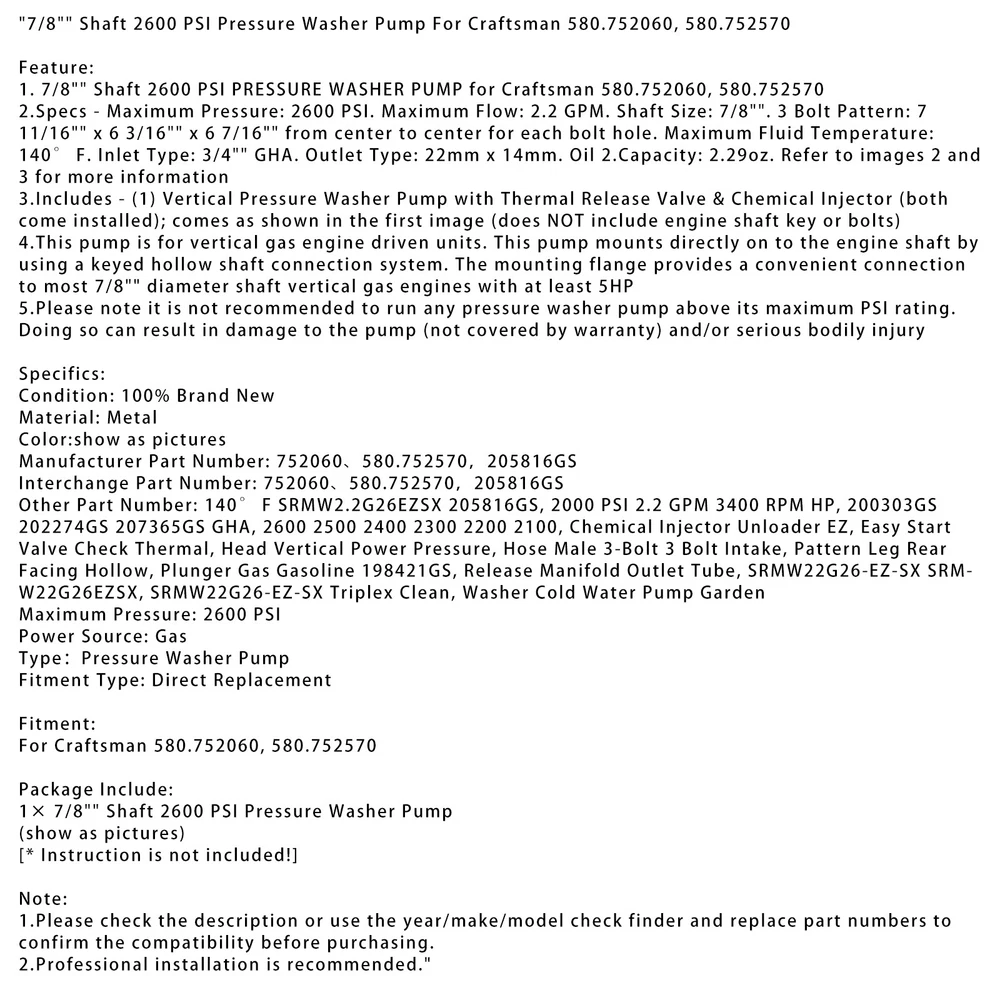 You may also like High Pressure Power Washer Water Spray Gun Nozzle Wand Attachment Garden Hose D5 17.91 USD 18.85 USD Free shipping 5% off 6 in 1 Portable Electric High Pressure Water Spray Gun Car Washer Cleaner Tool# 54.85 USD Free shipping 3/B Unloader Mounting Bolt Kit AR2119 fit Annovi Reverberi XM & RK Series 22.85 USD Free shipping 7/8" Shaft 2600 PSI Pressure Washer Pump For Craftsman 580.752060, 580.752570 Feature: 1. 7/8" Shaft 2600 PSI PRESSURE WASHER PUMP for Craftsman 580.752060, 580.752570 2.Specs - Maximum Pressure: 2600 PSI. Maximum Flow: 2.2 GPM. Shaft Size: 7/8". 3 Bolt Pattern: 7 11/16" x 6 3/16" x 6 7/16" from center to center for each bolt hole. Maximum Fluid Temperature: 140° F. Inlet Type: 3/4" GHA. Outlet Type: 22mm x 14mm. Oil 2.Capacity: 2.29oz. Refer to images 2 and 3 for more information 3.Includes - (1) Vertical Pressure Washer Pump with Thermal Release Valve & Chemical Injector (both come installed); comes as shown in the first image (does NOT include engine shaft key or bolts) 4.This pump is for vertical gas engine driven units. This pump mounts directly on to the engine shaft by using a keyed hollow shaft connection system. The mounting flange provides a convenient connection to most 7/8" diameter shaft vertical gas engines with at least 5HP 5.Please note it is not recommended to run any pressure washer pump above its maximum PSI rating. Doing so can result in damage to the pump (not covered by warranty) and/or serious bodily injury Specifics: Condition: 100% Brand New Material: Metal Color:show as pictures Manufacturer Part Number: 752060、580.752570,205816GS Interchange Part Number: 752060、580.752570,205816GS Other Part Number: 140° F SRMW2.2G26EZSX 205816GS, 2000 PSI 2.2 GPM 3400 RPM HP, 200303GS 202274GS 207365GS GHA, 2600 2500 2400 2300 2200 2100, Chemical Injector Unloader EZ, Easy Start Valve Check Thermal, Head Vertical Power Pressure, Hose Male 3-Bolt 3 Bolt Intake, Pattern Leg Rear Facing Hollow, Plunger Gas Gasoline 198421GS, Release Manifold Outlet Tube, SRMW22G26-EZ-SX SRMW22G26EZSX, SRMW22G26-EZ-SX Triplex Clean, Washer Cold Water Pump Garden Maximum Pressure: 2600 PSI Power Source: Gas Type:Pressure Washer Pump Fitment Type: Direct Replacement Fitment: For Craftsman 580.752060, 580.752570 Package Include: 1× 7/8" Shaft 2600 PSI Pressure Washer Pump (show as pictures) [* Instruction is not included!] Note: 1.Please check the description or use the year/make/model check finder and replace part numbers to confirm the compatibility before purchasing. 2.Professional installation is recommended. -About US Founded in 2012, VIPJQ have professional development and sales, and are involved in various products, providing customers with various high-quality products. Since its establishment, VIPJQ has always adhered to the service concept of "customer first" and the management concept of "pursuit of quality", and is committed to providing customers with high-quality original designs. We commit to provide you the best innovative, quality products & professional services with competitive prices. We value every customer, and we look forward to providing solutions for your business needs to help your business achieve its goals, please contact us immediately! We are all about you! We are a Japanese seller,but with large warehouse in USA. We are profesional on Auto Parts,Car Parts,Motorcycle Parts,3C,other hot sale items and so on. We aim to provide to customers high quality product and best service. -About Shipment&Returns The item usually will be dispatched within 3 days after you ordered.All are free shipping. And it usually takes 3-10 working days to delivery depends on buyers' address or other majeure on the way. If you are not satisfied with the items and want to return the item,we hope you could message us first,we will give you the return details, we think we could give you the best service to save your time and money.Thank you. -About Feedback&Customer Service If you are enjoy your shopping here,not only enjoy the items but also the service,we are appreciate you could give us a 5-star feedback. If you are not satisfied with the item,before you give us the negative feedback,we hope we could give you the best solution through our commutication. We think we could do it if you give us the chance.Thank you.