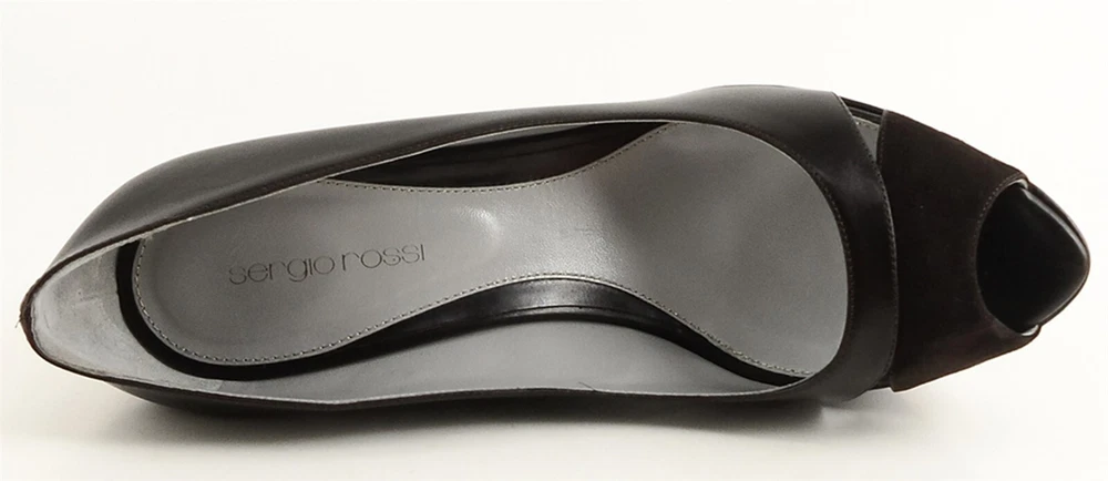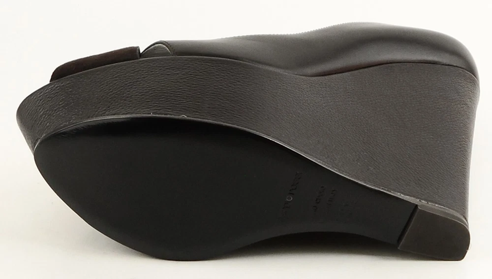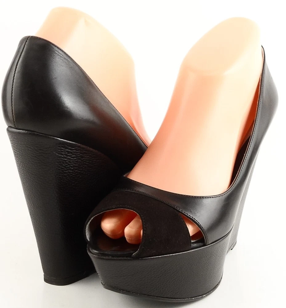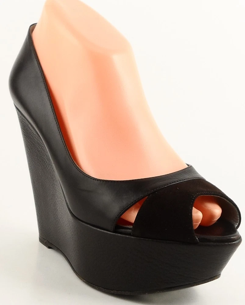 New/ store display ( outsole slightly scuffed ) in original box w/ dust bag Leather/ suede upper; Leather sole; Leather lining Covered wedge measures 5 1/8"; Platform 1 3/4" * Lightly padded footbed Peep toe design Made in ITALY Insole 10 3//8 in. *Measurements are hand taken for every item we sell. Every item is carefully inspected to ensure that you receive a quality product. Designer Shoe Box guarantees this product is 100% Authentic