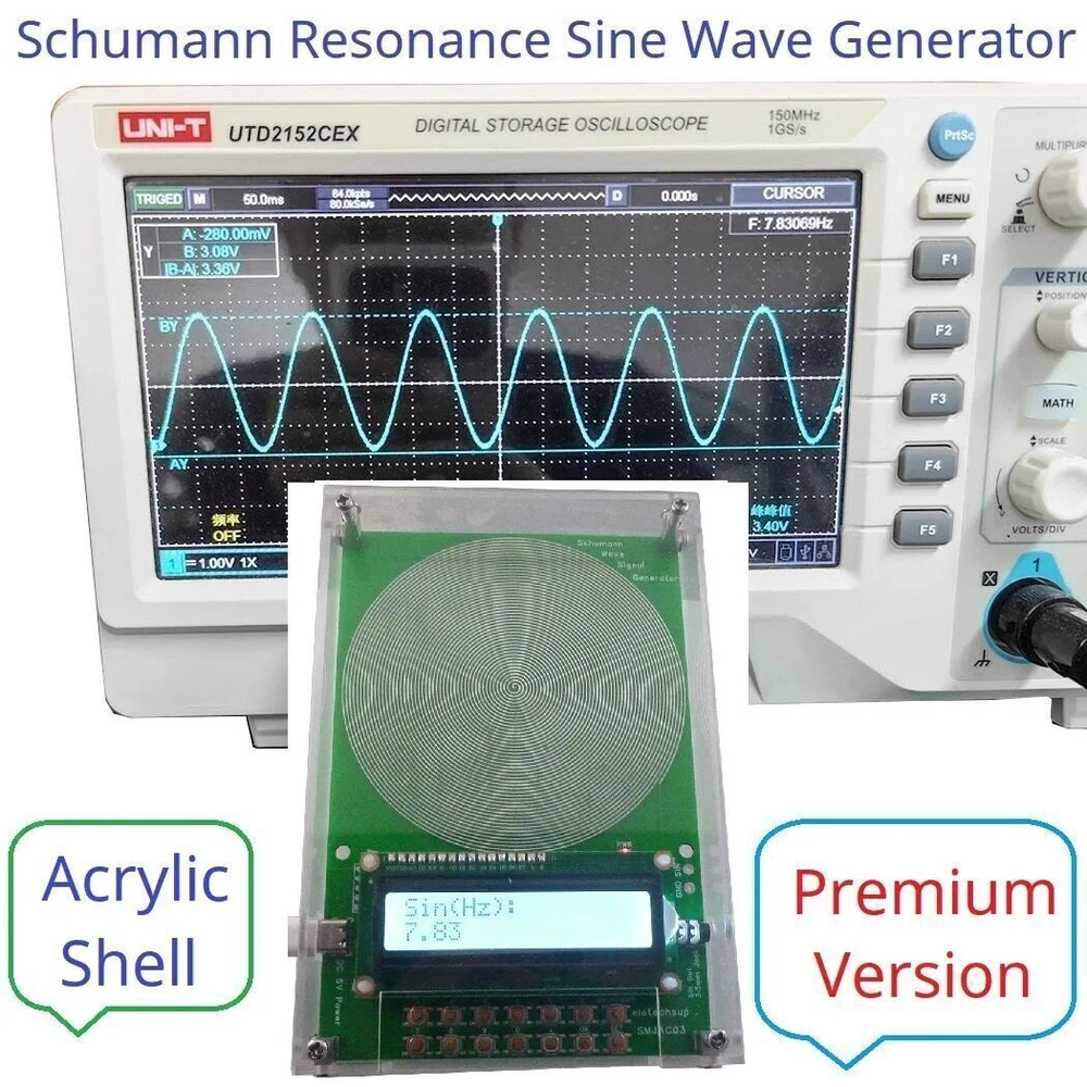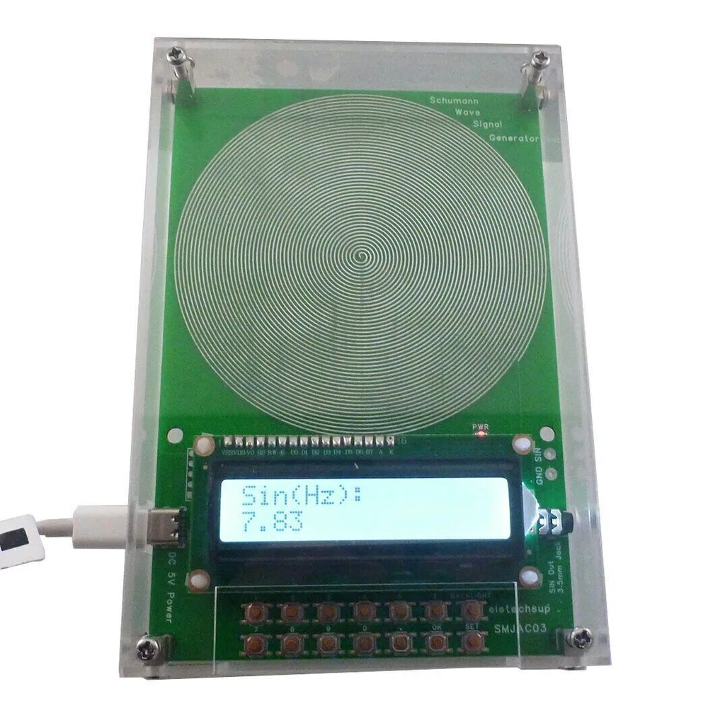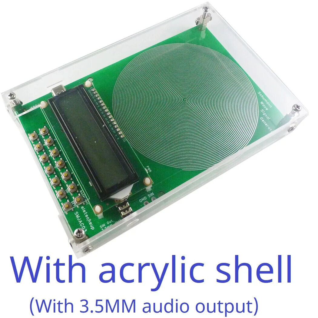Description: Schumann Wave itself does not act directly on sound or video products to improve sound quality, but on the space environment, which can relax people's body and mind, improve the body's perception of sound andimages, improve thehealth of the human body and work efficiency, and relieve psychological pressure. This product not only can output 7.83Hz SchumannWave, but also can adjust the frequency in the range of 0.01Hz-100KHz, the digital circuit crystal oscillator frequency reference, more stable and strong anti-interference. This is a new version of eletechsup's Schumann Wave adjustable signal generator, which uses a low-temperature drift crystal oscillator and a high-precision DAC dedicated chip. It can accurately output frequency and pure sine wave. With Acrylic Shell Version : 1 Working voltage: DC 5V (DC 4-15V) 2 Working current: 9-14MA 3 Power interface: Type-c(Support TYPE-C TO TYPE-C power supply) 4 Default frequency: 7.83Hz 5 Adjustment range: 0.01Hz~100000Hz Pure Sine Wave 6 Signal voltage amplitude: 3V 7 With 3.5MM audio output 8 With acrylic shell 9 Size: 155*105*26MM(With shell) 10 Weight : 197g(With shell) No Acrylic Shell Version : 1 Working voltage: DC 5V (DC 4-15V) 2 Working current: 8-14MA 3 Power interface: Type-c(Support TYPE-C TO TYPE-C power supply) 4 Default frequency: 7.83Hz 5 Adjustment range: 0.01Hz~100000Hz Pure Sine Wave 6 Signal voltage amplitude: 3V 7 PCB Board Size: 150*100*12MM 8 Weight : 86g For more information please Google ''Schumann Resonance''. For audio-visual space - to enhance the sound field and audio-visual effects For the bedroom - to help sleep soothe the nerves, treatment of insomnia For the office - relax and improve work efficiency For the create space - to improve creative inspiration For the tea ceremony, spirituality, realization space - resting body and mind (Uses TYPE-C power supply and supports all TYPE-C power supplies. Note : Since TYPE-C cables are now widely used, no additional TYPE-C power supply cables are provided.) Q&A: Q1:How to change the output frequency? A1:Press the ''0-9'' and '.' buttons to enter the value, and press the OK button to confirm. If the input is wrong, press the SET button to re-enter. For example, press [9][.][7][1], then press [OK], you can set to 9.71Hz, the default power-on output is 9.71Hz, and the setting range is 0.01~100KHz(Note: Not all frequency points can be set) Q2:Need to save parameters even after power off? A2:Please press and hold the ''SET'' button until the LCD displays ''Data Save ON'' Q3: How to verify the output waveform? A3: Please use an oscilloscope to measure the ''GND/SIN'' port. You can see a pure sine wave. Q4: How to turn off the LCD backlight? A4:Short press the ''BACKLIGHT'' button to turn off the LCD backlight; short press the ''BACKLIGHT'' button again to turn on the LCD backlight Q5:How to turn off the output signal indication (PWR LED)? A5:Long press the ''BACKLIGHT'' button to turn off the output signal indication; long press the ''BACKLIGHT'' button again to turn on the output signal indication. Q6:LCD does not display correctly after power on? A6:Please press the RES button briefly and power on again