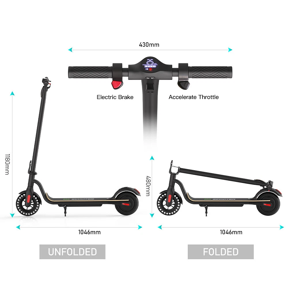 Features: LONG RANGE BATTERY LIFE Powerful 250W motor and 7.8 Ah/36V lithium battery pack that supports a speed of up to 15 Mph with a range up to 13 Miles. Updated large-capacity battery life, designed for commuters and longer distances. 8.0" HONEYCOMB & SOLID TIRES - Shock-absorbing rubber tires offer a smooth ride even over bumpy surfaces. PORTABLE FOLDING DESIGN Electric scooter can be folded easily in 3 seconds with quick folding latch for easy carrying and storage. BATTERY INDICATOR AND LIGHTS Battery indicator keeps to track battery life. Ultra bright LED headlight and taillight. Fast recharging about 5 hours. GEAR SHIFT SETTING 1st gear for a 7 Mph comfortable ride or 3rd gear to get the 15 Mph fast experience. Extremely fun to ride and end boring commutes. Specification: Brand: Megawheels Model: S10 Dimension: Unfolding 105 x 43 x 118 cm; Folding: 105 x 43 x 48 cm Net Weight: 11.9kg Color: Black Frame Material: Aluminium Tires: 8.0" Honeycomb Front Tire & Solid Rear Tire Max Load: 100kg Max speed: 25KM/h Speed level: Gear 1--Max 10km/h ; Gear 2--Max 20km/h; Gear 3--Max 25km/h Mileage: 17-22km Grade Ability: 20 degree slope Working Temperature: -15°C-50°C Storage Temperature: -20°C-25°C Mode Type of Motor: Brushless hub motor Battery Type: High quality lithium battery Battery Capacitiy: 7.8 Ah Battery Voltage: 36V Charger Input Voltage: 100V-240V Charger Frequent: 50Hz/60Hz Charging time: 5 hours Package Contents: 1 * Folding Electric Scooter 1 * Battery Charger 1 * User's Manual Riding Skills: -Put your foot in the front of the scooter and the other foot on the floor before riding. -Make sure that the riding route is smooth. -Slide forward with the food standing on the floor before starting (like riding the scooter without power). -Immediately press the acceleration button and lean forward to avoid falling over backward due to inertia, so that the electric scooter will enter the working status. -Avoid pressing the handle with your body in the acceleration and deceleration process. Put one foot ahead and the other behind (like on the sliding plate/surfboard, put one foot ahead and the other behind by 70-90 for better comfort). -Turning – The turning principle of the electric scooter is the same with that of surfboard/sliding plate/skis. The handle shall be balanced with the body. Observe and make sure that turning is safe before turning. NOTE:The appearance of the product you receive may vary slightly from the image shown due to differing production batches! Tips: Before riding the scooter, please put one foot on the scooter deck and the other foot on floor and push the scooter forward by kicking the floor for some distance, in this way, the scooter will get some impulse to run forward. Note: This products have been certified under UL2272 safety standards.
