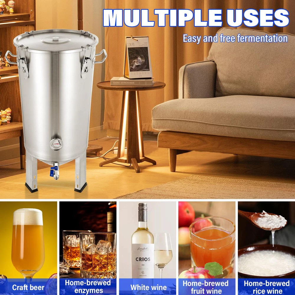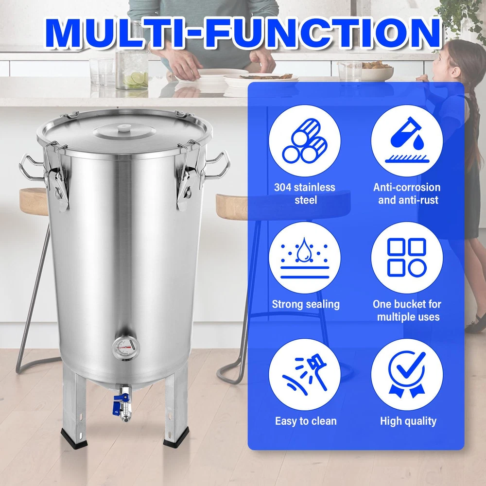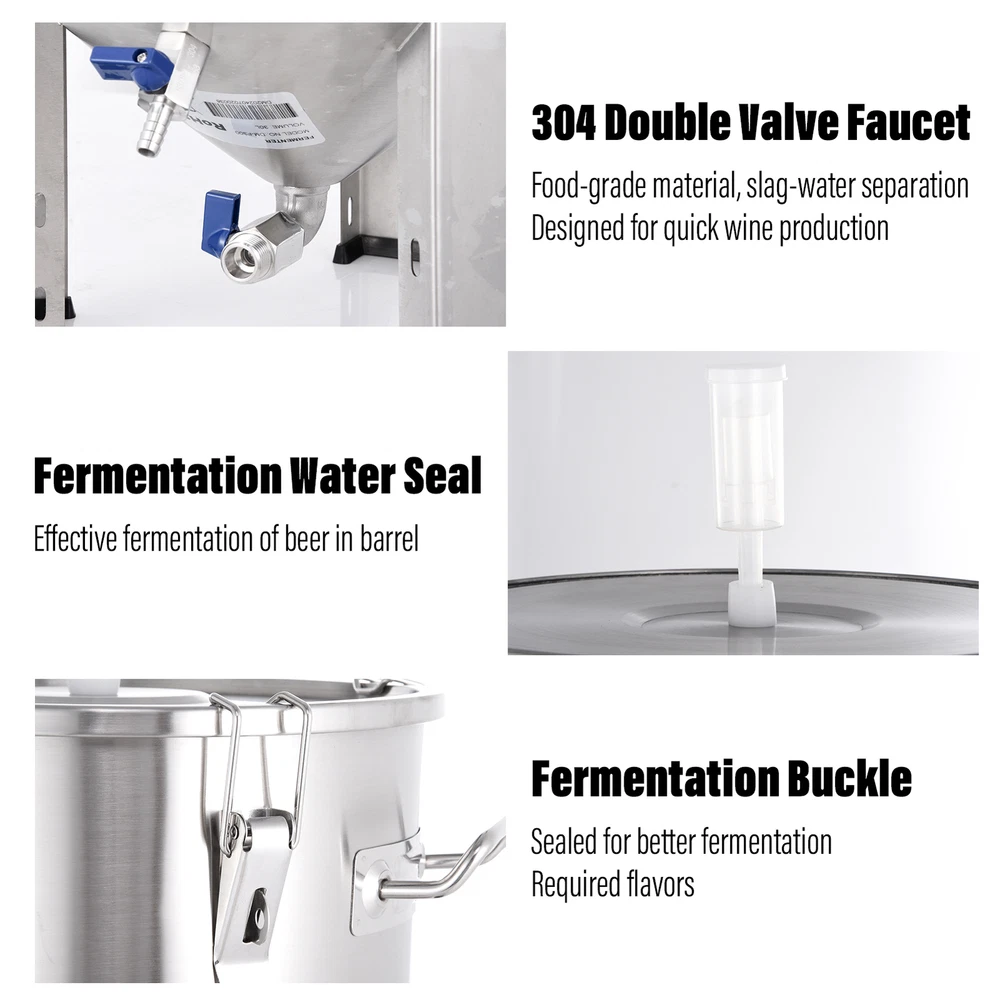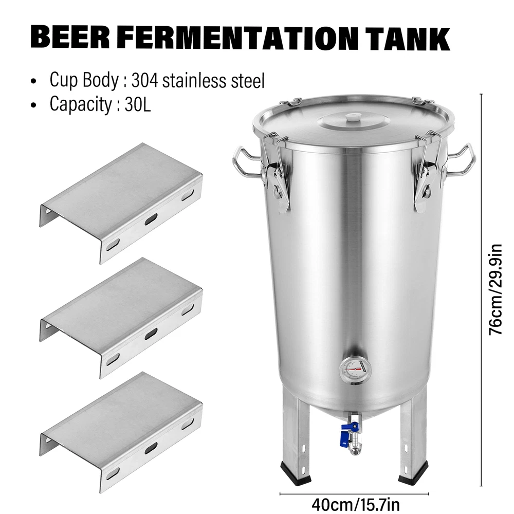 Store category Sign Up Now ! You may also like Product Description Bullet Points: Solid and Stable: Built with 304 stainless steel, our fermentation tank provides a sturdy and safe solution for your brewing requirements, ensuring safe storage and effortless fermentation Spacious Capacity: Enjoy long-lasting use with this 30L fermentation tank that prevents rust, and holds a large amount of beer or other beverages to ensure your brewing success Practical Design: Our fermentation tank features an airlock system with multiple sealing buckles that tightly and solidly seal off the container, ensuring optimal fermentation conditions and preventing any unwanted air or contaminants from entering Widely Used: Allows you to ferment all types of wine while taking full control over the process. The visible temperature gauge helps monitor and adjust the temperature quickly for precise fermentation Isolate Water: Equipped with a double valve faucet and water lock seal, our fermentation tank ensures efficient separation of scum and isolation of impurities Our beer fermenter ensures safety and durability with its rust-resistant structure, and allows you to ferment all types of wine. It is a storage and fermentation solution for your brewing needs. Specification: Product name: Fermentation tank Product size: about 76x40x40cm/29.92x15.75x15.75 inches Cup body: 304 stainless steel Capacity: 30L Purpose: Storage and fermentation of various alcoholic beverages Packing List: Fermentation tank*1 Instruction manual*1 or Fermentation tank*1 Instruction manual*1 Insulation cover*1 Payment Delivery details Terms of sales About us Feedback & DSRs Payment Before you palce an order, please kindly make sure that you have a paypal account. We accept PAYPAL payment only. Payment should be completed within 2 days after auction closed, or unpaid dispute will be filed for an closing auction. An unpaid case will be filled after 4 days. Delivery details We ship to your eBay address. Each package will be shipped to US by UPS Regular Parcel with tracking number. Please check your shipping address carefully before checkout, it can't be changed if order completed. All items will be shipped within 1-2 business day upon receipt of payment.Orders placed on weekend will be shipped within 3 days. If you do not receive your item in 7-10 business days.please contact us immediately for further assistance. We will be responsible for any damages or losses incurred in the shipping process. About us We maintain high standards of excellence FIVE STAR and strive for 100% customer satisfaction! Positive Feedback is very important to us. We hope that you contact us immediately Before you give us neutral or negative feedback, so that we can satisfactorily address your concerns. We promise to offer the lowest price and high quality produce. Our working time: From Monday to Friday(9:30 am to 18:00pm), we don't working on holidays ,hope you can understand and know that , thank you. Please always talk to us via ebay Message. We appreciate your business and look forward to growing our e-Bay sales with satisfied customers. Feedback Contact us If you have any questions, please feel free to contact with us by ebay Message during our business hours ( 9:30a.m. to 5:30 p.m.), or email us through eBay, we will try our best to help you to resolve it. For any presale or after-sale questions,please do feel free to email us! Due to the time difference, each email will be replied within 1 working day,and weekend will be delayed a bit. Feedback
