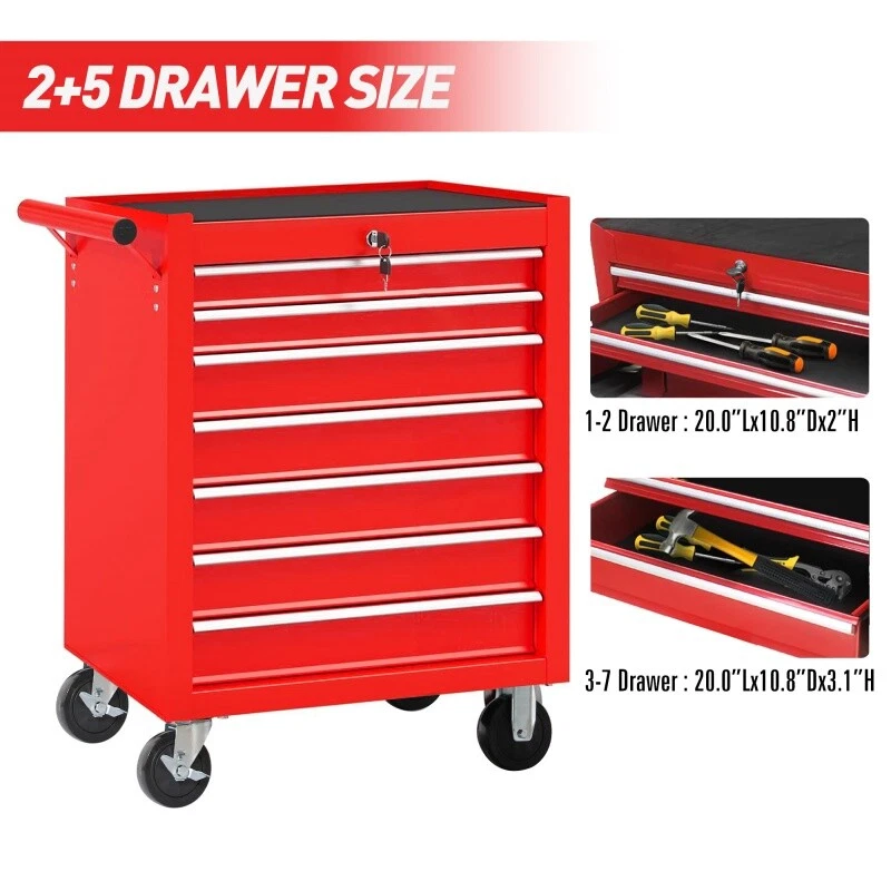 Product Features Large Storage Space: The tool cart is equipped with 5+2 drawers of different sizes, and a large storage space on the bottom. The top storage rack provides additional space for arranging the workshop accessories you need. Easy to Move: Our rolling tool box has 4 steering wheels, 2 of which with parking brakes, so you can move the trolley freely in the garage, but also stop in one place. The tool cabinet with 360° flexible and sturdy universal wheels, rolling tool chest cart are padded and smooth ball-bearing drawer slides to reduce slip during movement, protecting tools and reducing noise. Practical Rolling Tool Cart: Tool cart is Made of steel, the structure is strong and stable, durability. polished and powder-coated to ensure wear and rust resistance and will not chip paint. Storage Drawers: Tool chest with wheels can hold many commonly used tools. Easy Installation : The toolbox is very easy to install, with detailed instructions and videos to help you with the installation. This rolling toolbox is great for home workshops and some professional environments and could be placed in the garage, workshop, warehouse, etc. Description