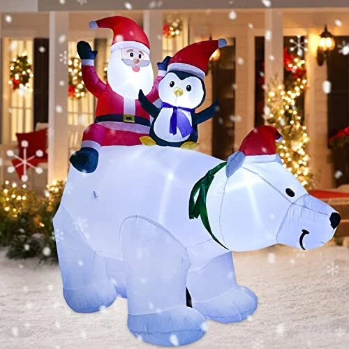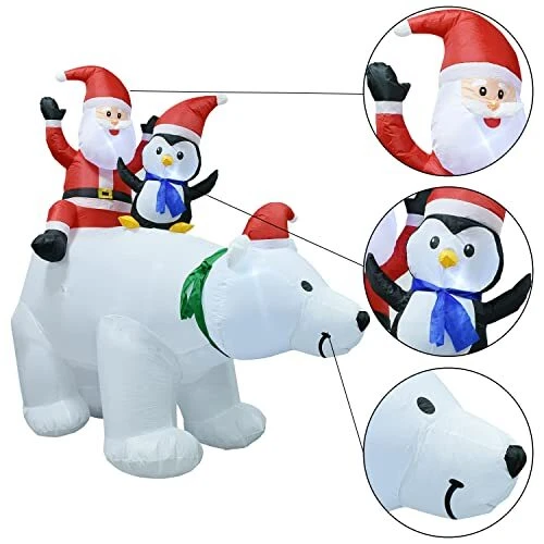 30 Days Return Policy Fast Delivery Trusted seller 7FT Inflatable Polar Bear Christmas Santa and Penguin, Led Lights Xmas Holiday Blow Up Family Party Decoration Yard Lawn Favors Indoor Outdoor Inflatables Product Description ❉??【Large Christmas Inflatable Polar Bear】7 foot tall outdoor Christmas inflatable Penguins features Santa Claus and Penguins riding on an animated polar bear, unique way to decorate your front yard or backyard during the holiday season. ❉??【Internal LED Lights up the Night】Internal LED lights create a glowing nighttime display. Each Inflatable Unit includes built-in lighting for a vibrant effect and enhanced nighttime visibility. ❉??【High Quality Decoration】Made of high quality waterproof polyester with chemical resistant and non-nasty smell, 7FT size Christmas Inflatable Polar Bear can be used indoor/outdoor. Deflates back down for easy storage for next Christmas. ❉??【Easy Setup and Take-down】Self-inflates in seconds with built-in fan when plugs into standard electrical outlet. Stakes and tethers included for quick and easy setup. ❉??【Perfect for Indoors and Outdoors】Enjoy an excellent Christmas party both at home and outdoor. Great for Christmas Themed Party, Indoor and Outdoor Decorations, or yards Decoration! Shipping Returns Payment Shipping Shipping is FREE to all addresses other than APO/PO boxes in the lower 48 states. All our stock ships from US-based warehouses. Shipped via USPS or UPS (depending on location and package weight) Unless stated otherwise, all orders will ship within 24-72 hours of your payment being processed. Check our feedback to see the great reviews of FAST shipping we offer. Returns As our valued customer, we will do our best to make sure the product you receive arrives to you on time and as expected. If you are not satisfied with your purchase, please contact us within 30 days of receiving your order to process a return. Payment We currently accept payment via eBay managed payments only. Once payment is cleared, we will dispatch your shipment within 1-3 business days. Please refer to the "Shipping" tab for more information regarding shipping speed to your destination.