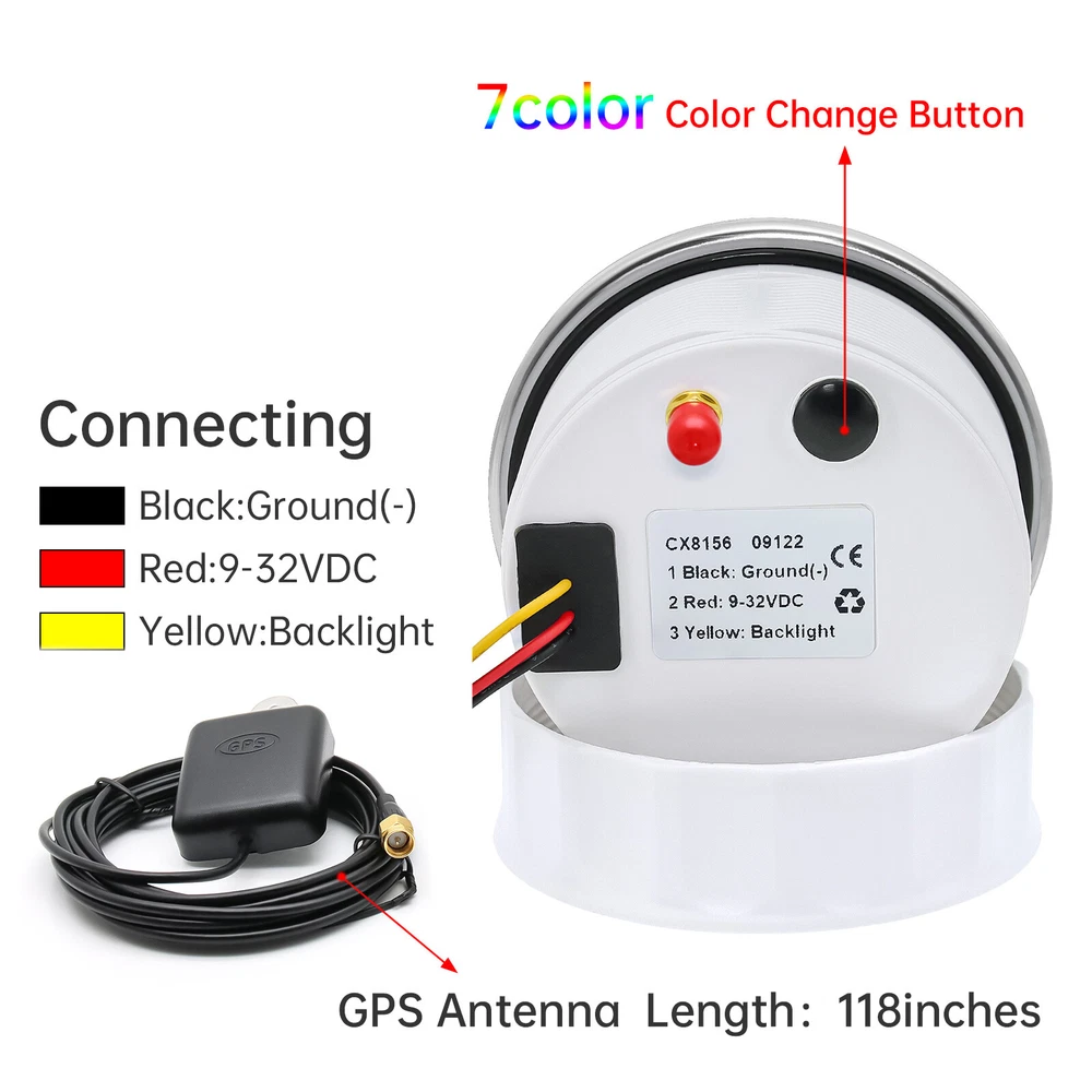 7 Gauge Set GPS Speedometer 0-80MPH Tacho Fuel/Oil Press/Volt/Temp/Trim Gauge 7 Gauge Set 85mm GPS Speedometer 0-80MPH Tachometer with 52mm Gauges Waterproof for Boat Car Feature: High-brightness LED backlight. 316 stainless steel for long-term use even in acid-base, humid environment. IP67 waterproof and dust-proof grade. With curved glass( with anti-fog function). Suitable for all kinds of vehicle modification. Using stepper motor drive pointer, accurate display of the engine speed, and with the LCD display clear display mileage. Gauges have many kinds backlight color (red,yellow,orange,green,blue,purple,white),customers can adjust any color that you like GPS Speedometer Gauge Install Diameter: Φ85mm or 3-3/8" Signal: GPS Working Voltage: 9~32V DC Size: 12x8x12cm / 4.72x3.1x4.75 inch Indication Range: 0-80MPH Backlight:7 Colors Backlight Tachometer Install Diameter: Φ85mm or 3-3/8" Engine hours: 0.0-99999.9H Backlight :7 Color backlight Indicating Range: 0~8000 RPM Signal: Pulse For Tachometer, you can substitute for different unit, please contact us before / after purchase or note on the order. Tachometer: 0-3000rpm/0-4000RPM/6000RPM/7000RPM Fuel Level Gauge Sizes: 52 mm (2-1/16") Measuring Range: Empty - Full Resistance: 240 (E) - 33 (F) ohms Backlight: 7 Colors Water Temperature Gauge Install diameter: Φ52mm Indication range: 0~120℃/30-250℉ Input signal: 287.4~22.4 ohms Storage temperature: -40~+85℃ Backlight: 7 Colors Oil Pressure Gauge Install diameter:Φ52mm or 2-1/16" Indication range:0~10bar / 0-150 PSI Operating temperature:-30~+75 Storage temperature:-40~+85 Backlight: 7 Colors Volt Gauge Sizes: 52 mm (2-1/16") Measuring Range: 8 - 16 (V) Backlight: 7 Colors Trim gauge 7 Color Backlight : Red (default)→green → blue → white →yellow→cyan →Purple →(automatic). Fixing dimension: 52mm(2'') Indicating Range: UP-DN Signal: 0-190ohms Working Voltage: 9-32V(12V/24V) Operation mode: LCD display, stepper motor Package Includes: 1X 85MM Digital GPS Speedometer Gauge 1X GPS Antenna 1X 85MM Tachometer 1X 52MM Fuel Level gauge 1X 52MM Trim gauge 1X 52MM Voltmeter 1X 52MM Water temp gauge 1X 52MM Oil Pressure gauge 7X Installation Instruction Please confirm the size you need before buying