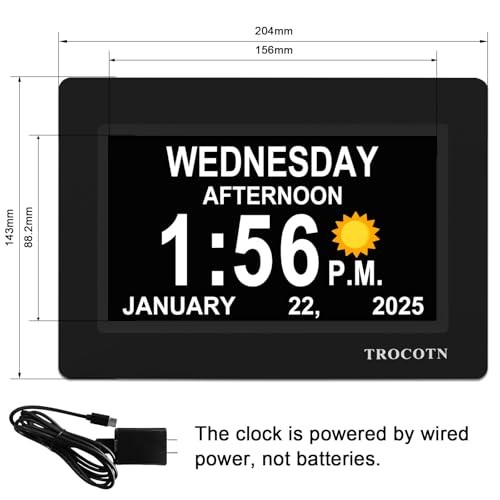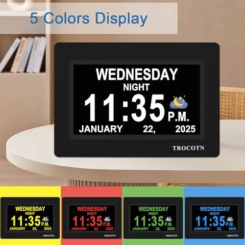 Return Policy Fast Delivery Trusted seller Dementia Clocks, Large Display Calendar Alarm Clock with Auto DST for Seniors, 5 Display Modes Large Font Digital Clock with Custom Alarms Day Date Clocks. (7 Inch Black) Product Description HD Display Function: This unique 7-inch high-resolution digital calendar clock display uses large, bold letters to clearly spell out the time, time of day, day of the week, month, and date - no confusing abbreviations. The adapter cable is approximately 150 cm (59 inches) long and the clock does not run on batteries. Easy to Use: Easy to set up, plug and play, automatic daylight saving time, automatic dimming, 8 languages, 5 color display, easy to read. It can be hung on a wall (using its rear mount hole), or stood on a table, nightstand, shelf or desk,office, kitchen, living room, bedrooms, school, nursing station, garage, bar ......No matter which you choose, you can see the time, date, and day of the week very well. 12 Sets of Custom Alarms: The alarm mode is easy to set, single alarm, every day, weekdays only, or weekends only. The clock has 14 alarm labels, suitable for seniors and family daily life. Auto Dimming: The day clock automatically dims at 7:00 pm and brightens at 7:00 am, perfect for use in the bedroom. Users can also choose a fixed brightness for use in other locations. 5-color display: It can be easily viewed even in less than ideal lighting conditions, and can display the time with the living room decoration, which is very beautiful. The color clock is a color display, which is suitable for the elderly. Great for seniors :The packaging and manual do not contain words such as "dementia" and "memory loss", Great clock with attractive design---easy to read, it's Great for seniors. Shipping Returns Payment Shipping Shipping is FREE to all addresses other than APO/PO boxes in the lower 48 states. All our stock ships from US-based warehouses. Shipped via USPS or UPS (depending on location and package weight) Unless stated otherwise, all orders will ship within 24-72 hours of your payment being processed. Check our feedback to see the great reviews of FAST shipping we offer. Returns Seller does not accept returns Payment We currently accept payment via eBay managed payments only. Once payment is cleared, we will dispatch your shipment within 1-3 business days. Please refer to the "Shipping" tab for more information regarding shipping speed to your destination.