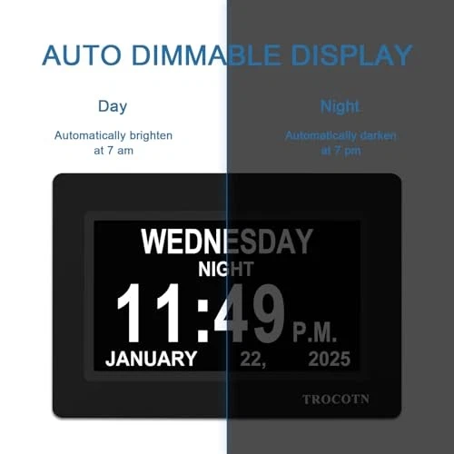 This dementia clock is a game-changer for my elderly mom! The huge, clear display makes it so easy for her to read the time, date, and day at a glance. I love how it automatically adjusts for daylight savings and shows everything spelled out without confusing abbreviations. The multiple display modes and loud alarms work perfectly for her needs. Setup was a breeze, and the long power cord gives flexible placement options. It's been incredibly helpful for keeping her oriented and independent - worth every penny! Fast shipping too!