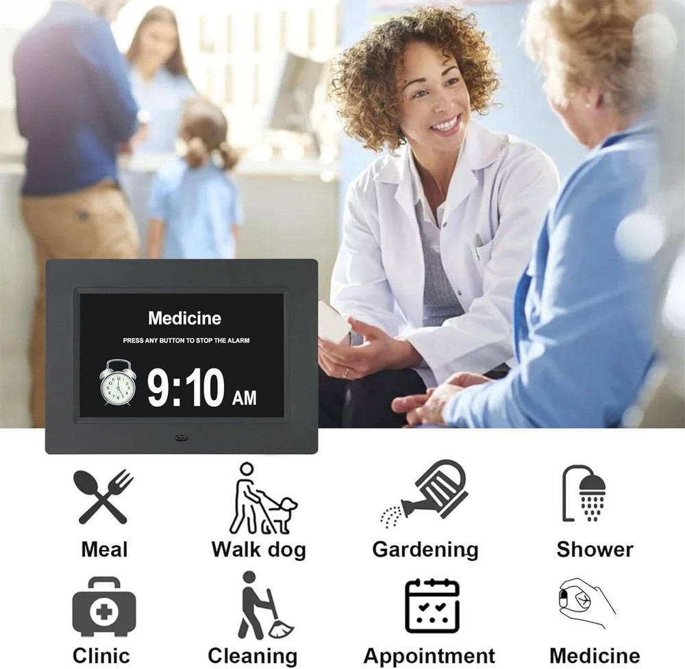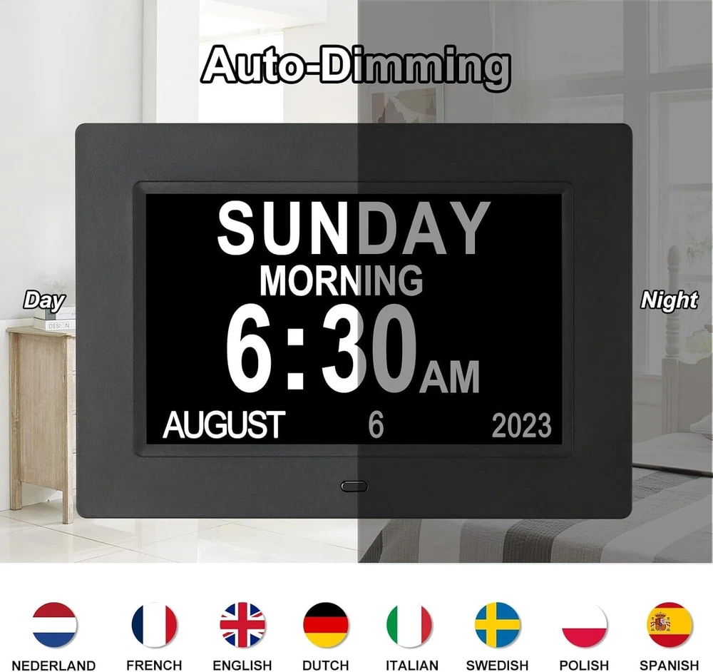【UNIQUE AM PM CLOCK】-Day date time clock clearly spells out DAY DATE TIME MONTH and YEAR in large,Time mode [ 12 or 24 hours], 5 time period: 6:00am - 11:59am (MORNING), 12:00pm - 5:59pm (AFTERNOON), 6:00pm - 8:59pm (EVENING), 9:00pm - 11:59pm (NIGHT) and 12:00am - 5:59am (PREDAWN) 【12 ALARMS OPTIONS】-Dementia clock with 12 Alarm Modes Easy set, Single Alarm, Every Day, Mon. to Fri. or Weekends Only. & tag: Meal, Medicine, Clinic, Shower, Gardening, Cleaning, Appointment and Walk dog. It is quickly becoming a perfect Senior Care and In Home Care necessity 【AUTO DIMMING 】- Memory loss clock Automatic brightness conversion during the 7:00 PM and the 7:00 AM(Mid, Low or High Brightness); also can adjust brightness by yourself (level 1-5) 【BATTERY BACKUP & 8 LANGUAGES】- In case of the power outage, Alzheimer Clock will be reset to the correct time and date when the power returns. Seniors clock is with 8 Languages: English, French, Italian, Dutch, Spanish, Polish, Nederland and Welsh 【SATISFACTION PROMISED & IDEAL GIFT】-We believe in our products. That's why we 30 days 100% money-back and provide friendly, easy-to-reach support. The words Dementia, Alzheimer's or Memory Loss are ‘not’ printed on the clock itself so it makes a great gift for those special loved ones, especially Grandma & Grandpa