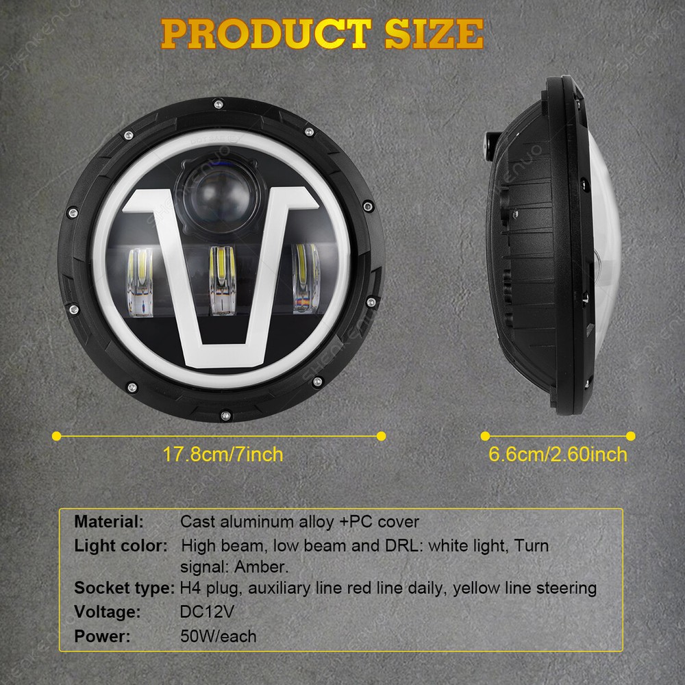 Product Description Package Includes: 2PCS 7-Inch Round V Style LED Headlights 2PCS H4-H13 9008 Adapter Wires (Installation instruction not included) Note: Some models may require a mounting bracket, which is not included! Specifications: Housing Color: Sleek Black Voltage: DC12V Color Temperature: Cool White 6000K-6500K LED Power: 50W each, 100W per set Luminous Output: 10000LM (High Beam), 8000LM (Low Beam) Lighting Functions: High Beam / Low Beam / Daytime Running Light / Turn Signal Life Span: 50,000+ hours for long-lasting performance Energy Efficiency: Save 60% more energy, reducing fuel consumption! Compatibility: Replaces 7-Inch Round H6024 Sealed Beam Housings Waterproof Rating: IP67 for all-weather performance Product Features: Maximum Brightness: Equipped with premium LED chips, these headlights deliver 100% more brightness compared to stock or halogen lights, improving nighttime visibility. Weatherproof Design: DOT Approved, IP67 rated, and equipped with anti-flicker technology for seamless performance without the need for extra decoders. The sealed design keeps moisture and water out, ensuring reliable performance. Hassle-Free Installation: Easy plug-and-play setup saves you time and effort. Built for durability, these headlights boast an impressive lifespan of over 50,000 hours. About the Adapter: A slight flicker may occur due to Jeep Wrangler's voltage instability, not because of the headlights. The flicker is more noticeable with brighter LEDs, unlike dimmer halogen lights. Simply plug in the headlights first. If there is no flicker, the adapter is not needed. Upgrade your vehicle with these cutting-edge 7-inch LED headlights, delivering exceptional brightness, style, and reliability! (Including but not limit the following applications) Application: For Alfa Romeo Spider (1988-1994) For AM General Hummer (1992-2001) For American Motors AMX (1968-1978) For American Motors Gremlin (1970-1978) For American Motors Hornet (1970-1977) For American Motors Javelin (1968-1974) For American Motors Matador (1974-1978) For American Motors Pacer (1975-1980) For Bertone X 1/9 (1984-1989) For Chevy Blazer (1969-1974) For Chevy C10 (1975-1980) For Chevy C10 Pickup (1969-1974) For Chevy C10 Suburban (1969-1980) For Chevy C20 (1975-1980) For Chevy C20 Pickup (1969-1974) For Chevy C20 Suburban (1969-1980) For Chevy C30 (1975-1980) For Chevy C30 Pickup (1969-1974) For Chevy Camaro (1967-1981) For Chevy Chevelle (1971-1973) For Chevy Chevette (1976-1978) For Chevy El Camino (1971-1975) For Chevy G10 G20 G30 (1975-1987) For Chevy K10 K20 K30 K5 Blazer (1969-1980) For Chevy Laguna (1973-1975) For Chevy Lux (1980-1982) For Chevy Malibu (1973-1975) For Chevy Monte Carlo (1970-1975) For Chevy Monza (1975-1980) For Chevy Nova (1963-1978) For Chevy Pickup Truck (1967-1973) For Chevy Truck (1947-1957 and 1962-1972) For Chrysler (1949-1955) For Datsun 240Z 260Z 280Z 280ZX (1970-1978) For DeSoto (1949-1955) For Dodge (1949-1955) For Dodge B100 (1975-1978) For Dodge B100 Van (1971-1974) For Dodge B150 (1984-1987) For Dodge B200 (1975-1978) For Dodge B200 Van (1971-1974) For Dodge B250 (1984-1987) For Dodge B300 (1975-1978) For Dodge B300 Van (1971-1974) For Dodge B350 (1984-1987) For Ford Bronco (1966-1977) For Ford Custom 500 (1971/1976) For Ford E-100 Econoline (1969-1978) For Ford E-100 Econoline Club Wagon (1975-1978) For Ford E-150 Econoline (1969-1978) For Ford E-150 Econoline Club Wagon (1975-1978) For Ford F-100 (1975-1979) For Ford F-100 Pikcup (1969-1974) For Ford F-150 (1975-1979) For Ford F-250 (1975-1979) For Ford F-250 Pickup (1969-1974) For Ford F-350 (1975-1979) For Ford F-350 Pickup (1969-1974) For Ford Falcon Sedan Delivery (1961-1965) For Ford Mustang (1965-1973) For Freightliner Century Class (1996-2011) For Freightliner Coronado (2001-2016) For Honda Civic (1976-1981) For Hummer AM General 1992-2001 For Hummer H1 2002-2006 For Hummer H2 2003-2009 (H2 needs 9007 male to H4 female adapter, package not included) For International Harvester 4200 4300 4400 For Jeep Cj-5 1955-1983 For Jeep CJ-7 (1976-1986) For Jeep CJ-8 Scrambler (1981-1985) For Jeep Wrangler JK 2 Door (2007-2018) For Jeep Wrangler JK 4 Door Unlimited (2007-2018) For Jeep Wrangler LJ Unlimited (2004-2006) For Jeep Wrangler TJ (1997-2006) For Jeep Wrangler TJ Unlimited / LJ (2003-2006) For Kenworth T2000 (1998-2010) (Buyer Note, Our Headlight plug is H4,H4-H13) For Land Rover 90/110 1983 to 1991 (including 2.5N/A, 2.5 Turbo, V8) For Land Rover 90/110 Defender 200 Tdi For Land Rover 90/110 Defender 300 Tdi For Land Rover 90/110 Defender Td5 For Land Rover 90/110 Tdi For Land Rover Defender 90 & 110 For Land Rover Defender 90 1995 For Land Rover Defender 90 1997 For Land Rover Range Rover County Classic SportUtility 4-Door 1995 For Mack DM RM RW RS RL CF For Mazda 808 1976-1977 For Mazda Miata (1990-1997) For Mazda Miata MX5 MX-5 (1990-1997) For Mazda Mizer 1976-1977 For Mazda RX-7 1979-1985 For MG Midget (1969-1979) For Oldsmobile Omega (1974-1979) For Peterbilt 359 (1981-1987) For Peterbilt 379 (1988-2009) For Plymouth (1949-1955) For Plymouth Barracuda (1964-1974) For Plymouth Valiant (1963-1976) For Porsche 944 (1983-1991) For Toyota Corolla (1969-1980) For Toyota LandCruiser (1979-1987) For Toyota Pickup (1979-1981) Motorcycle Fitment: (Fits following motorcycle:) For Any Motorcycle models with 7 inch Round headlight,such as(Not limited): For Dyna SwitchbackFLD: 2014, 2016 For Softail Convertible CVO FLSTSE : 2010-2012 For Softail Cros Bones FLSTSB: 2008-2011 For Softail Deluxe CVO FLSTNSE: 2014-2015 For Softail Deluxe EFI FLSTNI FLSTN: 2005-2017 For Softail FatBoy : 2001-2017 For Softail Heritage Classic Springer Classic EFI FLSTI FLSTC FLSTS: 1991-2017 For Softail Nostalgia FLSTN : 1993-1996 For SoftailSlim FLS S FLSS: 2012-2017 For Touring Electra GlideClassic CVO FLHTCSE EFI FLHTCUIPolice FLHTP: 1994-2017 For Touring Road King Classic EFI FLHRCI Police CA FLHR: 1994-2017 For Touring Street Glide CVO FLHXSE EFI FLHX