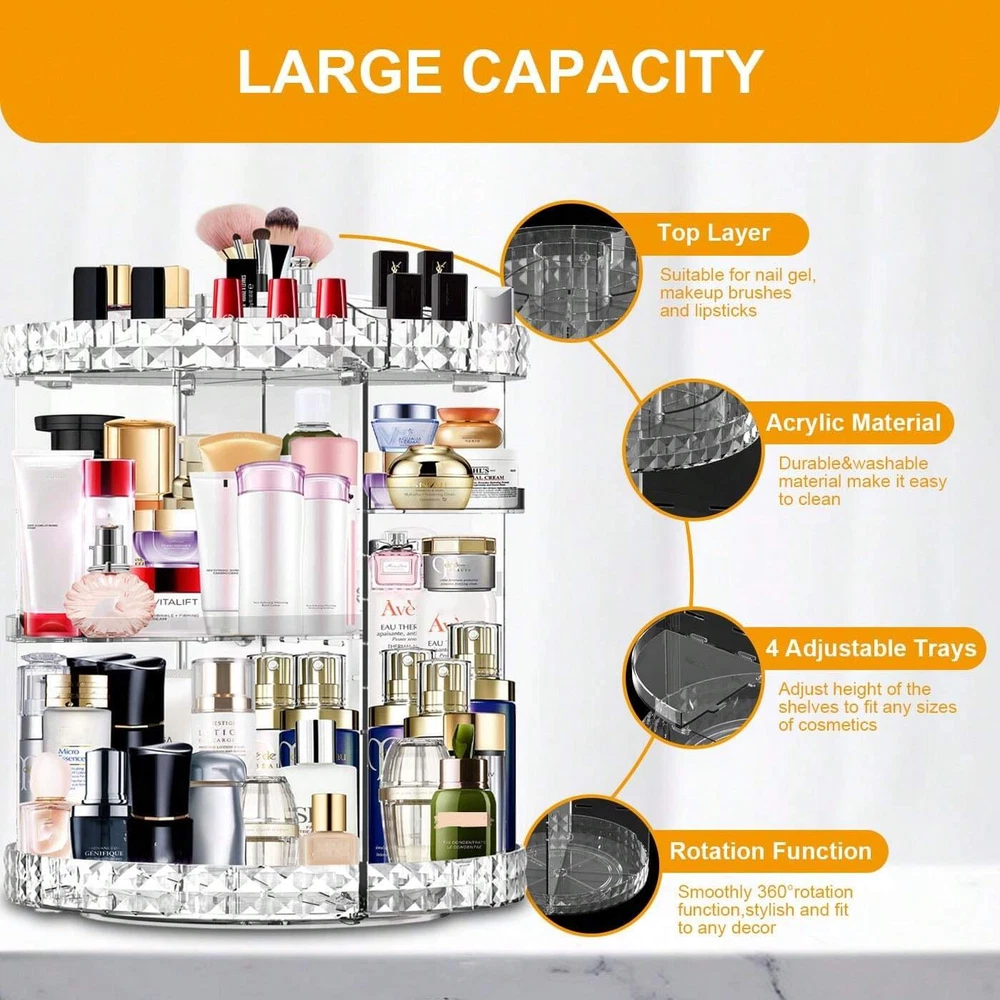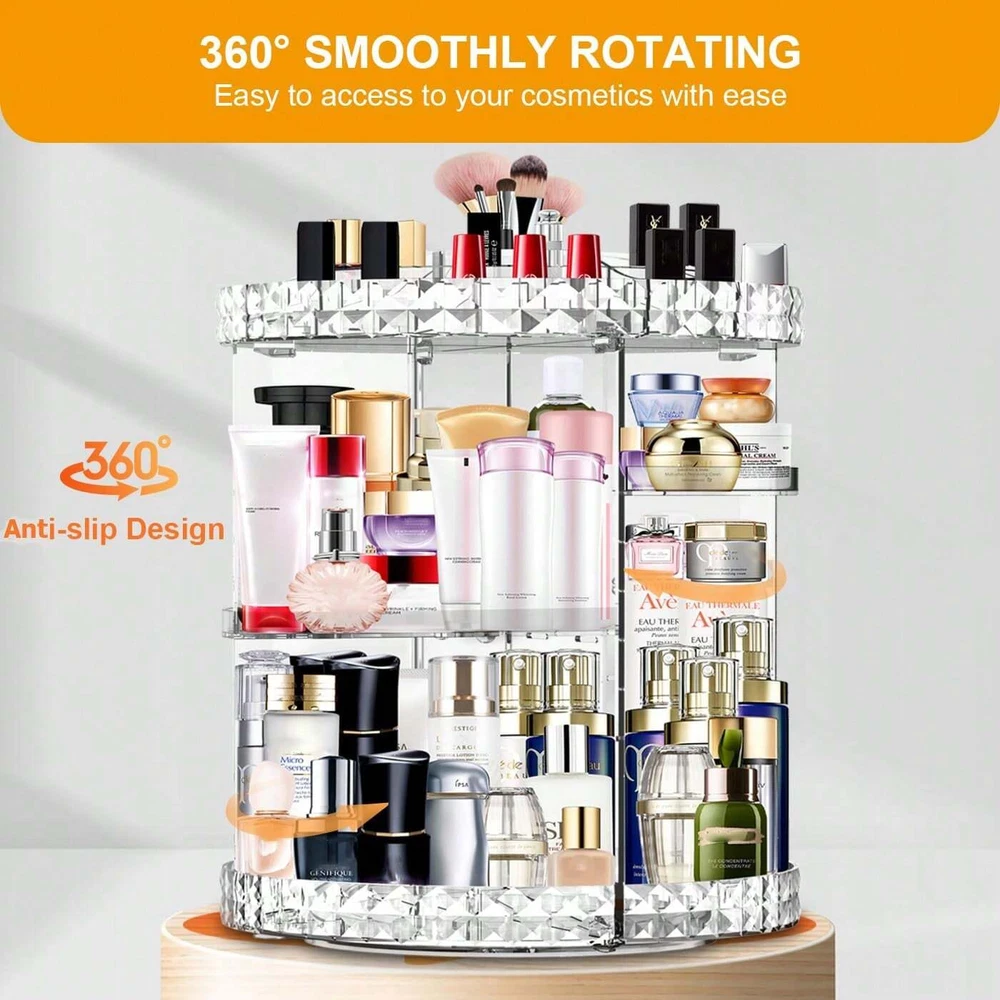 This makeup organizer is a game-changer! The 7 adjustable layers hold all my cosmetics neatly, and the 360-degree rotation makes everything easy to reach. The large capacity fits my entire collection, and the transparent design keeps things visible. Sturdy yet lightweight, it’s perfect for keeping my vanity clutter-free while adding a sleek touch. Love how smooth it spins—no more digging through piles! Highly recommend for anyone with a growing makeup stash.