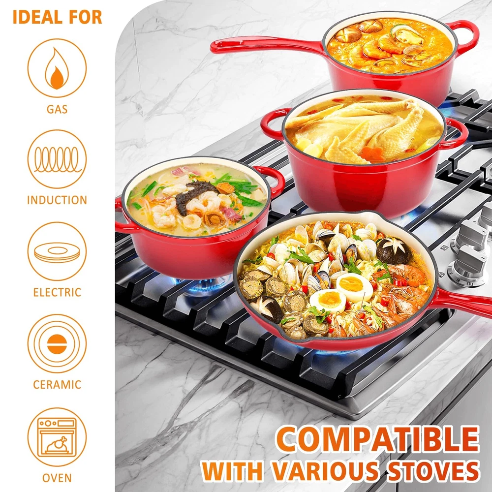 Experience Superior Cooking with Hisencn's 7-Piece Enameled Cast Iron Cookware Set Elevate your culinary skills with our premium quality cookware set, meticulously crafted for exceptional performance and durability. Whether you're sautéing, grilling, slow cooking, braising, boiling, frying, roasting, or baking, this versatile set is your ultimate kitchen companion. What's in the Box: 4.8-Quart Large Dutch Pot with Lid 2.8-Quart Small Dutch Pot with Lid 2-Quart Sauce Pan 10.25-Inch Skillet An excellent gift choice for cooking enthusiasts! Premium Quality: Crafted from durable cast iron. Enameled Coating: Cleanup is a breeze with the coating, which is free from PFOA, PTFE, lead, and cadmium, ensuring healthy cooking. Versatile Cooking: Compatible with gas cooktops, electric, induction, and ceramic stoves. Oven safe up to 550 degrees Fahrenheit. Cleaning and Maintenance: Simply use a soft sponge or rag for cleaning. Avoid using metal utensils to maintain the ceramic coating's luster. Enclosed Thermal Self-Circulating: The lids feature a raised design that allows water vapor to circulate through the pan, preserving nutrients and moisture in your food. The snug fit ensures nutrients and water are retained without overflowing. [Complete 7-Piece Set for Versatile Cooking] - This enameled cast iron cookware set includes a 4.8-quart large Dutch oven with lid, 2.8-quart small Dutch oven with lid, 2-quart sauce pan, and a 10.25-inch skillet. Perfect for a range of cooking techniques, from sautéing and grilling to slow cooking, roasting, and baking—an ideal gift choice for home chefs! [Premium Ceramic Coating for Easy Use] - Crafted with 5 layers of durable ceramic enamel coating, this ceramic cast iron cookware set ensures effortless easy-cleaning performance. The layers include a sturdy cast iron interior, base glazes, and an exterior enamel, making it resistant to cracking, scratching, and chipping. The PFOA, PTFE, lead, and cadmium-free coating makes cooking healthier, while messes can be wiped clean with a single swipe—your trusted partner in easy, enjoyable cooking. [Enhanced Heat Distribution & Retention] - Made from high-quality cast iron, this ceramic coated cast iron cookware set heats evenly and retains heat exceptionally well, allowing food to cook thoroughly and stay warm longer. Enjoy perfectly cooked, succulent dishes every time, with even heat that brings out the best in every meal. [User-Friendly Design with Thoughtful Features] - Each piece in this enameled cast iron pots and pans set includes ergonomic handles for easy transfer from stovetop to oven, and the lids feature stainless steel knobs for durability. The skillet is designed with pouring spouts on both sides for drip-free serving, while the handles include perforations, making storage convenient and adding style to your kitchen and table. [Self-Circulating Lids for Optimal Flavor] - The Dutch oven and sauce pan lids are designed with a unique raised pattern, allowing water vapor to circulate within the pan, locking in nutrients and moisture, and distributing them evenly across your food. This thermal self-circulating feature helps preserve the natural flavors and nutrients of your ingredients, providing consistently delicious and healthful meals. [All-Cooktop Compatibility & Oven Safe] - This versatile enameled cast iron cookware set is compatible with gas, electric, induction, and ceramic cooktops, and can withstand oven temperatures up to 550°F. Perfect for everything from stovetop searing to oven roasting, making it a reliable choice for all types of culinary adventures. [Effortless Cleaning & Maintenance] - The smooth enamel coating makes cleaning quick and easy. Simply wipe down with a soft sponge or cloth, or for tougher stains, soak in warm water and use baking soda or a mild detergent. Avoid metal utensils to protect the enamel finish and preserve its pristine appearance over time. [Hisencn Quality Assurance] - Each enameled cast iron pots and pans set undergoes a rigorous inspection process for quality assurance. If your item arrives with any issues, our 24/7 customer support team is here to assist you promptly, with a 1-year warranty for any quality concerns.