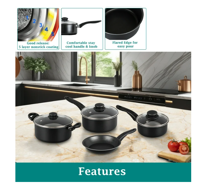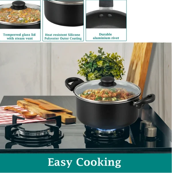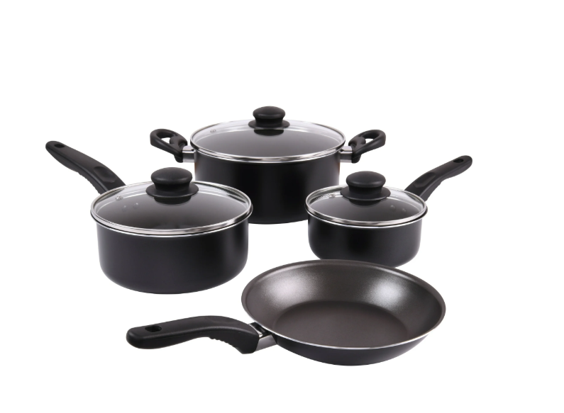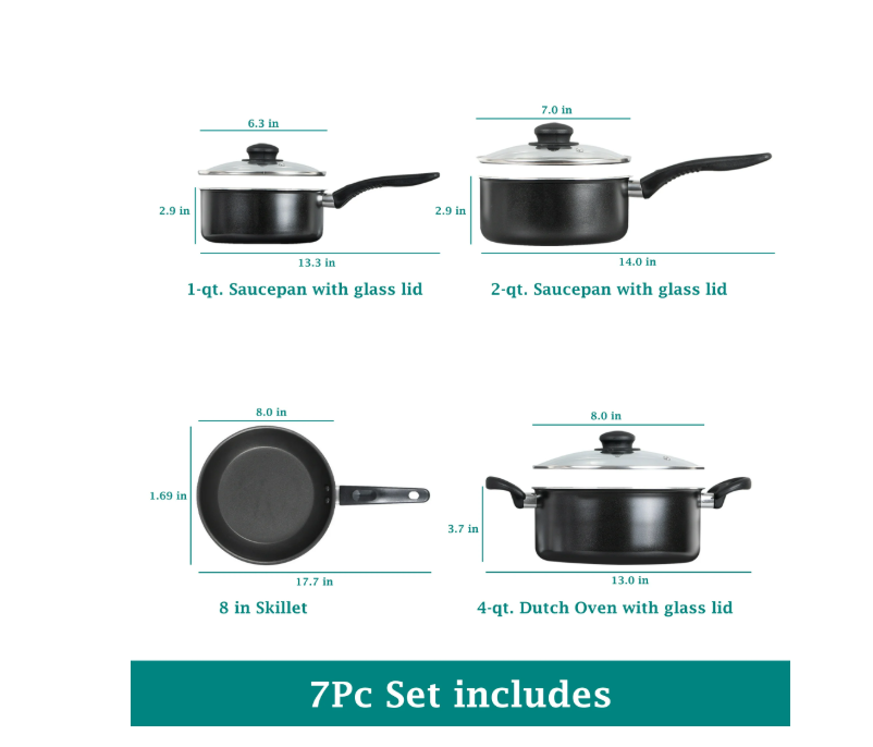 Prepare everything you need for amazing meals with the Mainstays Stainless Steel 10-Piece Cookware Set. Including one 8.5” sauté pan, one 1-quart saucepan, one 2-quart saucepan, one 4-quart Dutch oven, 3 vented glass lids, 1 solid serving spoon, 1 slotted Mainstays 7 Piece Non Stick Aluminium Cookware Set, Black Includes a 1 Qt. saucepan with lid, 2 Qt. saucepan with lid, 4 Qt. Dutch oven with lid, and an 8-inch frying pan Non-stick finish for easy food release and cleanup Lightweight design for easy maneuverability, perfect for both experienced chefs and beginners Dishwasher safe for convenient cleaning Constructed from durable aluminum for even heat distribution