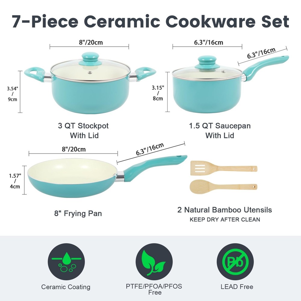 Pots and Pans Set, Pre-assembled Nonstick Ceramic Cookware Sets, 7 Piece Pots and Pans with Frying Pan, Sauce Pan, Stockpot, Kitchen Utensils, Gas/Induction Compatible, 100% PFOA Free, Turquoise 【All in One Little Set】offers high quality kitchen pots and pans set without assembly: 8" non stick frying pan, 2 piece saucepan set including 1.5 quart sauce pan with lid and 3 quart casserole pot with lid, 2 natural bamboo kitchen utensils. Multifunctional non stick pot and pan set meets all your need for every day cooking. Perfect ceramic cooking pan set for compact kitchen 【Nonstick Ceramic Cookware】kitchen cookware sets features long-lasting ceramic nonstick coating, makes cooking an enjoyable thing and cleaning a breeze. 100% free of PFAS/PTFE/ PFOA/lead/cadmium. Clean up is quick & easy, simply rinse or wipe with a damp paper towel. Enjoy healthier and easier cooking with our ceramic pots and pans set non stick 【Stay Cool Bakelite Handles】This non stick pots and pan set is equipped with ergonomic bakelite handle, which is designed for comfort and safety, featuring non-slip, heat-resistant and easy-to-grip. Durable glass lids with air hole for ventilation, easy view on food while cooking, lock the best taste of the food. Portable gift box packing for your gift choice 【Quick & Even Heating】nonstick cookware set is crafted from heavy-duty aluminum, heats up quickly and evenly. Low or medium heat is recommended. This non toxic ceramic pot set features high magnetic conductive steel base, compatible with all stovetops including induction 【Beautiful Pots and Pans Set】ceramic cookware set is aesthetically made for everyday cooking. Vibrant gorgeous turquoise color and nonstick interior ceramic surface is attractive yet functional. Best choice as cookware starter set for family use and house-warming gifts