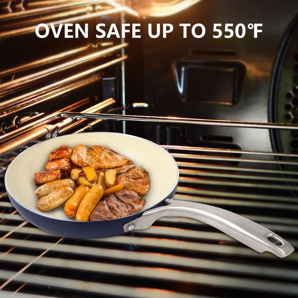 【Healthy Nonstick Ceramic Coating】kitchen cookware sets feature long-lasting ceramic nonstick coating, makes cooking an enjoyable thing and cleaning a breeze. All pots and pans are 100% free of PTFE/ PFOA/lead/cadmium. Enjoy healthier and easier cooking with our ceramic pots and pans set nonstick 【7-Piece Cookware Sets】offers high quality kitchen pots and pans set without assembly: 9.5" non stick frying pans, 1.5 quart sauce pan with lid, 3 quart dutch oven pot with lid, 2 natural bamboo cooking utensils set. Versatile non stick pots and pan set with lids meets all your need for every day cooking. Perfect pot and pan set matching any kitchen 【Stovetop & Oven Safe】This nonstick cookware set is crafted from heavy-duty aluminum, heats up quickly and evenly. Low or medium heat is recommended while cooking. High magnetic conductive steel base is compatible with all stovetops including induction. non toxic cookware set is oven and broiler safe up to 550°F, providing you with more choice for cooking and baking 【Stay Cool Stainsless Steel Handles】This pots and pans set non stick is equipped with ergonomic stainsless steel handles, which is designed for comfort and safety, featuring non-slip, heat-resistant and easy-to-grip. Durable glass lids with steam vent, easy view on food while cooking and lock the best taste of food 【Beautiful Cooking Pan Set】induction cookware sets is aesthetically made for everyday cooking. Elegant gorgeous blue color and nonstick ceramic interior is attractive yet functional. Pot set comes with elegant gift boxes which is a perfect gift for your family and friends 【Service & Guarantee】cookware set non stick passed strict inspection process. In case you received defect items caused by delivery, please don't hesitate to contact our 24/7 online customer service which will reply to you within 24 hours to solve your doubt. Guarantee extend to 6 months for quality issue