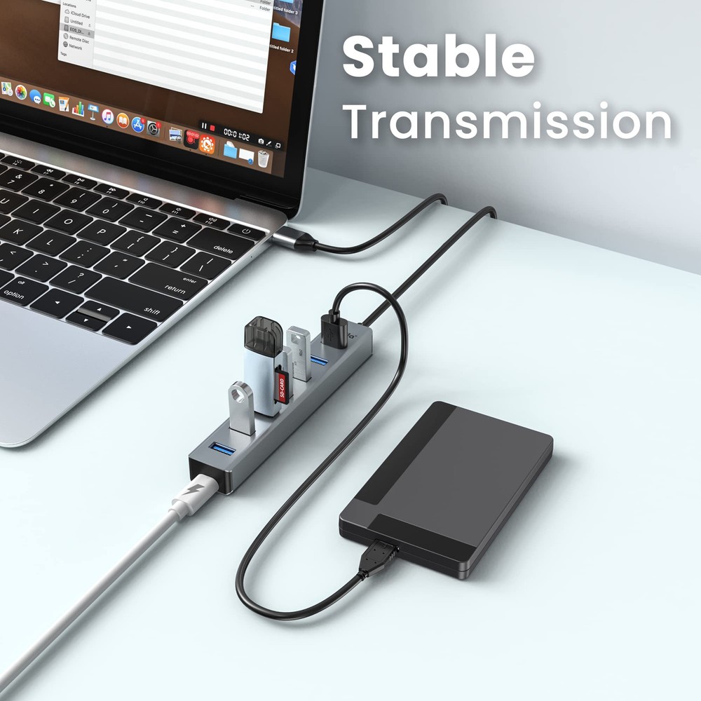 USB 3.0 Multiport Expansion: Instantly add 7 USB 3.0 ports to your laptop or desktop PC, suitable for USB flash drive, keyboard&mouse, printer, and other USB peripherals. SuperSpeed Transfer: USB 3.0 ports support blazing transfer speed up to 5Gbps,10x faster than USB 2.0, fast enough to download HD movie or large files within seconds. Compact and Durable: Made of premium aluminum alloy case with milled craft, making this hub better heat-dissipation and durable for a longer life span; ultra-slim and lightweight design can be tucked into your bag easily. Wide Compatibility: Compatible with most operating systems, Windows, Mac OS, Linux 2.1.6 and above; high-speed USB hub for Macbook Pro/Air, Surface Book, Lenovo Yoga, ThinkPad, Chromebook, and other computers. Stable Connection: Comes with a 5V/3A USB-C port to connect a power adapter and ensure steady transmission when using power-hungry devices. The built-in smart chip will avoid damage from over-voltage and over-current.