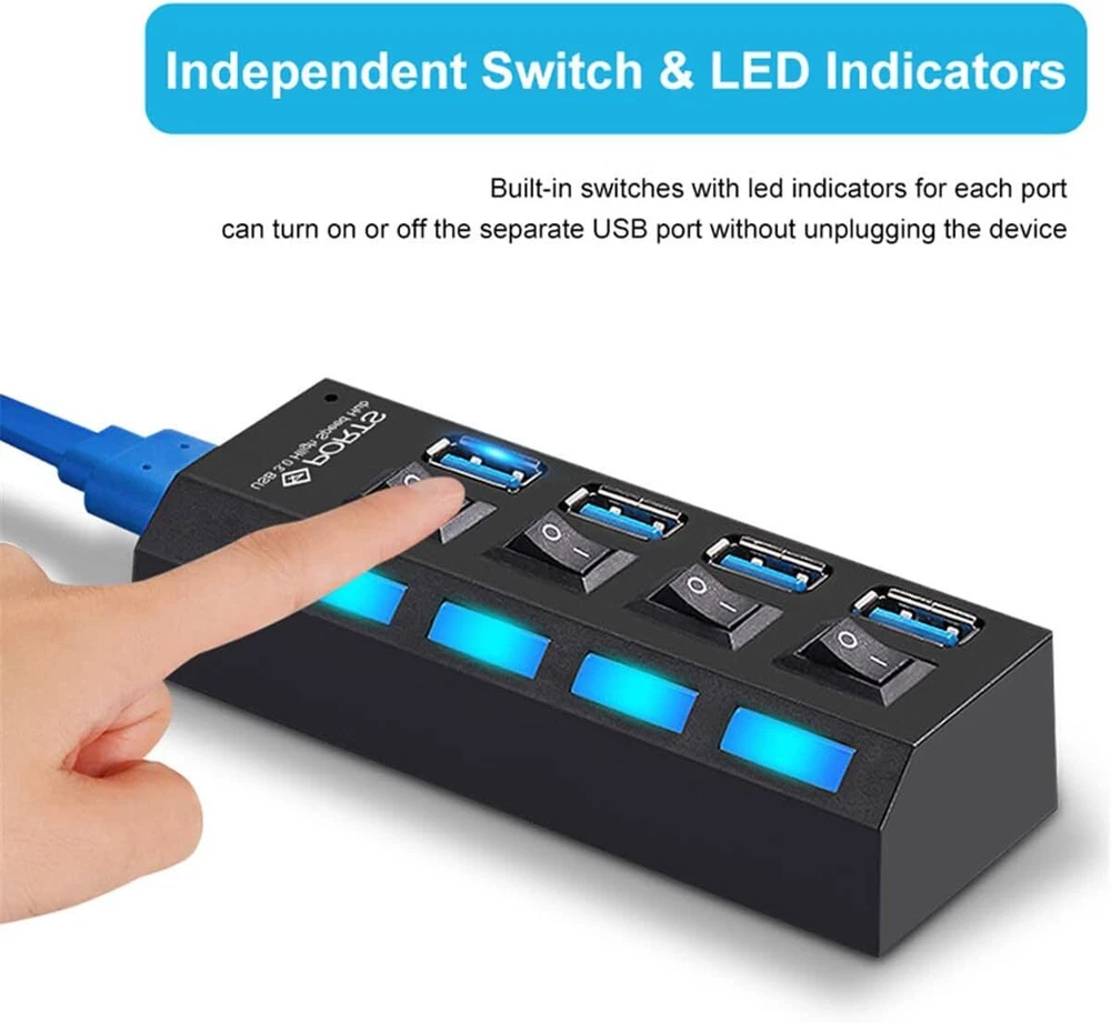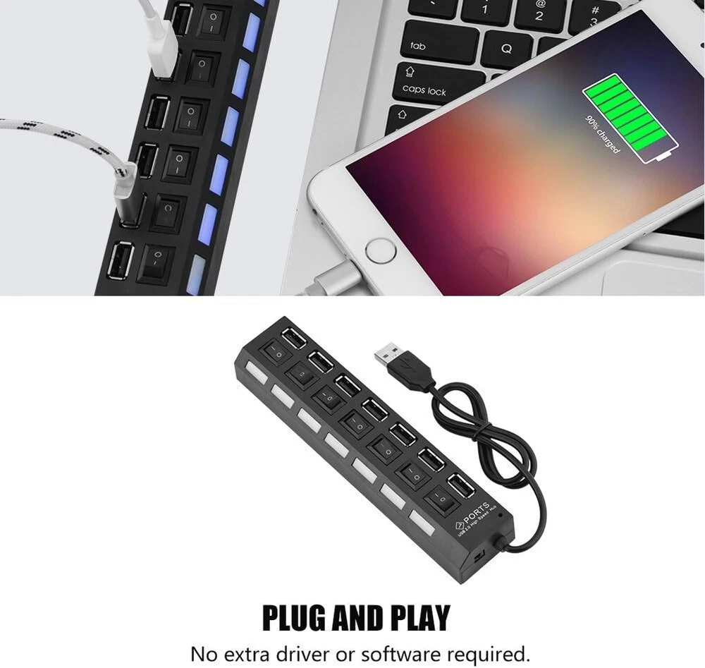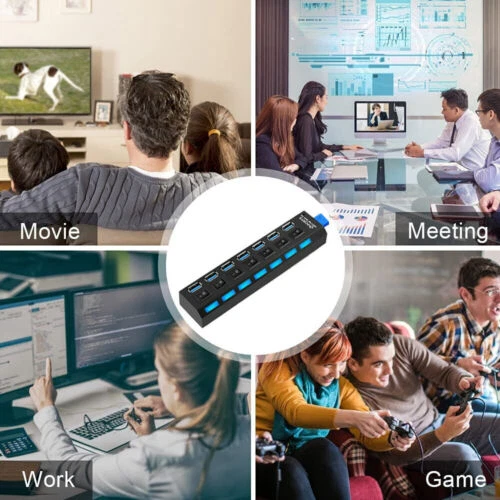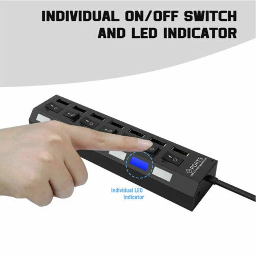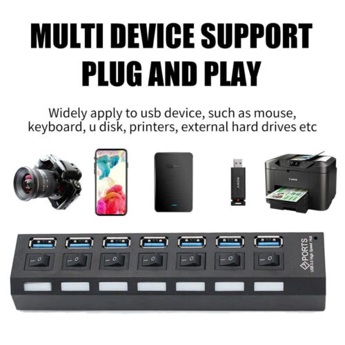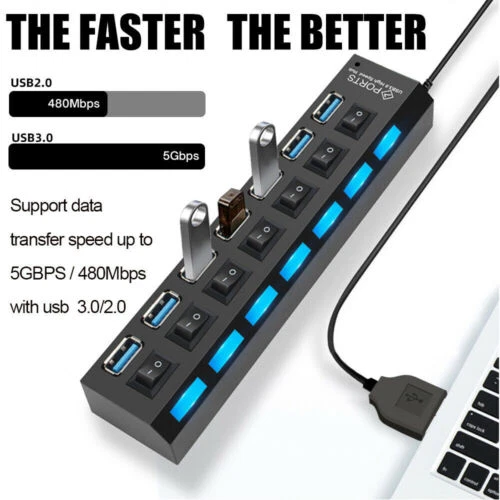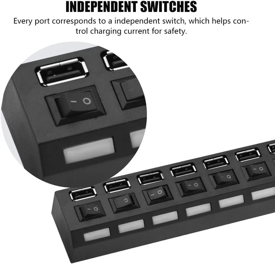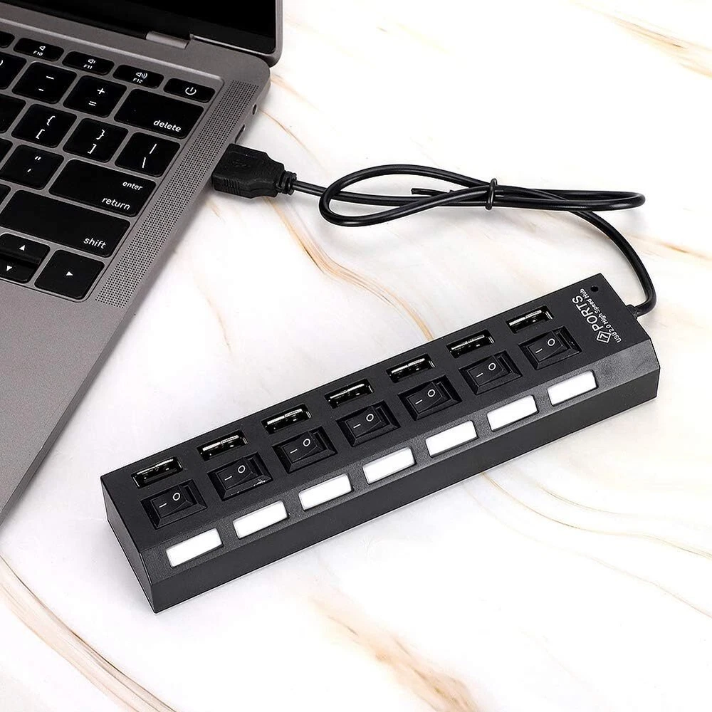 This USB hub is a game-changer for my workspace! The 7 ports with individual on/off switches make it super convenient to manage multiple devices without unplugging. The high-speed data transfer works flawlessly, and the sturdy build feels durable. Perfect for expanding connectivity on my laptop—no more struggling with limited USB slots. The included AC adapter ensures stable power, though it’s only for data, not charging. Works great across different OS versions. A must-have for anyone needing extra USB ports!