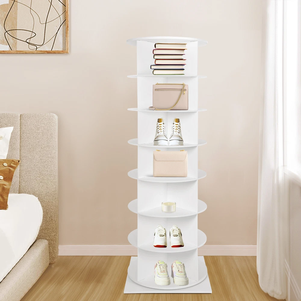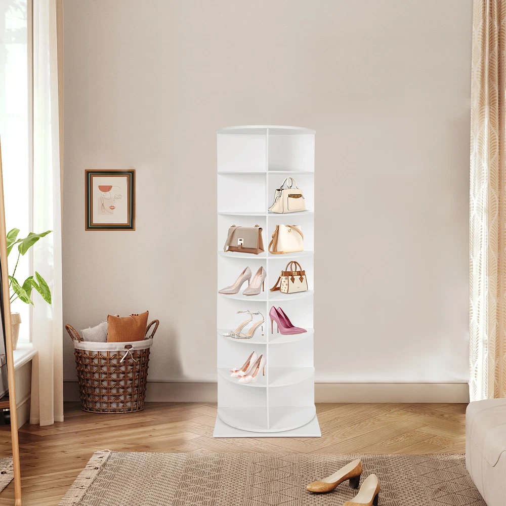 This rotating shoe rack is a game-changer for organizing clutter! The 7-tier design holds up to 28 pairs of shoes, plus it spins smoothly to save space. Sturdy stainless steel and PVC make it durable, and the freestanding design fits anywhere—entryway, bedroom, or closet. Love that it doubles as storage for bags, hats, or even small plants! Assembly was quick, and the white finish looks sleek. Perfect for maximizing space while keeping everything accessible. Highly recommend!