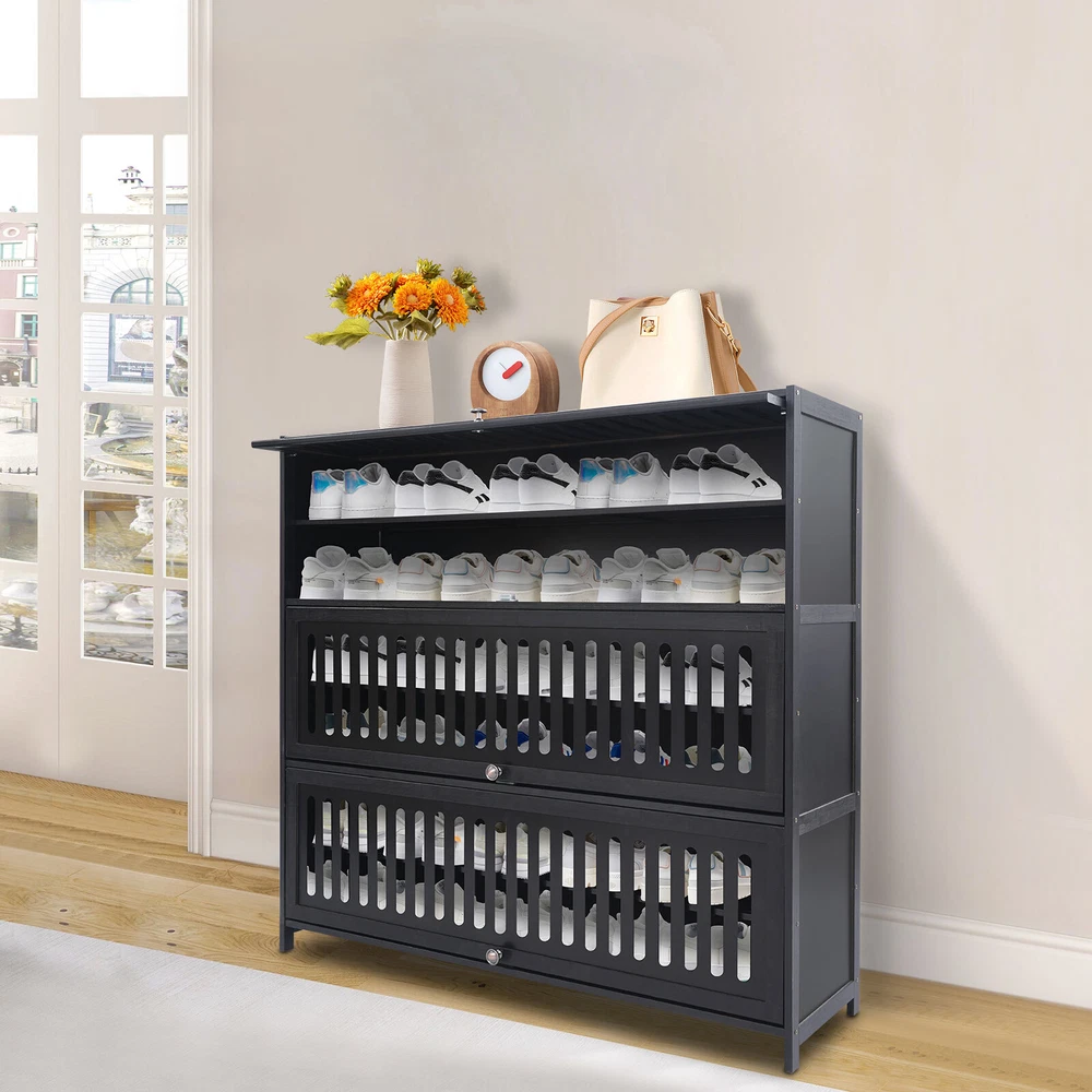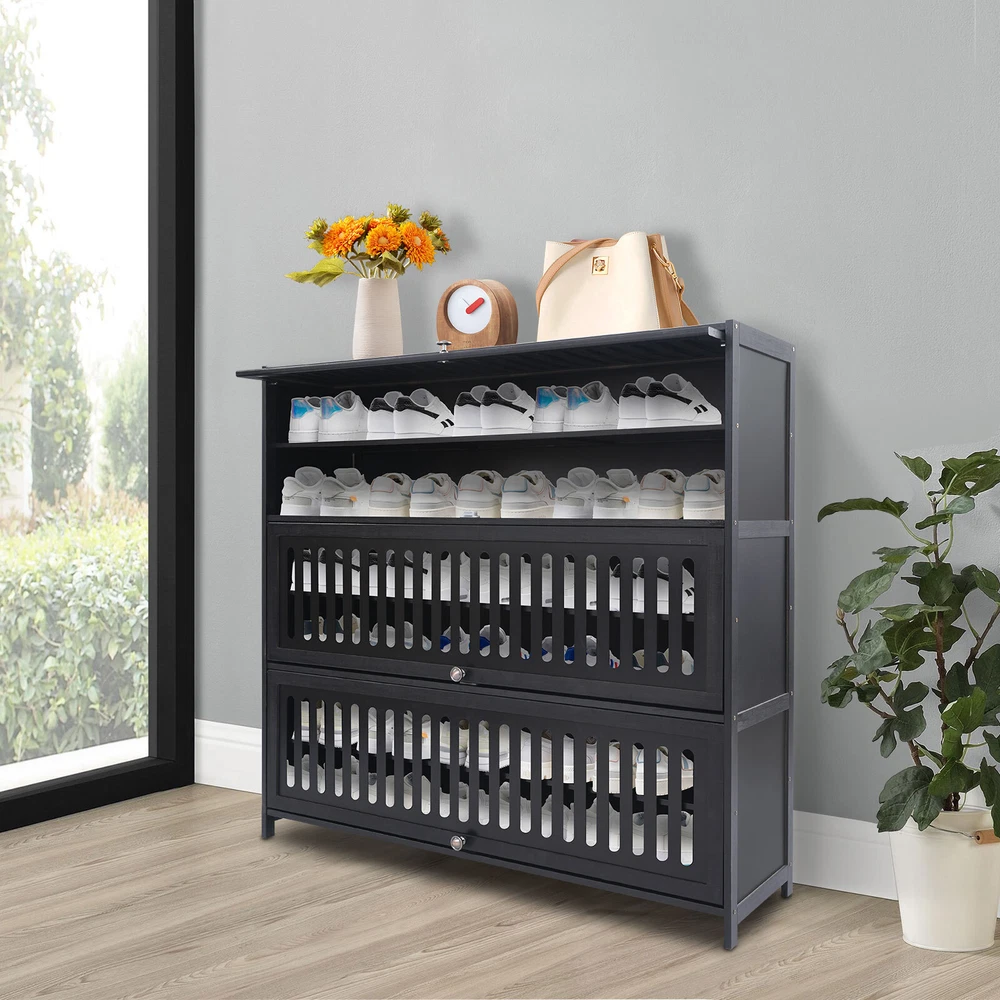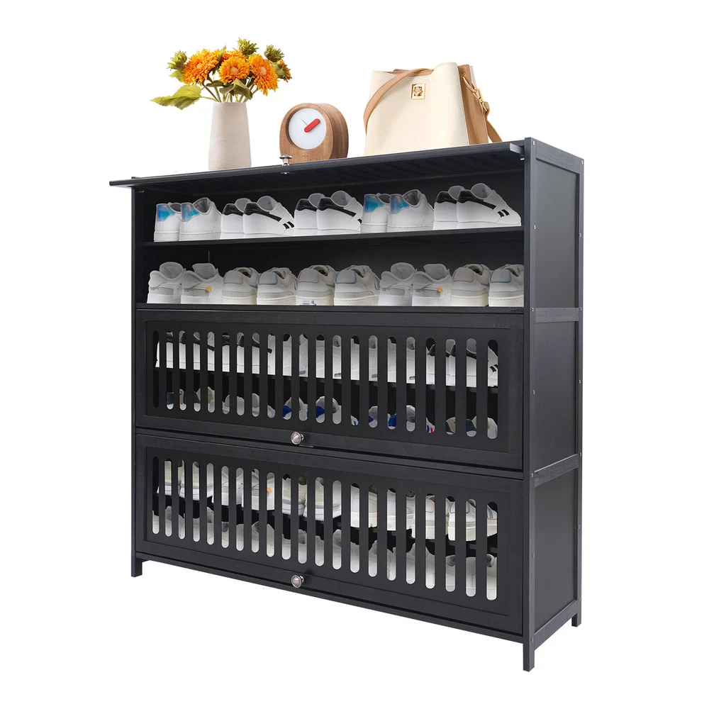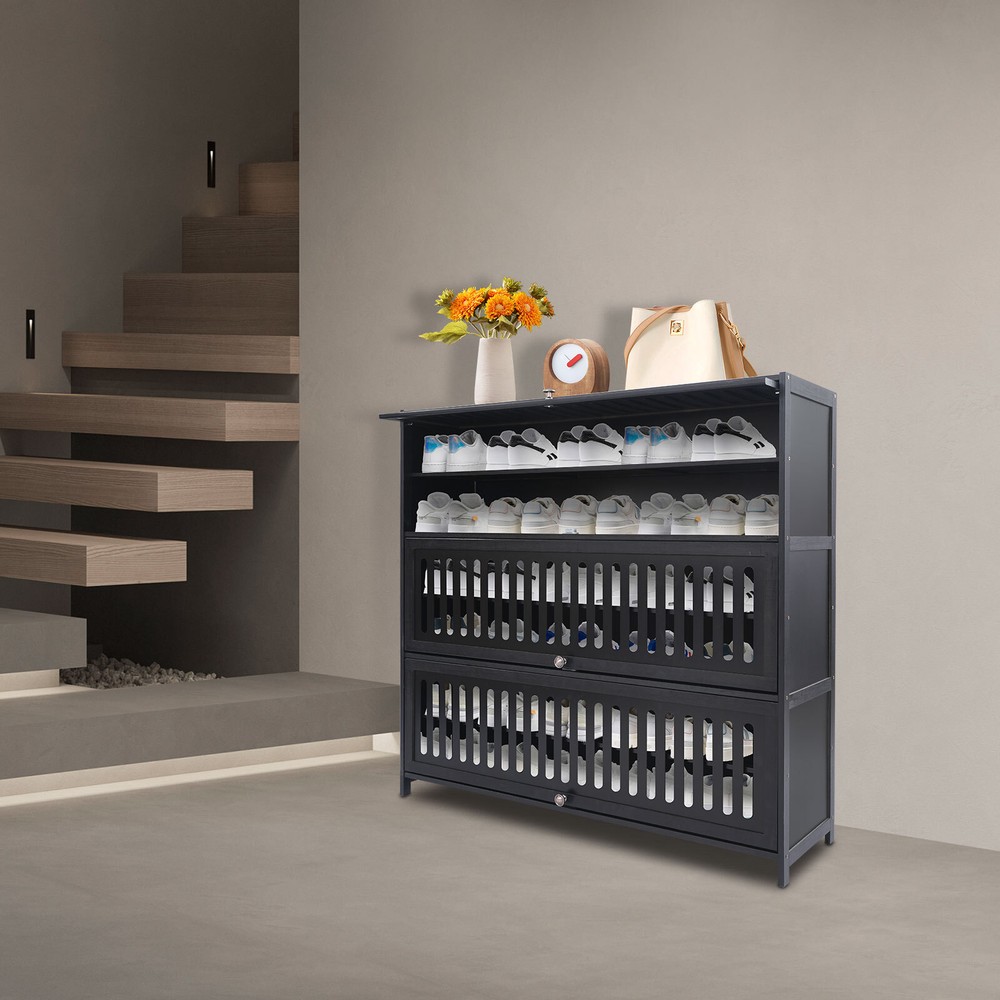 This shoe cabinet is a game-changer for small spaces! The flip-up doors save room, and the seven tiers hold all my shoes neatly. Assembly was straightforward, and the black finish looks sleek and modern. The bamboo and composite board feel sturdy, and each shelf holds a good amount of weight. Perfect for keeping my entryway organized without sacrificing style. Love how it maximizes vertical space—great buy!