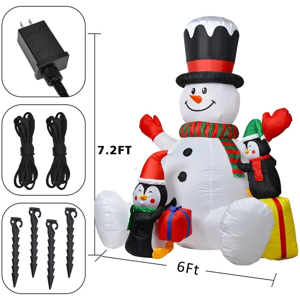 7Foot Inflatable LED Lighted Snowman and Penguins Bring joy and happiness to you and your family! -Internal Rotating 7 Color Changing Lights and 3 LED lights gently illuminate the snowman, creating a soft, ambient glow. Soft lighting on the surface offers a perfect nighttime display, bringing joy to your family and friends. With built in inflation fan, you can easily inflate and set up the snowman for indoor or outdoor use. Deflates compactly for storage between yearly use during the holidays. -Perfect decoration for parties, lawns, Christmas and holidays! Can be used both indoor and outdoor! -An eye-catching decoration that requires a minimum of effort to set up, lighted design makes it perfect for your nighttime display. -Both for indoor and outdoor use. Perfect for creating a fun, memorable scene in your home or on your lawn during the holiday season. -Quickly inflates or deflates. Once deflated, it's compact design makes storage easy and allows it to be stored almost anywhere. Product Specification: Material: Polyester Condition: 100% Brand New Pattern: Snow man, Penguins Item Weight: 4.8lbs Package Include: 1 x Inflatable Decor 4 x Ground Stakes 2 x Ropes 🎄⛄Christmas Inflatable Snowman-7Foot christmas inflatable snowman and 3pcs penguins comes with interior Rotating 7 Color Changing Lights and 3 LED Lights to gently illuminate for a soft, ambient glow and bring joy and happiness to your neighbors, friends, and family for extra holiday cheer. 🎄⛄Perfect for Indoors and Outdoors:-Enjoy an excellent Christmas party both at home and outdoor. Great for Christmas Themed Party, Indoor and Outdoor Decorations, or yards Decoration! memorable scene in your home or on your lawn during the holiday season. 🎄⛄High Quality Decoration- Made of high quality waterproof polyester with chemical resistant and non-nasty smell, can be used indoor/outdoor. Deflates back down for easy storage for next Christmas. 🎄⛄ Christmas Inflatable Snowman-7ft inflatable Snowman say hello to you when you come at the door, it will self-inflates in seconds when the blower works, it also easy to deflate and storage.Inflatable Snowman is biggest and most attractive inflatable Christmas decorations around. 🎄⛄Easy Setup and Take-down- Package include 4 ground stakes, 2 ropes and 1 built-in fan. Self-inflates in seconds with built-in fan when plugs into standard electrical outlet. Stakes and tethers