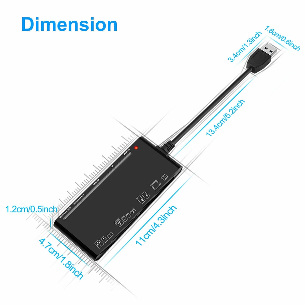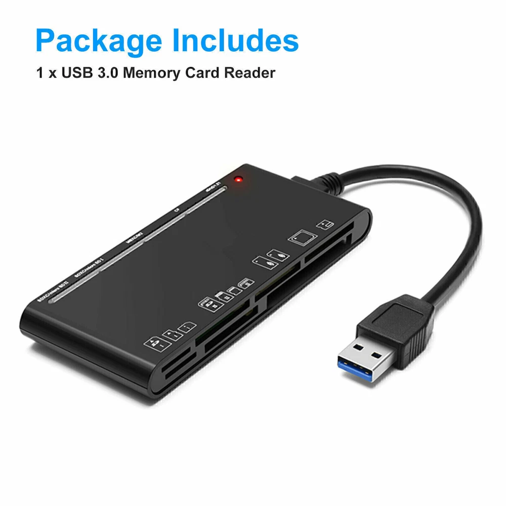 You Might Also Like USB Cable Male to Female with Switch ON/OFF Extension Connector Raspberry 6.31 USD 7.01 USD Free shipping 10% off 12PCS Round NTAG215 NFC Tags Blank Cards RFID Waterpoof Chip for TagMo Amiibo 6.82 USD 7.58 USD Free shipping 10% off Motherboard USB2.0 to USB3.0 Computer Hardware Adapter Plug Adapter Connector 6.67 USD 7.41 USD Free shipping 10% off USB Smart Card Reader DNIE ATM CAC IC ID SIM Card Reader for Windows Linux 10.13 USD 11.26 USD Free shipping 10% off Type-C To Magsafe 3 Converter USB-C Magnetic Adapter For Charging Plug Mac New 13.05 USD 14.5 USD Free shipping 10% off 1.5mm Thick Double Domed Mineral Watch Crystal 30mm-38mm Diameter Concave Glass 6.65 USD 7.39 USD Free shipping 10% off For NZXT Kraken ELITE 240/280/360 14-Pin Liquid Cooler Connector Cable Cord Wire 22.38 USD 24.87 USD Free shipping 10% off USB Magnetic Headset Charger Charging Base Cable Cord For Aftershokz Shokz AS800 6.62 USD 7.36 USD Free shipping 10% off 40*40mm Thermoelectric Power Generator Peltier TEG Module High Temperature 150℃ 7.66 USD 8.51 USD Free shipping 10% off 2-Pin Universal USB Data Charging Cable Magnetic Charger For Smart Watch 2.84mm 6.22 USD 6.91 USD Free shipping 10% off Car LED Digital Voltmeter Battery Tester Voltage Meter Gauge Universal 12V-24V 7.44 USD 8.27 USD Free shipping 10% off Watchmaker Tool Replacement Closing Mainspring Barrel Covers Watch Repair Tools 7.77 USD 8.63 USD Free shipping 10% off Product Description If you have any questions, please contact customer service first, do not open disputes easily, thank you! Features: 7 in 1 Adapter USB card reader for PC/camera, USB 3.0 card reader easily expands SD, Micro SD, CF and MS slots slot on your computer, laptop. It supports CF card, high-speed CF (UDMA), SD card, SDXC (up to 2 TB), SDHC, micro SD, micro SDXC, micro SDHC, MS, M2, xD memory cards. Read and Write on 5 cards simultaneously. USB 3.0 SD card hub adapter support SD/Micro SD card up to 512G Which 10x faster than USB 2.0 (480 Mbps), Transfer high-resolution HD movies, images and video recordings to your computer faster and more efficiently. Also backward compatible with USB 2.0, 1.1 and 1.0 Compact USB card reader is a great kit for travel. Multi-Card Reader Adapter comes with reinforced usb 3.0 cable, sturdy exterior and heat-resistant connectors ensure high data transmission efficiency and ultimate durability. 13CM USB removable cable tail would reduce stress on the USB port on your computer and won't affect the use of adjacent ports. Multi-In-1 Card Reader build-in USB 3.0 connection, compatible with for Mac OS(for macbook pro/for macbook air), for Linux, for Chrome for OS, for Windows XP/ for Vista/7/8/8.1/10 and etc. LED indicator will be ON when the card reader is connected to computer. Square chip card reader automatic detection of memory cards. Top technology effectively avoids over-current, over- voltage, short circuit, etc. Effectively protect the connected equipment and the hub itself. Specifications: Hardware Interface: USB 3.0 Number of Ports: 7 Data Transfer Rate: 1 Megabits Per Second Compatibility SD slot: SD / SDXC / SDHC / Extreme I III SD / Ultra II SD / MMC / UHS-I Compatibility TF slot: Micro SD / TF / Micro SDXC / Micro SDHC / UHS-I Compatibility CF slot: CF I 3.0/4.0 /Extreme I III CF / Ultra II CF / HS CF / XS-XS CF / CF Elite Pro / CF Pro / CF Pro II. Compatibility MS slot: MS / MS PRO / MS PRO Duo / MS PRO-HG / MS XC DUO Compatibility XD slot: XD / XD1.21 Package Include: 1 x USB 3.0 Memory Card Reader About Us We accept all payments authorized by eBay. powered by