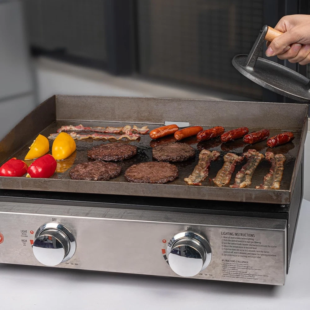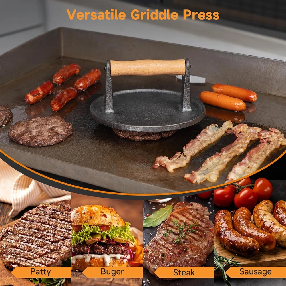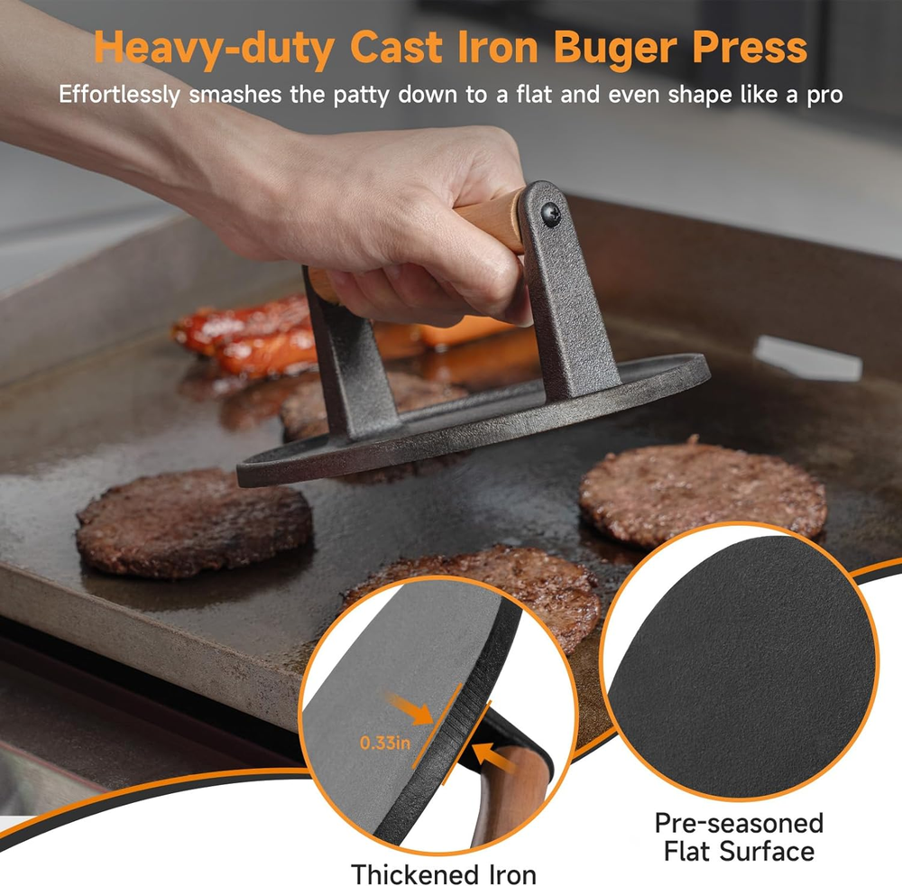 7" round Burger Press Accessories for Blackstone Griddle Indoor Outdoor Cooking 7" Burger Press: This 7" burger press could cook two flavorful burgers or patties at once, reducing cooking time Heavy Duty: The pre-seasoned cast iron press enhances the culinary effect and easily smashes the patty down to a flat patty shape like a pro Heat-Resistant: The ergonomically elevated wooden handle ensures a safe and comfortable grip without fear of burns Versatile Use: Enjoy grilling delicious burgers, bacon, steaks on griddles, frying pans, flat-top grills, etc Easy to Clean: Easily wash with water or toss it directly into a dishwasher. Simplify your post-meal cleanup Product Description Ergonomic Wooden Handle Enhanced safety and comfort with heat-resistant and elevated handle. Heavy-duty Thickened Press Effortlessly smash the patty to a flat patty and improve the cooking efficiency. Pre-seasoned Bottom Non-stick and rust-resistant for cooking perfect, flavorful patty burgers. Item Weight 2.2 pounds Item model number 01CBA091_AM01US09 Product Dimensions 7 x 7 x 3 inches Size 7 inch, Round Shipping Fast shipping is very important for us. Our expedited US shipping service is FREE. Your order will be shipped within 2 business days upon full payment received. Your order will be delivered within 2-3 business days after the handling time. Warranty & Returns 30-Day FREE Return Policy offered for unsatisfactory items. Options include: Refund or Exchange for another item. Contact us Customer satisfaction is our top priority. If you encounter any issues with our product, please don't hesitate to reach out to us. We are committed to ensuring your satisfaction and will go above and beyond to assist you. Your happiness is our goal! Thank you for shopping at our store.