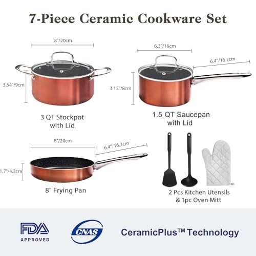 All-in-One High-Quality Kitchen Pots and Pans Set Discover the perfect solution for your everyday cooking needs with our versatile non-stick pot and pan set, designed for compact kitchens. Set Includes: 8" Non-Stick Frying Pan 1.5 Quart Saucepan with Lid 3 Quart Casserole Pot with Lid 2 Nylon Kitchen Utensils (Turner + Spoon) Nonstick Ceramic Cookware Experience the joy of cooking with our long-lasting ceramic nonstick coating. Enjoy healthier meals with minimal oil, as food effortlessly glides off the surface. Our cookware is EUROFIN approved and 100% free of PFAS, PTFE, PFOA, lead, and cadmium. Cleaning is a breeze—simply rinse or wipe with a damp paper towel. Premium Cooking Pan Set This aesthetically pleasing cookware set features a rustic copper color and a functional nonstick ceramic interior. It comes in an elegant gift box, making it an ideal choice as a cookware starter set for family use or house-warming gifts. Stovetop & Oven Safe Crafted from heavy-duty aluminum, this nonstick cookware heats up quickly and evenly. It is compatible with all cooktops including induction, gas, electric, and ceramic. Our non-toxic cookware set is oven and broiler safe up to 550°F, offering more options for cooking and baking. Stainless Steel Handles The ergonomic stainless steel handles are non-slip and easy-to-grip. For safety, we recommend using a glove when heating on a gas stove. The durable glass lids come with steam vents for a clear view of your food while cooking, locking in the best taste.