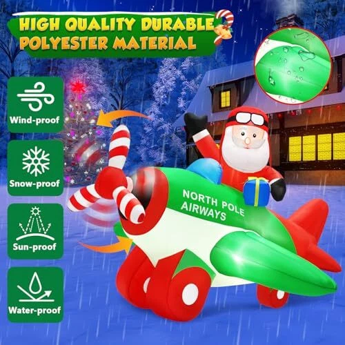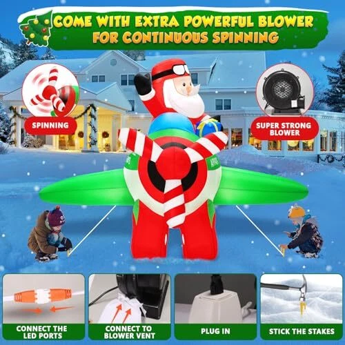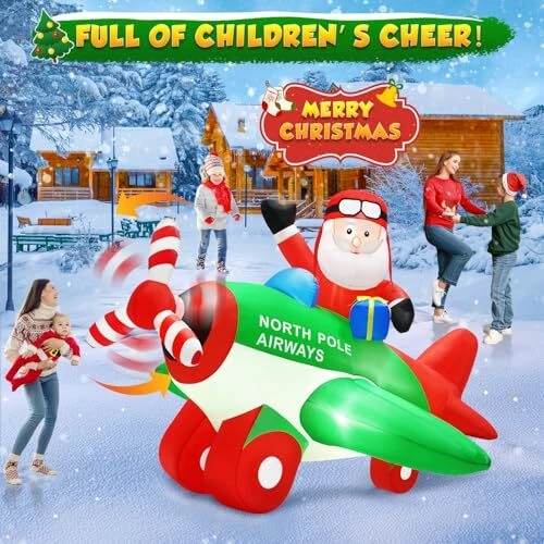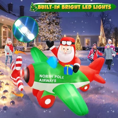 30 Days Return Policy Fast Delivery Trusted seller 7x6.5FT Christmas Inflatables Decorations Santa Claus on Animated Airplane, Christmas Blow Up Decorations Outdoor Flying Polar Airplane Plane Built-in Bright LED Lights for Xmas Holiday Party Product Description 【7x6.5FT Eye-catching Christmas Inflatables Santa Claus on Animated Airplane with spinning propeller and LEDs】 7FT Christmas Decoration Santa Claus Flying a Polar Airplane carrying a gift box, with the spinning propeller seems like the plane is about to take off to deliver presents. Built-in bright LEDs lights instantly light up your yard and easily attract the attention of your neighbors specially children, makes your yard full of children’s cheer! 【Extra 180W Powerful Stronger Blower for Continuous Spinning and Stable】Our upgrade feature above others is that we equip it with a 180W upgraded powerful blower (equal to 5 times the power of other) that can keep the propeller Spinning continuously! And ensure the Christmas inflatable outdoor decoration self-inflate within 1 minute. The attached stakes, ropes and a sandbag can fix the inflatable Christmas decorations on the ground and stay firmly. 【Unique Santa Flying Airplane Appearance Creates Pleasant Christmas Atmosp】The 7FT Christmas decorations outdoor Santa on airplane with a gift box to celebrate Christmas holiday with your guests and family. The vivid design and built-in LEDs create a cheerful atmosp, perfect Christmas photo spots in the garden, and make your house become more popular and unique at Christmas.(Note: Please connect the connection ports that the blower and the LED light.) 【Waterproof & Tear-proof Material for Outdoor Use】 Christmas blow up yard decorations is made of high-quality durable thicken polyester, airtight excellently for full inflation and not easy to be pierced by hard things, weatherproof and fade resistant, suitable for indoor or outdoor use. Even in poor weather, it will not be blown down easily. 【Perfect Merry Christmas Gifts for Christmas Eve Night】The Christmas decorations inflatables create a charming centerpiece for your Christmas display, and attracts both grown-up and younger to take photos and give them an unforgettable night, perfect Christmas gifts for Christmas Eve activities, Christmas Party, and More. Enjoy Christmas with your family! Shipping Returns Payment Shipping Shipping is FREE to all addresses other than APO/PO boxes in the lower 48 states. All our stock ships from US-based warehouses. Shipped via USPS or UPS (depending on location and package weight) Unless stated otherwise, all orders will ship within 24-72 hours of your payment being processed. Check our feedback to see the great reviews of FAST shipping we offer. Returns As our valued customer, we will do our best to make sure the product you receive arrives to you on time and as expected. If you are not satisfied with your purchase, please contact us within 30 days of receiving your order to process a return. Payment We currently accept payment via eBay managed payments only. Once payment is cleared, we will dispatch your shipment within 1-3 business days. Please refer to the "Shipping" tab for more information regarding shipping speed to your destination.