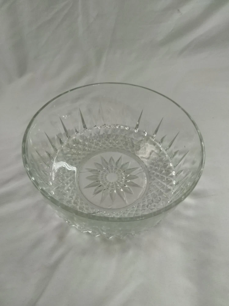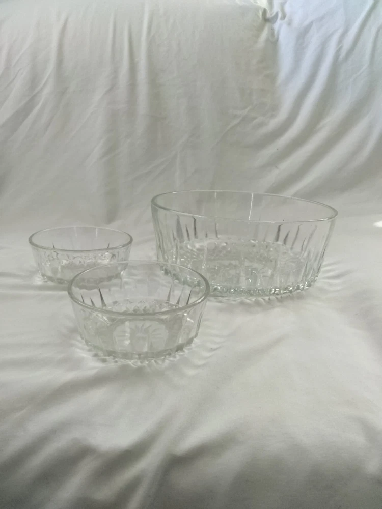 Set of 3 decorative clear glass bowls with starburst and diamond pattern. The only Hallmark I am able to identify is U.S.A on bottom Large serving bowl is 8 inches across top and two smaller fruit bowls are 4" across Very nice