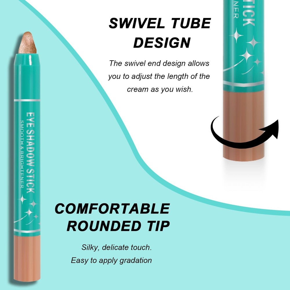1 【8 Professional Cream-to-Powder Eyeshadow Sticks】Create endless looks with buildable neutrals (Champagne) to bold metallics (Amethyst). Multi-functional formula works as eyeshadow base, smudge-proof eyeliner, and shimmer highlighter - perfect for natural day looks to glamorous night transformations. 【10-Second Smoky Eyes & 80% Faster Application】Achieve salon-quality results in 3 swipes: outline with precision tip, blend with sponge end, set with fingertips. High-pigment, crease-resistant formula requires no brushes - ideal for makeup beginners and busy professionals. 【24H Waterproof Wear + Skin-Nourishing Benefits】Humidity-proof formula withstands tears, sweat, and 85%+ humidity without fading. Enriched with Vitamin E & Jojoba Oil to moisturize eyelids while preventing creasing - comfortable for lens wearers and sensitive eyes. 【Luxury Cream Texture & Twist-Up Convenience】Butter-soft sticks glide smoothly without pulling delicate eye area. No sharpening needed - twist-up design maintains hygienic application and perfect pointed tip for winged eyeliner looks. 【Perfect Gift- Premium Packaging】Velvet pouch-protected set with mirror-ready metallics makes perfect beauty gift for friend,wife,mother,dauther and makeup enthusiasts. Certified cruelty-free and vegan-friendly.