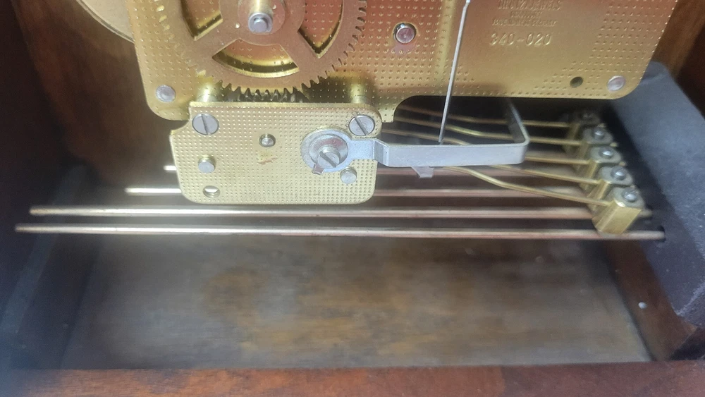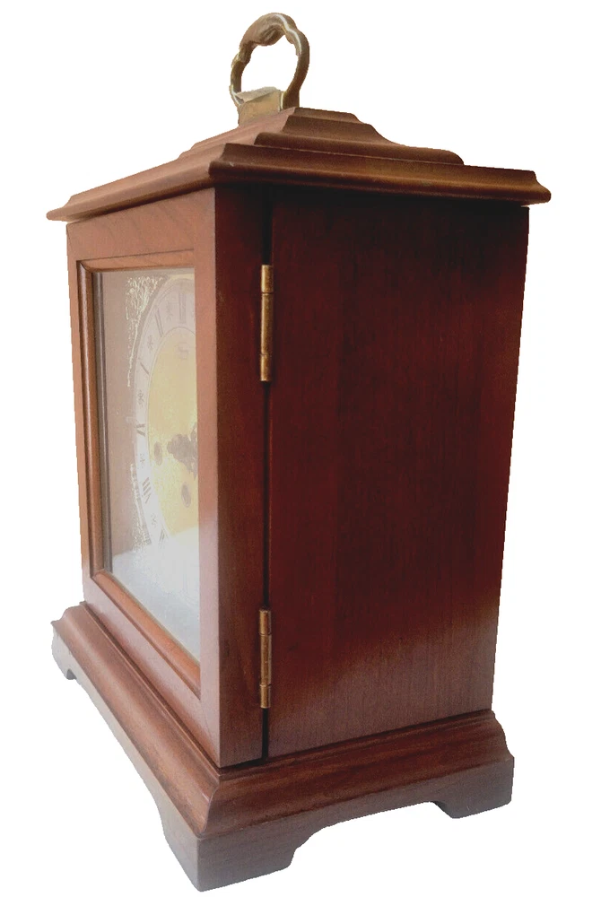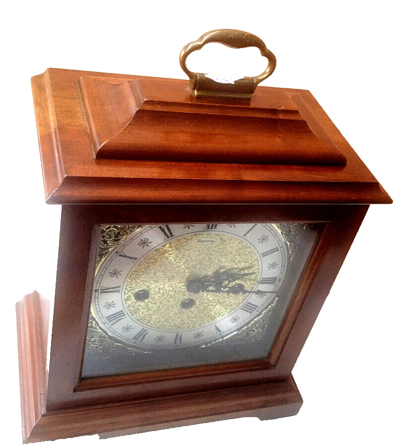 This 8-day Ridgeway Westminister Chime Bracket Clock is an eight day clock measuring 14 x 10 inches, with a 6 inch diameter roman numeral dial. It has chimes on each quarter hour, and also strikes the hours on the hours. The clock features a brass signed Hermle 2 jewel movement with a Westminister chiming sequence on each quarter hour and an hour gong strike. The clock is signed by the Ridgeway Clock Company, USA, and has a german signed Hermle Chiming Bracket Clock. It is an original piece manufactured in Germany. The clock is perfect for any room in your home, including the foyer, home office/study, guestroom, hallway, and dining room. It is selling with NO Reserve. If you are a collector, then make the adjustments on the striking, and have a wonderful clock throughout. Shipping is $65 within the contiguous USA. Good luck on the bidding. (4j31)