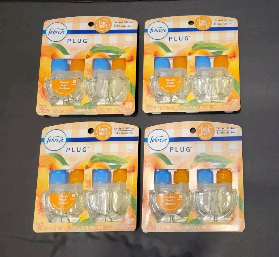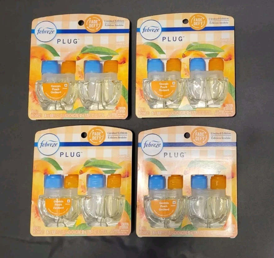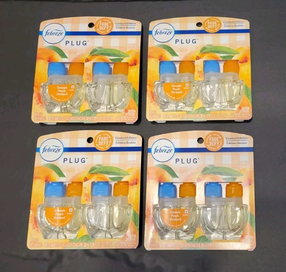 8 Febreze PLUG Georgia Peach Orchard oil refills ( 4 double packs) Ain’t odors the pits? Haul ’em away with Febreze PLUG with Fade Defy Technology Georgia Peach Orchard. The bright, juicy scent will have you lollygagging through a grove of freshness. Free shipping via USPS Ground Advantage