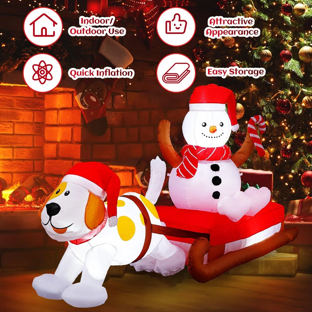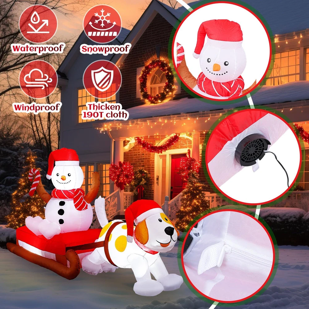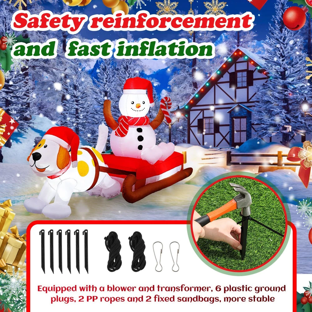 Features: Complete Combination: A full set of outdoor inflatable Christmas decoration installation components is provided. The Christmas inflatable is fixed to the ground with 6 windproof stakes, 2 ropes and 2 sandbags, allowing it to stand without support, no need to worry about it being blown away by the wind. Powerful blower and continuous airflow inflate the Christmas outdoor inflatable toys. Repeatedly durable: The inflatable outdoor holiday decorations are made of high-quality thick, waterproof polyester cloth, no need to worry about being blown away by the wind or damaged by rain. The outdoor inflatable Christmas decorations are durable and can be reused for a long time. Specifications: Material: polyester Color: multicolor Size: about 8 ft (L) Package Includes: 1 x Christmas Inflatables Decoration 1 x Blower 1 x Transformer 2 x ropes 2 x sandbags 2 x buckle 3 x LED light 6 x plastic stakes Notes: Manual measurement, there may be slight size errors. Due to different screen displays, there may be slight color differences. Magical Night Christmas Decoration: this is an 8-foot Christmas inflatable decoration of a puppy pulling a snowman on a sleigh; The puppy and the snowman are wearing red Santa hats, and the snowman is wearing a red scarf; It is cleverly integrated into Christmas, bringing you a lively and warm atmosphere of Christmas, and is loved by children and passers by Bright LED Light Design: the Christmas courtyard inflatable has built-in super bright 3 LED lights, which will make the interesting Christmas inflatable decorations look very real and conspicuous at night, becoming an attractive and decorative courtyard near you, setting off a lively and happy holiday atmosphere Durable Waterproof Material: The inflatable dog pulling snowman is made of 190T waterproof polyester cloth, and the pattern printing uses high-grade ink; Passed European ROHS test certification, waterproof, lightweight, and fade-resistant; Excellent stitching improves the durability of the inflatable outdoor holiday garden decoration Safety Reinforcement and Fast Inflation: equipped with 6 plastic ground plugs and 2 PP ropes and 2 fixed sandbags, it makes it more stable, and there is no need to worry that the Christmas outdoor decorations will fly away with the wind; The equipped fan is made of high-strength ABS plastic, And equipped with a transformer, plug and play, convenient and fast, fast inflation speed, improves your installation convenience and experience Versatile Decoration Options: you can put our outdoor Christmas decoration yard on the front porch, living room, roof, terrace, garden, cafe, restaurant, hotel, shopping mall, party, celebration, to create a fun and memorable Christmas Eve holiday