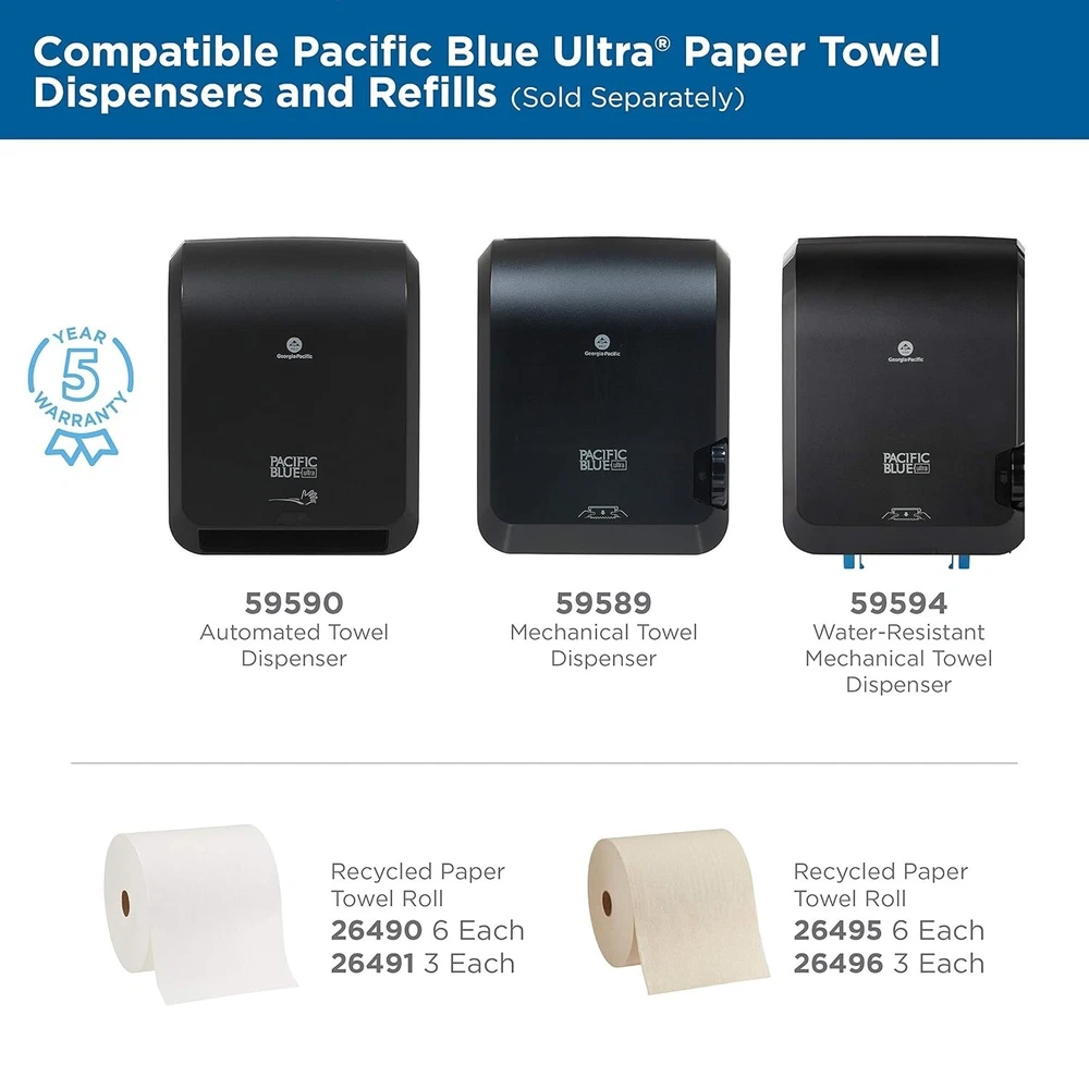Pacific Blue Ultra 8" High-Capacity Automated Touchless Paper Towel Dispenser by GP PRO (Georgia-Pacific); Black; 59590; 12.9" W x 9" D x 16" H; 1 Dispenser HIGH CAPACITY 1150-ft towel rolls last longer; helping to require less maintenance and minimize refill frequency ENHANCED IMAGE with attractive dispenser design that coordinates with other Pacific Blue dispensers EASY TO REFILL wall mounted towel dispenser designed with easy-access front cover that opens 180° DURABLE DISPENSER that protects against theft with a key lock and is backed by a 10-year warranty FLEXIBLE REFILL OPTIONS Choose between white or brown paper towels and 3-Roll or 6-Roll cases COMPATIBLE WITH Pacific Blue Ultra Roll Paper Towels 26490; 26491; 26495; 26496