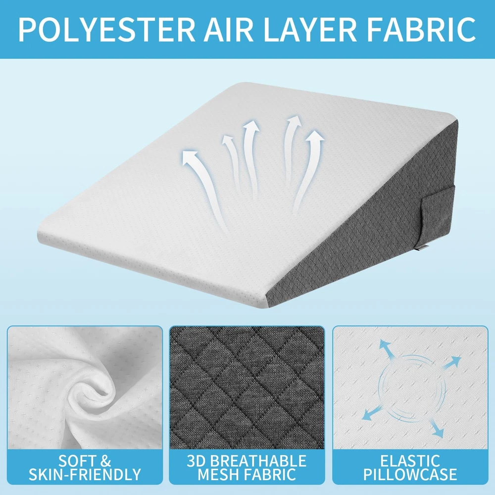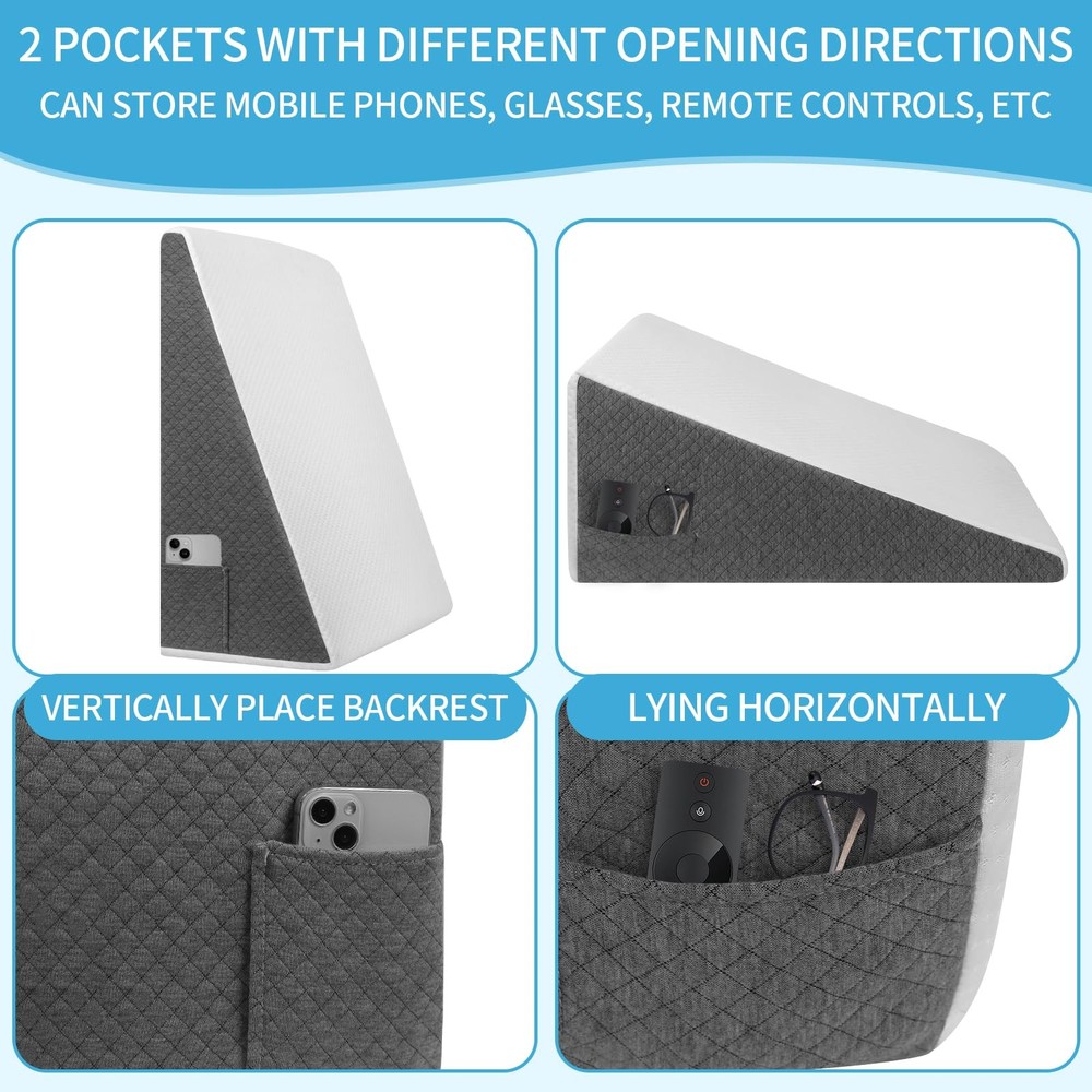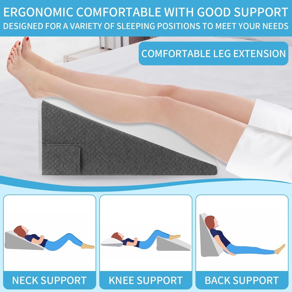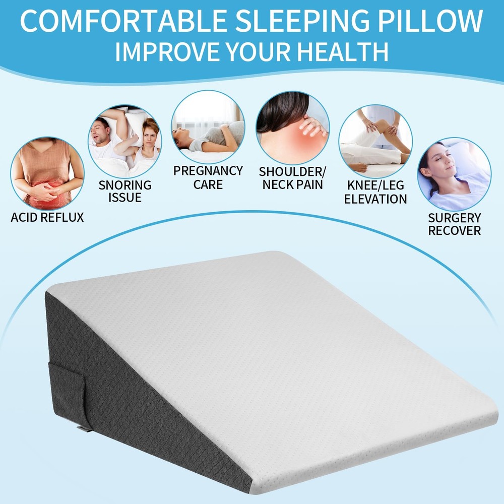 Wedge Pillow for Sleeping,8 inch Bed Wedge Pillow,After Surgery,Neck Pain,Snoring, Leg Elevation,Acid Reflux,Cooling Memory Foam Top,Breathable Triangle Pillow Wedge,Removable Washable Cover 【Ergonomic Design】wedge pillow combined with ergonomic design, its overall softness and height are very moderate, can relieve pressure on the whole body.It can improve sleeping position and provide you with maximum comfort. 【2 Layers of Comfort Foam】wedge pillow has two layers of premium comfort foam. The top layer is gel-infused memory foam, which keeps you cool and comfortable all the night. And high-density premium foam base provides sturdy support and durability. 【Applicable People & Muti-Purpose】The Wedge Pillow is perfect for head/back/knee/leg/foot elevation! It's ideal for increased circulation. Flip the wedge pillow vertically to read, listen to music, watch videos, play games in a comfortable seated position on the bed, couch or floor. 【2 Pockets Design】Our triangle pillow wedge features 1 pocket on each side with different opening directions to easily fit items such as glasses, remote controls or cell phones. 【Removable Cover】The soft breathable cover prevents too much heat from becoming trapped close to the skin.Its cover is removable and washable,its insert is not washable.