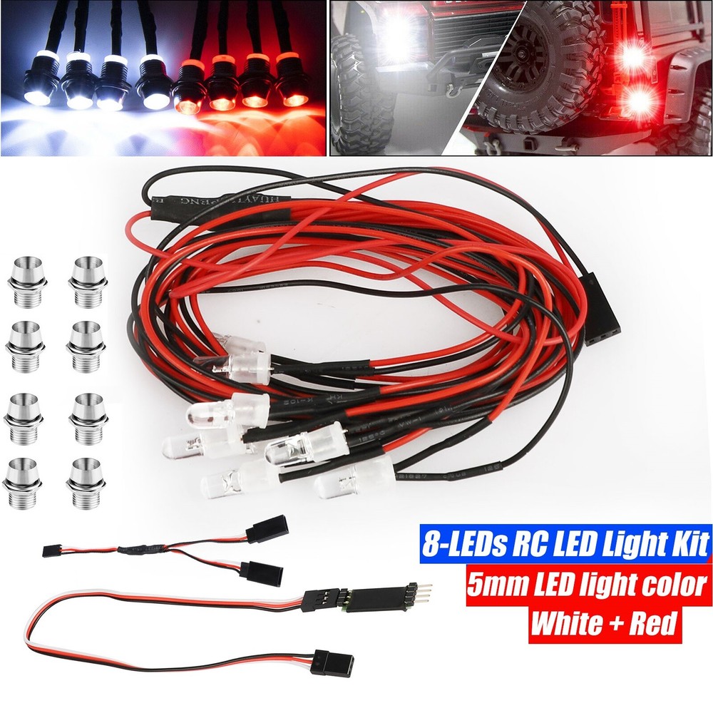 Product Feature 🔥💯 High-quality 8-LEDs RC LED Light Kit. 🔥💯This set includes 8pcs LEDs, 4 White LEDs, 4 Red Lights , and 1PC RC Remote On/Off Switch . 🔥💯Plug and play. Easily turn the LED lights On Or Off from your remote controller, making your RC vehicle more attractive and eye-catching. 🔥💯Directly powered by the receiver, for convenience to operate. 🔥💯Suitable for all kinds of RC car truck tank. like for Traxxas HSP Tamiya Redcat RC4WD Axial SCX10 and more. Product Specification Type LED Light Kit for RC Car SCX10 Material Plastic + Metal LED Size 5mm LED Light Color White + Red Suitable for all kinds of RC car truck tank Fit For Traxxas HSP Tamiya Redcat RC4WD Axial SCX10 and more Package Included 🎁4 x 5mm LED Lights Red 🎁4 x 5mm LED Lights White 🎁1 x RC Remote On/Off Switch