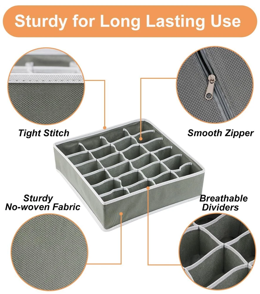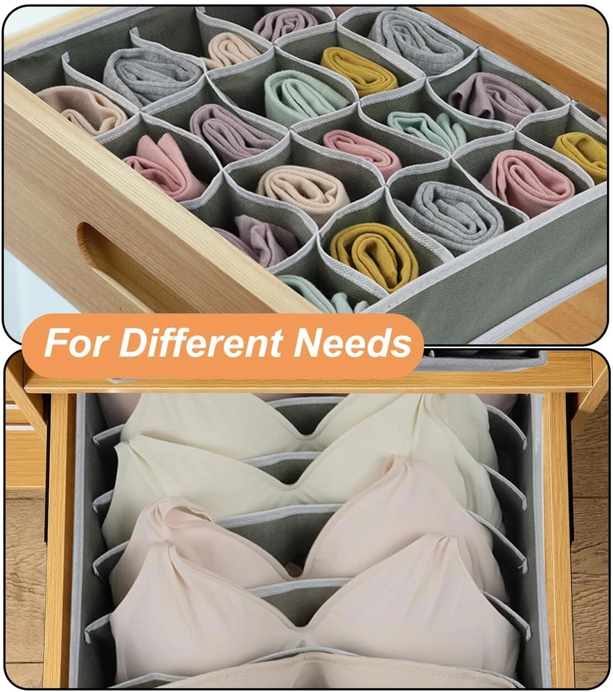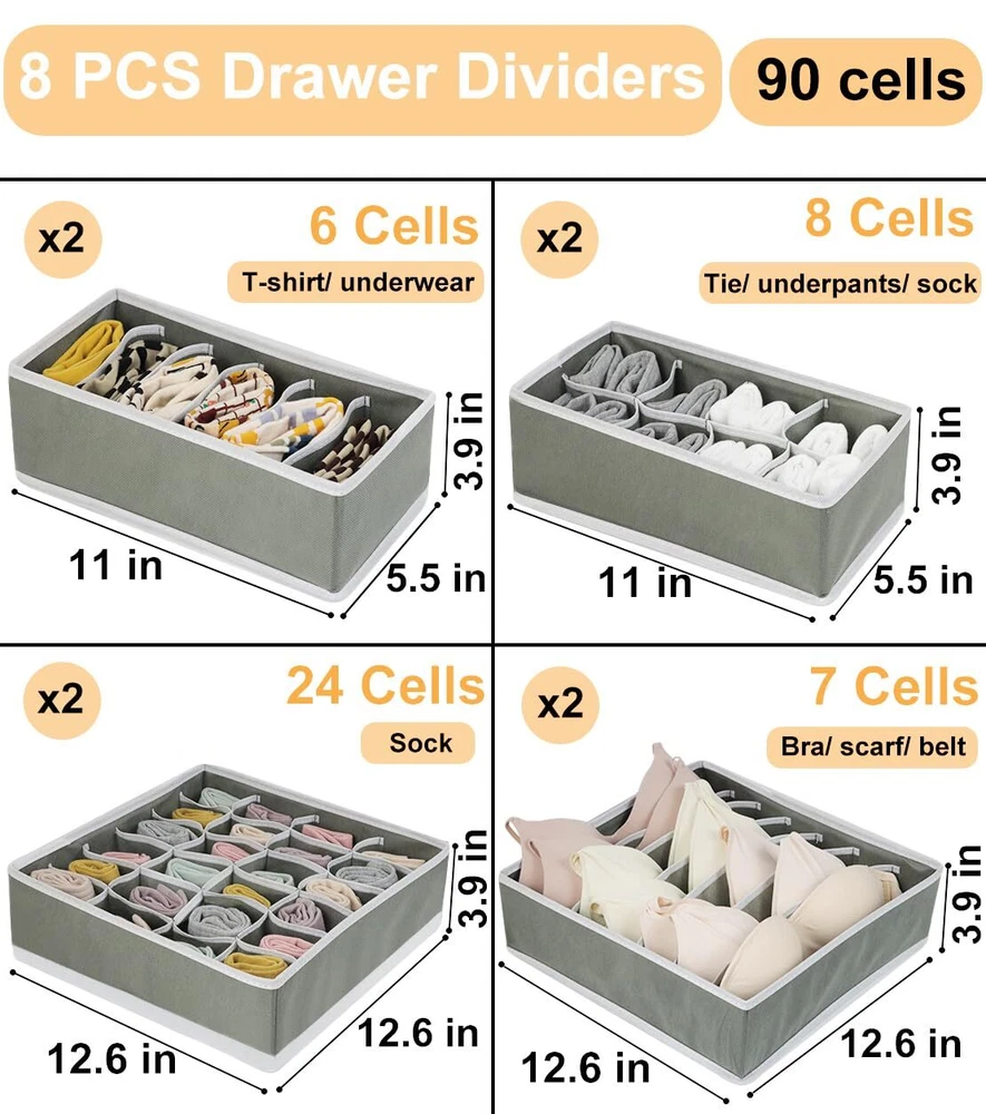 【MULTI USES CABINET ORGANIZER】Our drawer dividers are very suitable for wardrobe/ drawer/ table/ closet/ dresser and can underwear, bras, ties, socks, belts, scarves, t-shirts, towels, baby clothes, etc. Your closet and drawers won't be a mess anymore. 【DRAWER ORGANIZERS FOR CLOTHING】With our organizer bins, your drawer or wardrobe will be tidy and clean, greatly improving the utilization of your drawer space and helping you find what you want. This will greatly reduce the time spent searching for clothes. 【DRAWER ORGANIZER IN 4 SIZES】This 8-pack clothes organizer set includes 2 x 6-compartment T-shirt/underwear organizers, 2 x 7-compartment bra/scarf/belt/baby clothes organizers, 2 x 24-compartment sock organizers, 2 x 8-compartment tie/underpants organizer. 【FOLDABLE DRESSER ORGANIZER】The fabric drawer organizer is collapsible to save space when not in use, freeing up closet and dresser space for easy storage. When using them, just unfold them and zip them up the bottom. 【STURDY CLOSET ORGANIZERS】The dresser drawer organizers are made of breathable non-woven fabric, keeping the air flowing and clothes don't smell. This wardrobe dresser organizer with exquisite stitching is sturdy and can be reused for a long time. 【WHAT YOU WILL GET】8 pcs set: 2 x 6 compartment-11.03*5.52*3.94 inch/ 28*14*10 cm, 2 x 7 compartment-12.61*12.61*3.94 inch/ 32*32*10 cm, 2 x 24 compartment-12.61*12.61*3.94 inch/ 32*32*10 cm, 2 x 8 compartment-11.03*5.52*3.94 inch/ 28*14*10 cm, -year , and after-sales service.