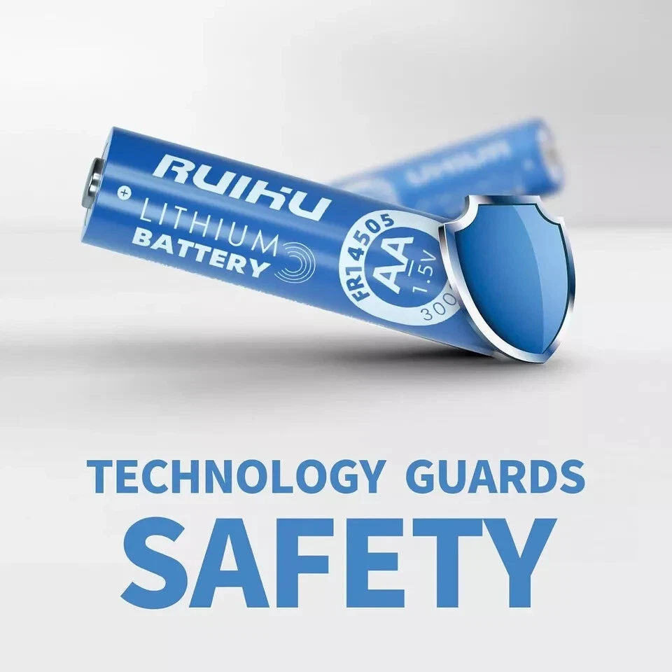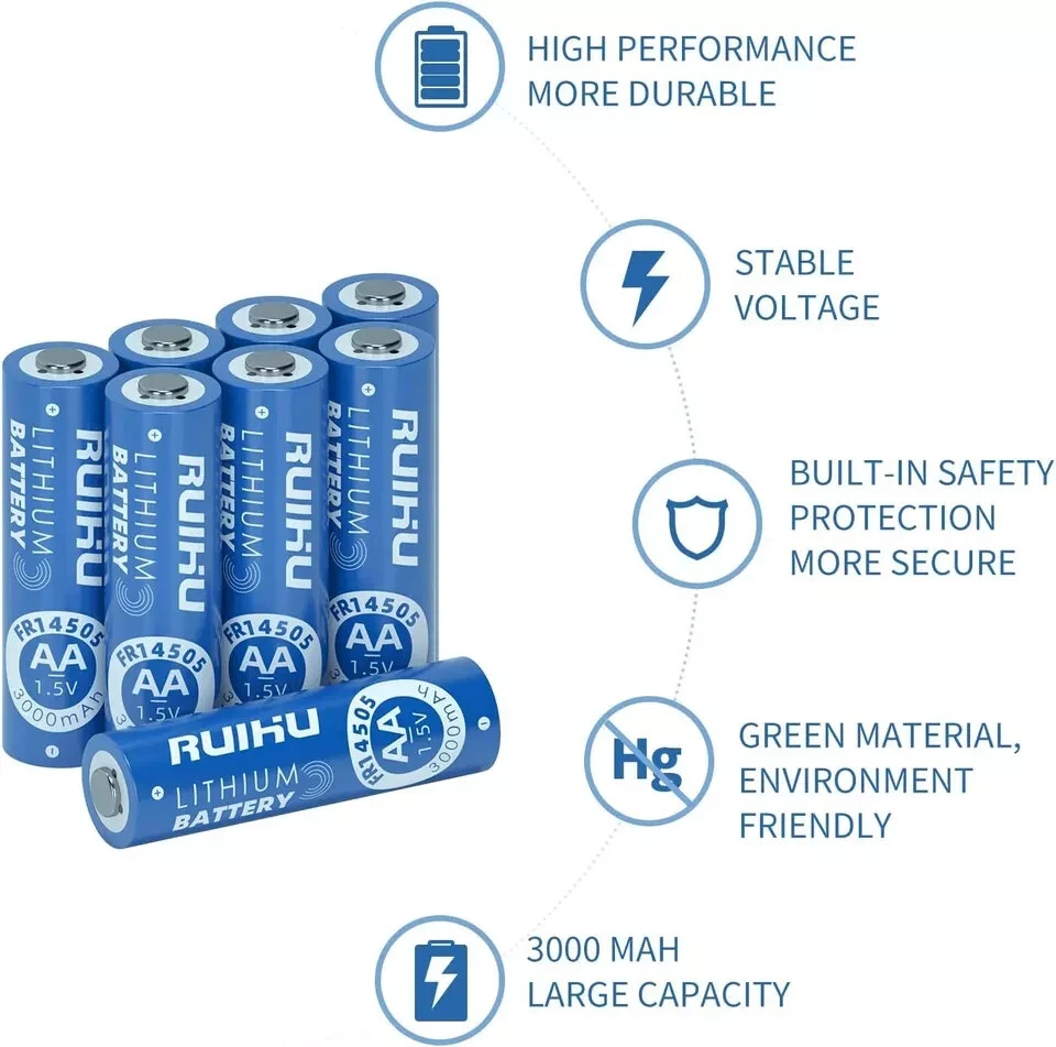 8 Pack Extended Long-Lasting Lithium Batteries for Blink Camera - 1.5V 3000mAh šćWarning & Caution!ćDo Not Recharge! This is a Non-rechargeable battery. šćWork with Blink CameraćThe Original batteries provided in Blink camera package are Energizer Lithium AA batteries(model: L91). Our RUIHU AA lithium batteries is same as Energizer AA lithium batteries, and they both are Li-FeS2 batteries. šćBasic Paramatersć8-Pack RUIHU AA Safe Lithium Battery 1.5V 3000mAh; 20 years shelf life with very very low self-discharge rate(<2% per year); Standard AA size with wide application. šćLong-Lasting & DurablećRUIHU AA Lithium Battery has high performance and constant output, using high-density materials to accumulate amazing energy. šćWide ApplicationćApplied for various devices, such as Clock, Camera flash, Remote controllers, Mouse, Keyboard, Radio, Baby toys, Toy car, Digital cameras, Smart door lock, Electronic toothbrush, Wireless microphone, LED flashlight, Emergency lamp, Cassette recorder, VR controller, Game controller... šćGood CompatibilityćCan replace various AA batteries, such as Alkaline batteries, Carbon batteries, NI-Mh batteries, NI-Cd batteries. Compatible with L91, FR6, LR6, R6, E91, AM3, LFB-AA, FR14505...Perfect for both high and low drain devices. šćNo LeakagećTriple safety valve, new spiral winding structure, the electrolyte is fully adsorbed to prevent leakage;Ruihu AA batteries escorts your high-end electronic equipment. šćAdapt to extreme temperaturesćWorks perfectly in extreme environments from -40ā to 140ā. Its cold resistance surpasses alkaline batteries and Ni-MH batteries, and is suitable for both outdoor and indoor use. šćSuper Innovative BatteyćRUIHU AA lithium batteries adopts new technology and unique Li-FeS2 material to keep the battery super long-lasting. The batteries show no memory effects and keep 1.5v constant discharge in 3000mah lithium cell. Item Specification Item model number AA Unit Count 8.0 Count Battery Cell Composition Lithium Product Dimensions 0.57 x 0.57 x 1.99 inches Country of Origin China Item Weight 4.7 ounces Batteries 8 Lithium Metal batteries required. (included) Recommended Uses For Product Indoor/Outdoor Number of Batteries 8 Lithium Metal batteries required. (included) Size Lithium AA-8 Count/Box