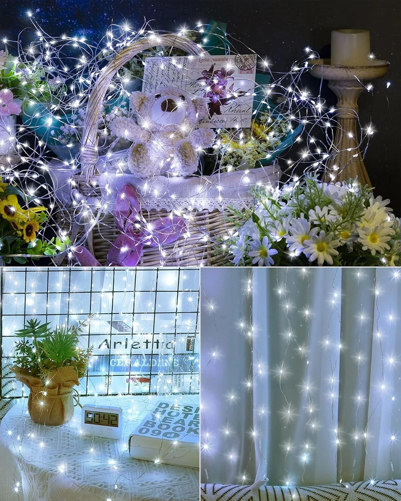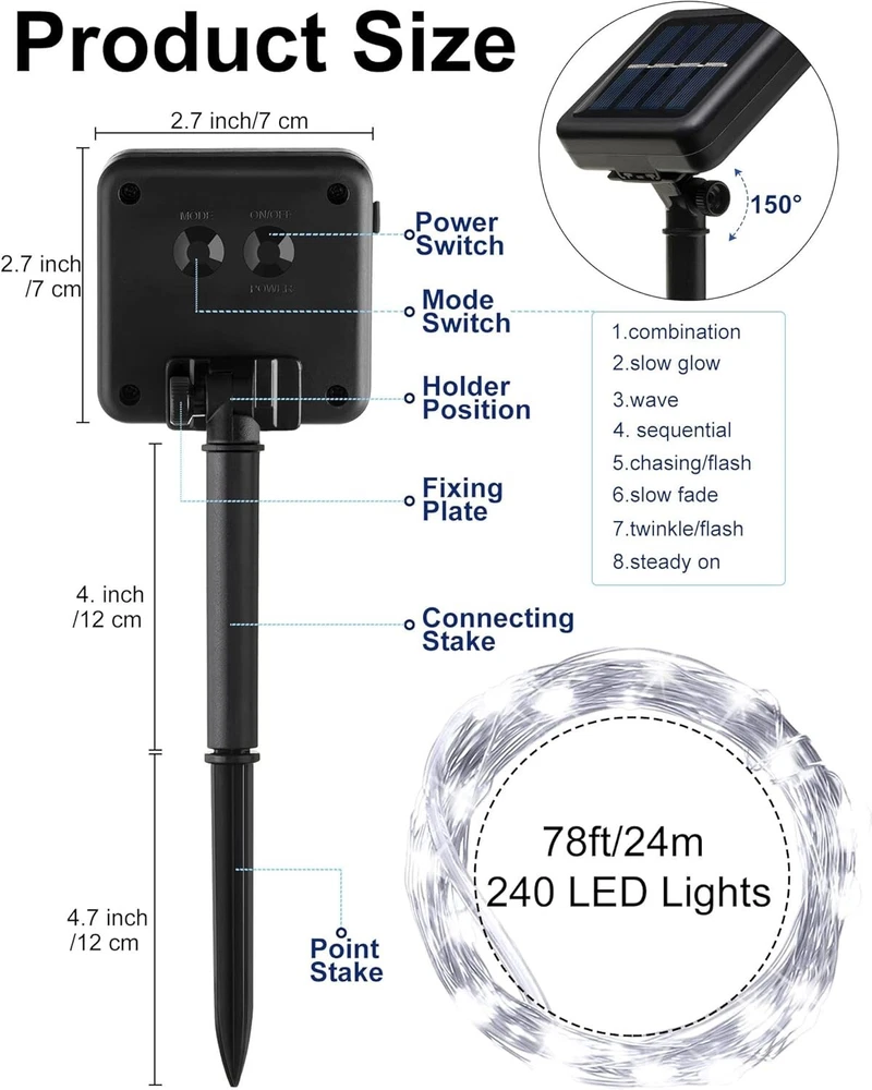 8 Pack Solar String Lights Outdoor Waterproof Each 240 Led 78ft Solar Fairy Lights Outdoor 8 Mode Led Solar Outdoor Lights Tree Lights Waterproof Copper Wire Lights for Tree Garden YardCool White Long Solar String Lights: you will receive 8 pack of LED solar string lights set, 624 ft in total, each string is 78 ft with 240 bright LED bulbs; There are 8 different lighting modes; The solar lights for trees is x 2 65 inches larger panel with 800mAh built-in battery, solar lights outdoor is more energy saving, convenient and practical 8 Lighting Modes: the solar fairy string lights have on/ off buttons and 8 different lighting modes; The on/ off button is easy to find and use; You can set the b mode at different times to meet your diverse decorative needs; You can also save your satisfactory mode settings by pressing the mode button; The built-in memory storage chip will keep your last setting mode for you to use directly next time Energy Saving and Efficient Solar Decoration: the outdoor tree lights adopt solar energy without additional charging operation; Solar string lights with 180 degree, adjustable solar panels, which can better absorb sunlight and turn into brighter lights to illuminate your yard; Charging is completed within 3 hours and can work up to 10 hours to make your night more beautiful and romantic IP44 Waterproof Function: the solar lights and panels have IP44 waterproof rank, which can resist rain and snow weather; Please do not immerse the panels in water; Waterproof copper wire lights are suitable for indoor and outdoor; You can DIY any shape you like to add atmosphere to your holiday life Wide Application: solar garden twinkle lights are a nice outdoor decoration; It can make you supplement external lights at night, let you see the beauty of flowers and the world, add atmosphere to your patio party; It is widely applied in hotels, gardens, balconies, holiday dinners, birthdays, Christmas and various parties