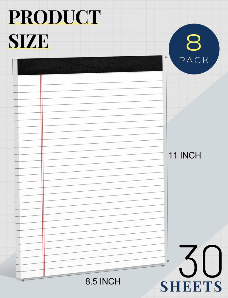 [ENJOY WRITING AGAIN]: The white legal pads 8.5 x 11 letter size lined paper has black lines and double red margin lines on left, legal-rule format provides plenty of space for your notes. Pads of paper smooth, premium-weight paper allows your ballpoints and ink gel pens to glide across the page. Legal pads 8.5 x 11 wide ruled writing stays on the surface and resists ink bleeding and show-through. The lined notepads 8.5 x 11 made of 70gsm paper material, thicker than average writing pads. [LINED LEGAL PADS]: Each package legal notepads 8.5x11 come with 8pcs white paper pads 8.5 x 11 lined spacing (11/32 inch) paper. These legal pads letter-size 8.5 in. By 11 in. Paper pads 8.5 x 11 perfect for writing notes, letters, thoughts. These lined paper legal note pads 8.5 x 11 sufficient quantity can meet your daily usage and replacement, without worrying about running out of paper. The white writing pads 8.5 x 11 inch notepad enough to record all your thoughts, no more forgotten things. [KEEP NOTES SECURE]: Each white legal pads 8.5 x 11 wide ruled has black top bindings. The writing tablets 8.5 x 11 perforated top edge allows for easily and neatly removing individual sheet of paper. Legal pads white has sturdy and resistant bindings keep the pages of crucial notes protected, writing pad won't fall apart under pressure like some lesser notepads. Paper tablets 8-1/2 x 11 features a thick & strong cardboard backing for extra support when writing thicker than standard legal pad. [WIDE RANGE OF APPLICATIONS]: Perforated edge white lined paper pads 8.5 x 11 for everyday writing is good for for students, teachers waitress, home, school or office, business, and more. You can use note pads 8.5 x 11 wide ruled create reminders, to do lists, notes, and more. Take your grocery list with you on the go or stash that to-do in your pocket. There are measures legal note pads 8.5 x 11, 8pcs in a pack and 30 sheet per notepad, so you always have one available when it's needed. [PERFECT CHOICE]: Lined pads of paper 8.5 x 11 can be practical product for students, colleagues and friends. You never know when an idea will pop into your head and you’ll want to remember it for later. They are ruled pages and 8.5 x 11 in white 8.5 x 11 legal pads suitable for anyone and for many purposes. 8 1/2 x 11 notepads is the first choice, so that your friends can also become ideas catchers. It is the icing on the cake in their daily life to refresh, brighten up their day.