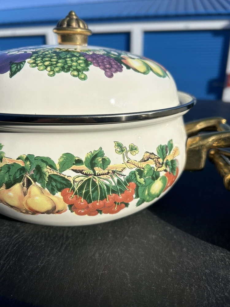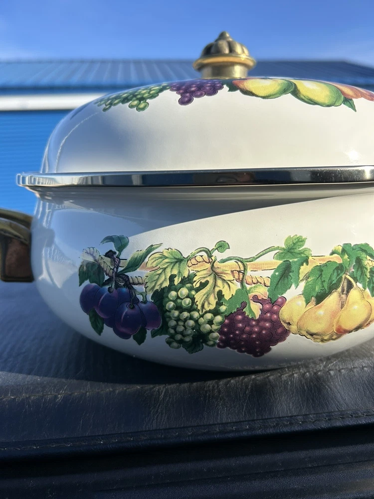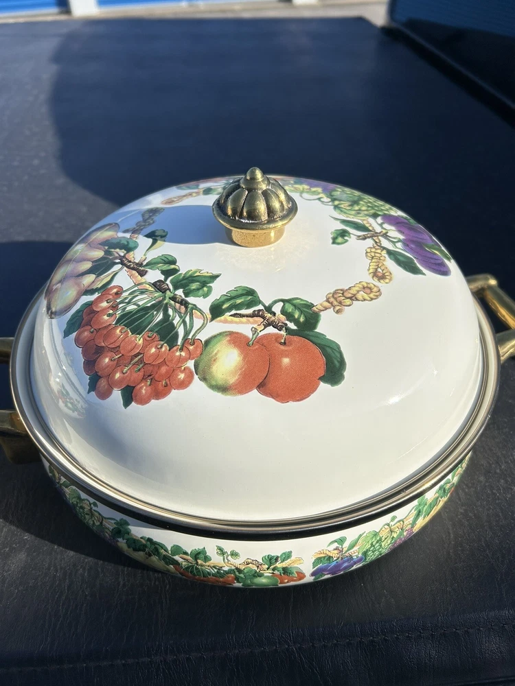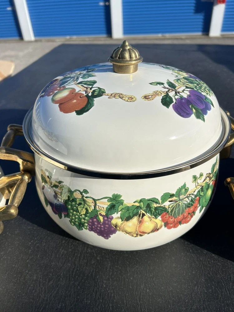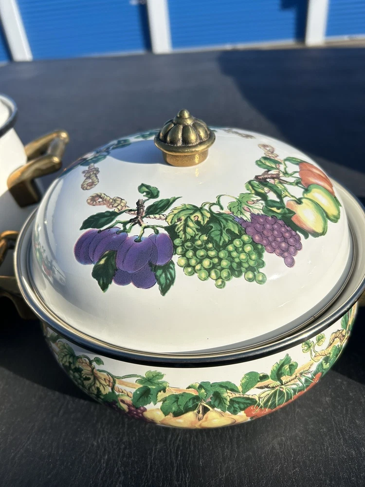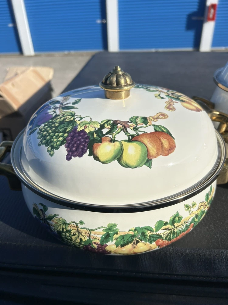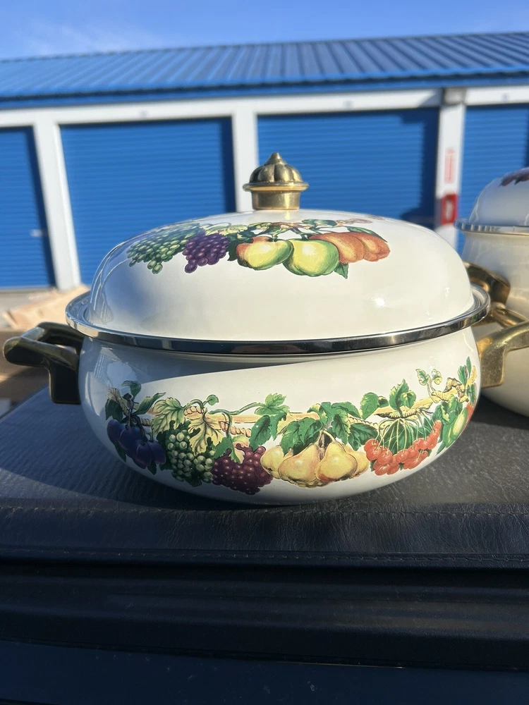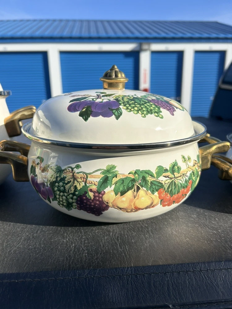 Comes with all 4 pots shown with their lids. All pots are new and unused only taken out of box to take pictures. Brass handles are old and have been sitting in box so may need some polishing. Any questions please ask