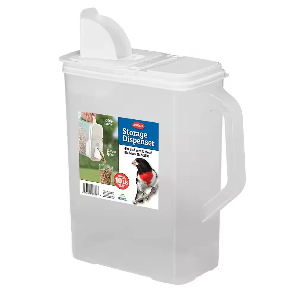 8 Qt Pet Food Bird Seed Storage Container and Dispenser with Spout Plastic Clear Enjoy the birds, but not the feeding. Make it fun and easy with this 8 qt. bird seed dispenser. The Flip Lid allows for scooping and the pour spout allows you to fill your feeders without mess and spilling. Keeps seed fresh and this combo handles all seed sizes. Best to store containers indoors because Squirrels are clever creatures. Buddeez is a proud manufacturer of durable and innovative storage products in the USA. 8 qt. dispenser makes dispensing wild bird feed or sunflower seeds easier Flip lid and pour spout make feeding fun and saves feeding the ground Keep seed in the original bag so brand and nutritional info is maintained or pour into container BPA free